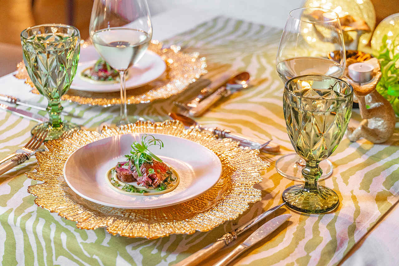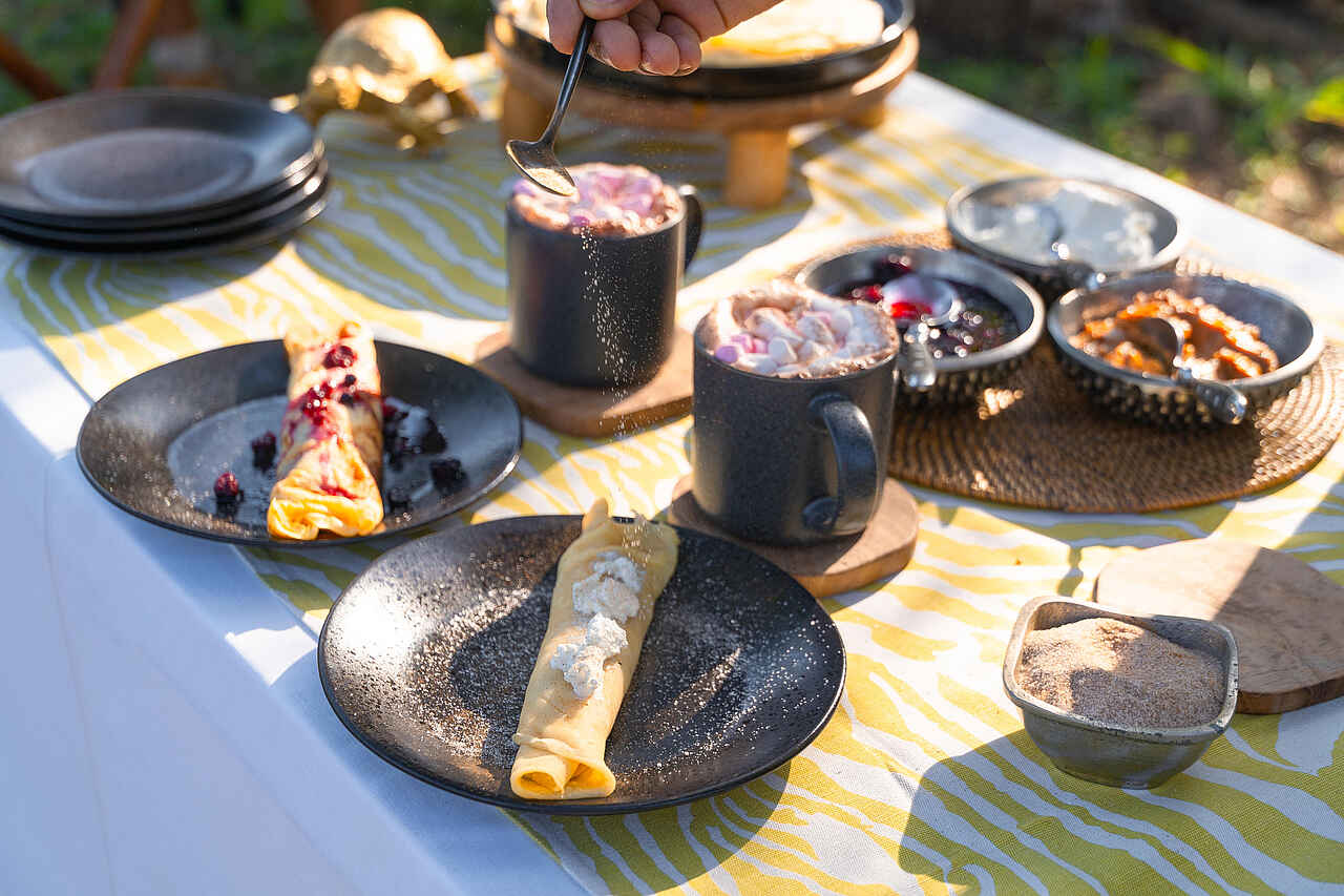 Alle Mahlzeiten sind im Aufenthalt enthalten und setzen auf frische Zutaten aus der Region. Der Tag startet mit einem üppigen Frühstück, mittags werden leichte Speisen serviert und abends erwartet die Gäste ein mehrgängiges Dinner mit kreativen Kreationen. Gegessen wird je nach Stimmung im stimmungsvollen Boma am Feuer, auf der Terrasse mit Blick in die Natur oder ganz entspannt unter einem alten Baum im Freien.
