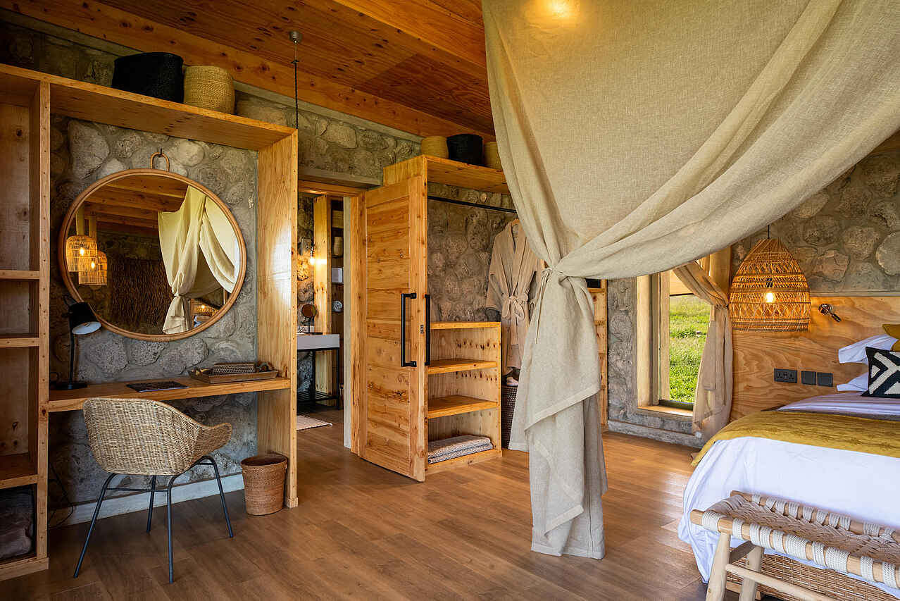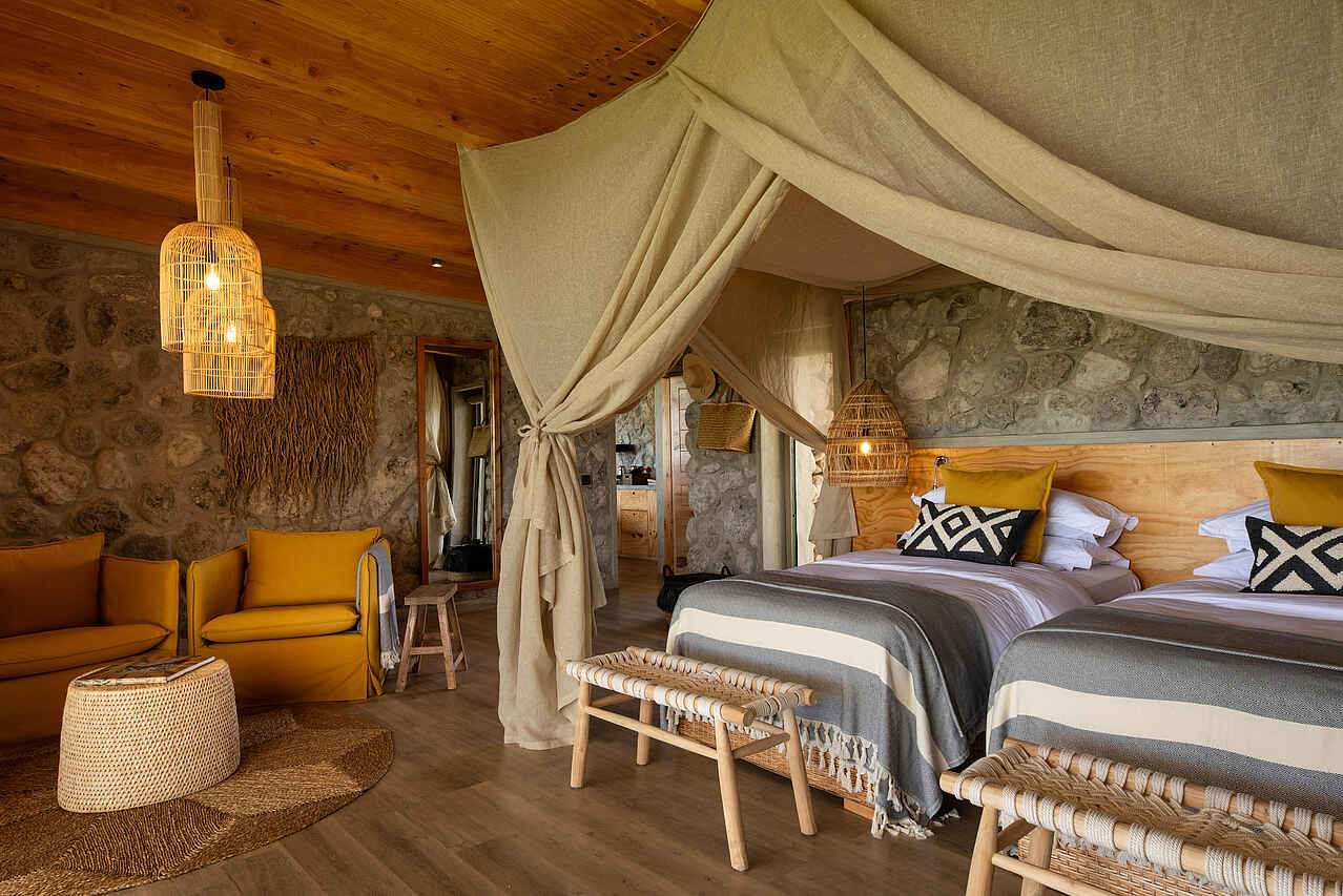 Die Retreats arbeiten wie eigenständige Mini-Camps und verfügen jeweils über private Lounge- und Essbereiche mit viel Tageslicht und direktem Blick in die Ebenen. Klare Linien und warme Naturmaterialien prägen das hochwertige Ambiente. Zwischen den beiden Villen liegt eine zusätzliche Loungearea mit Swimmingpool zur gemeinsamen Nutzung. Ein privates Serviceteam mit Host, Koch und Guide betreut Gäste exklusiv und ermöglicht maximale Flexibilität. Ergänzend stehen alle Einrichtungen des benachbarten Hauptcamps offen, darunter Spa, Bar, Boma, Swimmingpool und mehrere Loungebereiche.