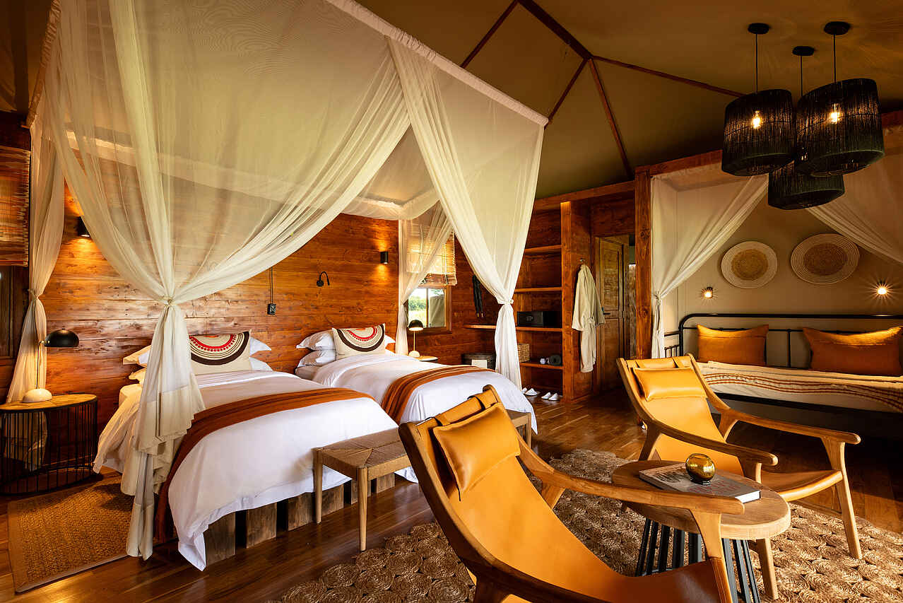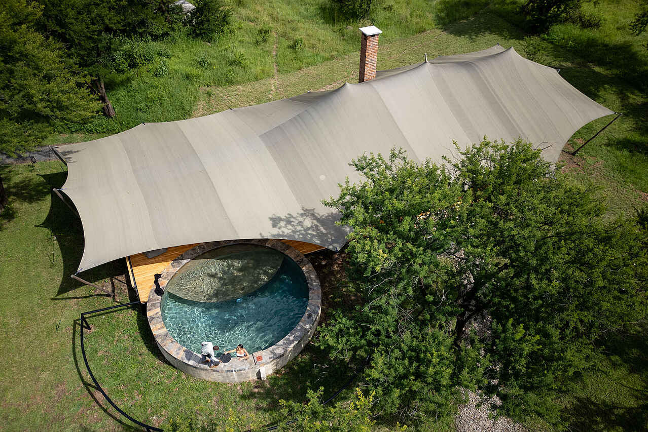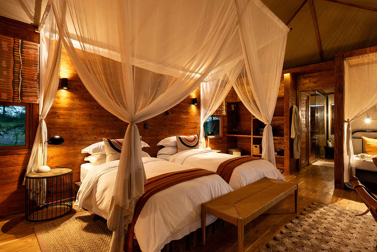 Zwischen beiden Retreats liegt ein Swimmingpool mit Liegeflächen sowie eine zusätzliche Lounge mit eigenem Speisebereich. Zu jedem Haus gehören ein persönlicher Host, ein eigener Koch, ein privates Safari-Fahrzeug und ein erfahrener Guide. Ergänzend stehen alle Einrichtungen des benachbarten Hauptcamps zur Verfügung, darunter Spa, Bar, Boma, Swimmingpool und mehrere Loungebereiche.