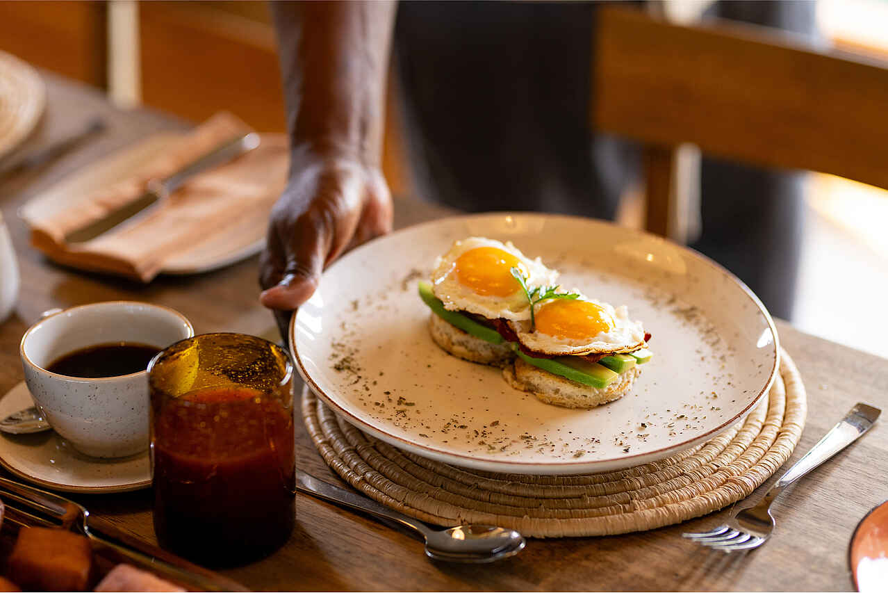 Gäste der Retreats genießen ein privates Dining-Konzept mit eigenem Koch, der alle Mahlzeiten individuell zubereitet. Gegessen wird im offen gestalteten Essbereich oder auf der Terrasse, alternativ auch im Hauptcamp, wenn ein Ortswechsel gewünscht ist. Die Küche setzt auf frische Zutaten und regionale Einflüsse und serviert mehrgängige Menüs, die geschmacklich klar und hochwertig ausgerichtet sind. Vegetarische, vegane oder glutenfreie Wünsche werden flexibel umgesetzt. Wasser, Softdrinks, Bier, lokale Weine und ausgewählte Spirituosen sind inklusive. Das Zusammenspiel aus privatem Service, flexiblen Essenszeiten und einer ruhigen, persönlichen Atmosphäre sorgt für ein hochwertiges kulinarisches Erlebnis während des gesamten Aufenthalts.