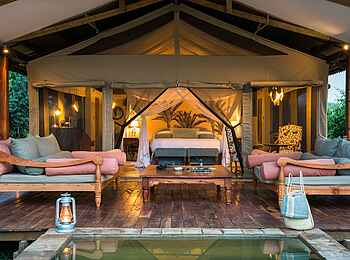 Der offene Hauptbereich der Lodge kombiniert Lounge, Restaurant und Bar unter einem lichtdurchfluteten Pavillon mit weitem Blick auf den Kazinga-Kanal. Warme Naturmaterialien, handgefertigte Möbel und dezente Details schaffen eine stilvolle, entspannte Atmosphäre. Auf der Terrasse laden gemütliche Sitzgruppen zum Verweilen ein, während im Restaurant frisch zubereitete Speisen serviert werden. Ein Infinity-Pool am Hang sowie eine kleine Spa-Einrichtung und eine Bibliothek runden das Angebot ab.