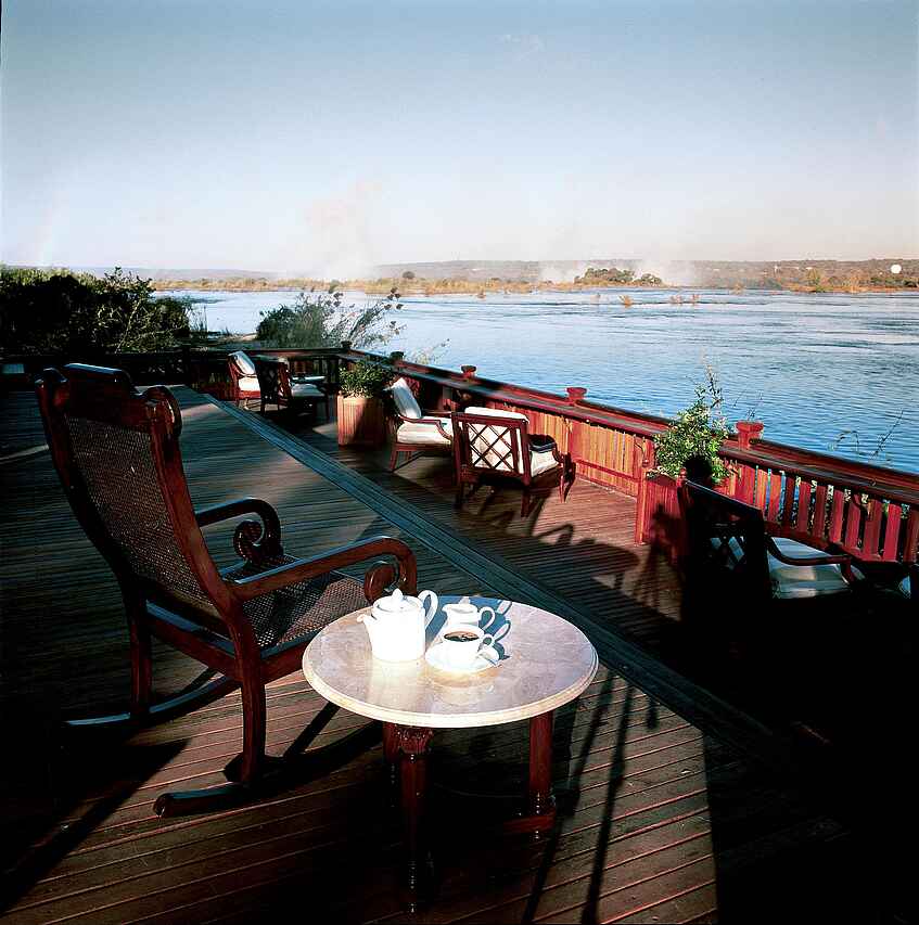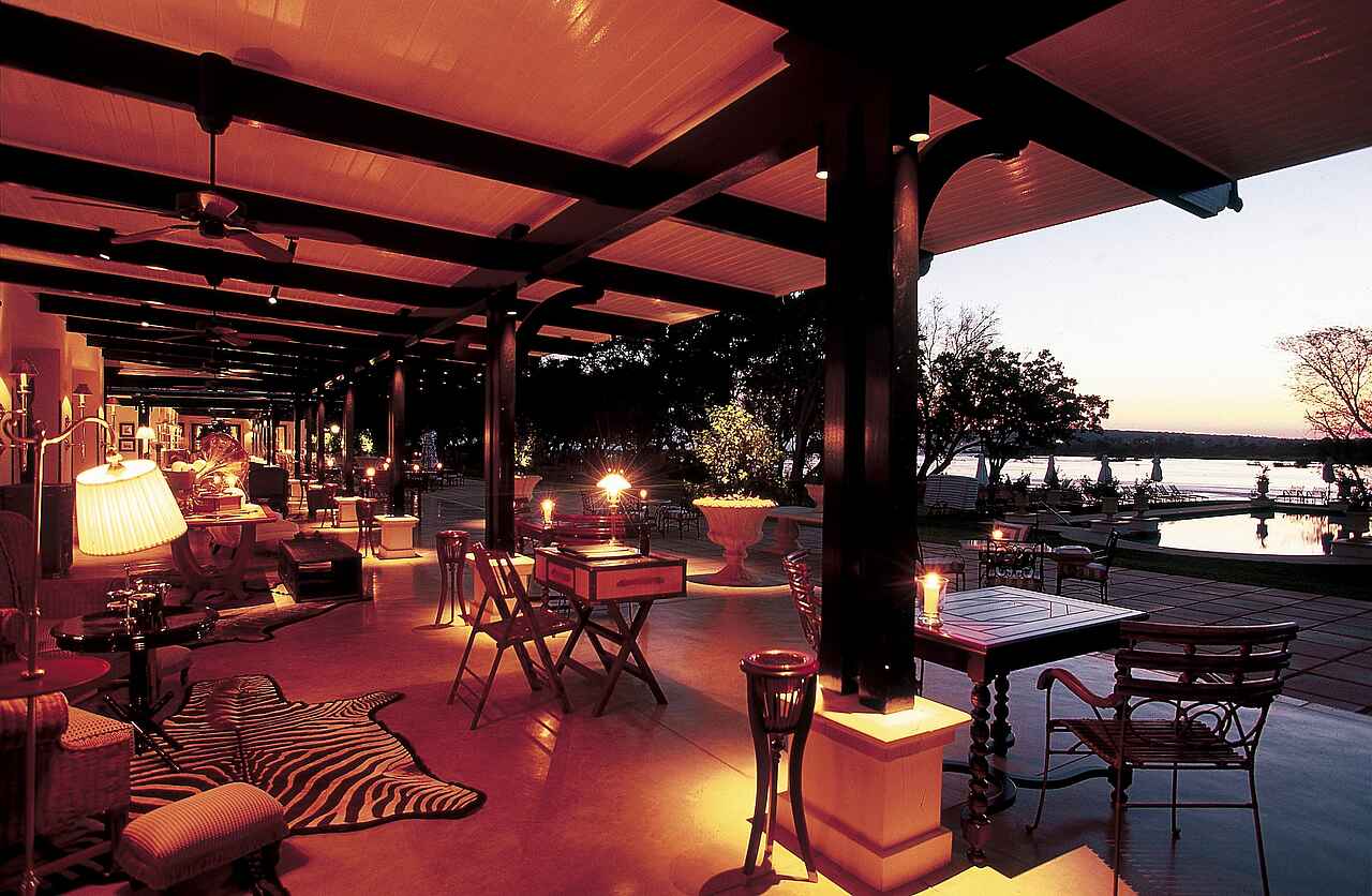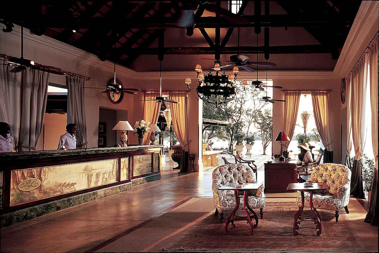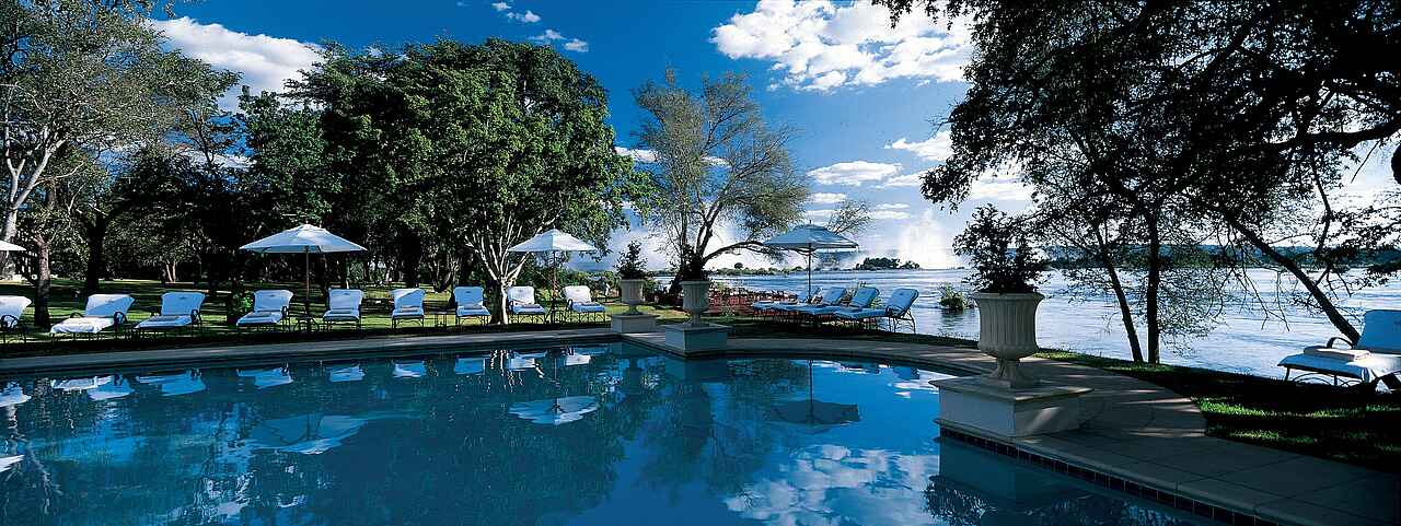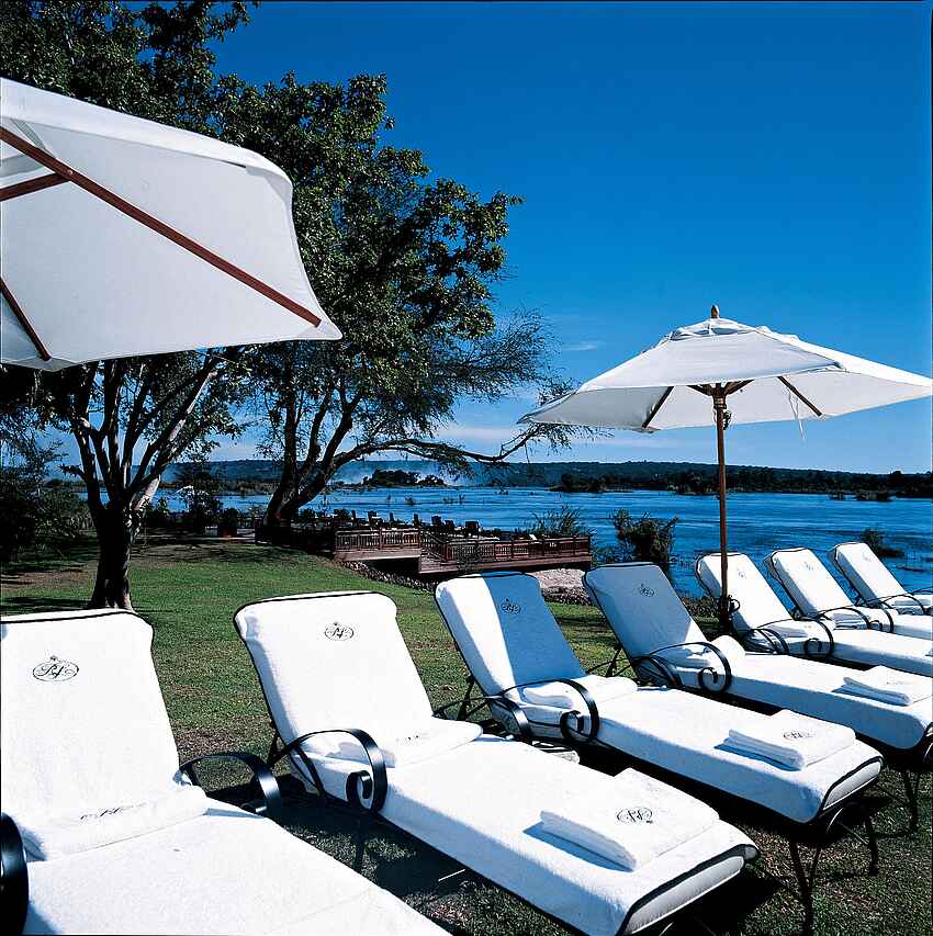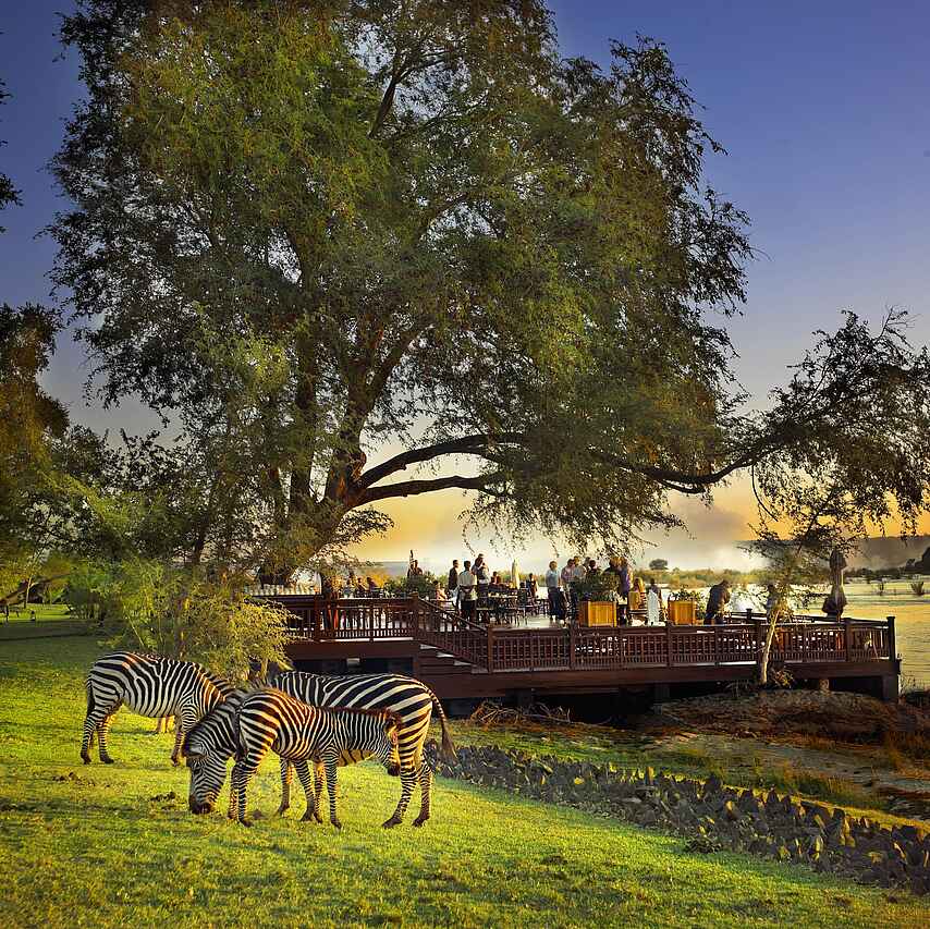 The Royal Livingstone hat die vielleicht beste Lage aller Unterkünfte und Hotels in Livingstone - direkt an den Wasserfällen. Kolonial-stilvolles und luxuriöses Ambiente an einem der sieben Weltnaturwunder. Ein privater Zugang auf dem Hotelgelände erlaubt den Gästen unbeschränkten und kostenlosen Zutritt zu den Fällen. Durch die Lage innerhalb des Mosi-oa-Tunya Nationalparks ist das Hotelareal Heimat freilaufender Zebras, Giraffen und Affen und selbst Nilpferde und Elefanten können von den spektakulär am Flussufer gelegenen Sonnendecks beobachtet werden.