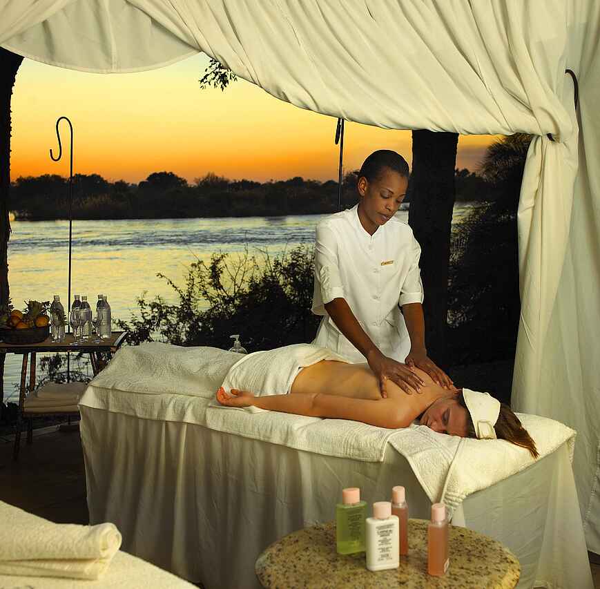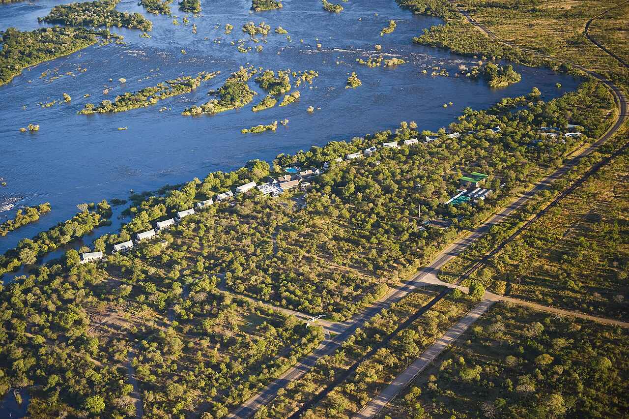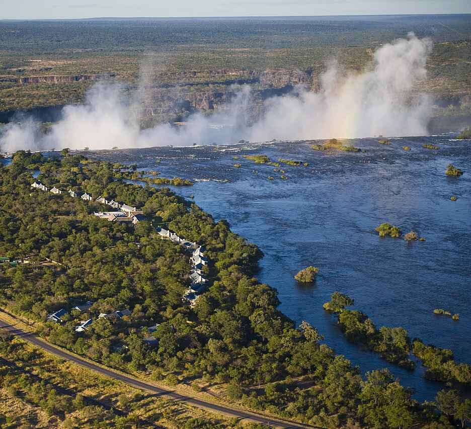 Am Ufer des Sambesi etwas außerhalb von Livingstone, Sambia, gelegen. Einmalig mit Blick auf die Gischt der Viktoriafälle, eines der sieben Weltwunder. Mosi-oa-Tunya-Nationalpark fußläufig erreichbar.
