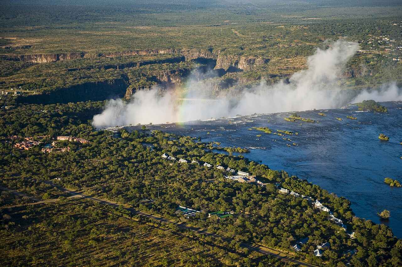 Besondere Tiervielfalt im Mosi-oa-Tunya National Park mit Breitmaulnashörnern, Antilopen, Giraffen, Zebras, Büffeln, Elefante. Nilpferde, Krokodile, Wasservögel entlang des Sambesi. Das sehr feuchte Ökosystem in unmittelbarer Nachbarschaft der Wasserfälle ist bemerkenswert für seine in dieser Region ansonsten sehr seltenen Pflanzenarten.