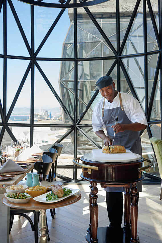 Direkt am Hafen an der V&A Waterfront steht der ehemalige Getreidespeicher mit seinem Aufzug, die heute das Zeitz MOCAA in den unteren sechs Stockwerken und The Silo in den oberen beherbergen. Die großen, gewölbten Fenster lassen den Blick in alle Richtungen über die Stadt und den Tafelberg zu.