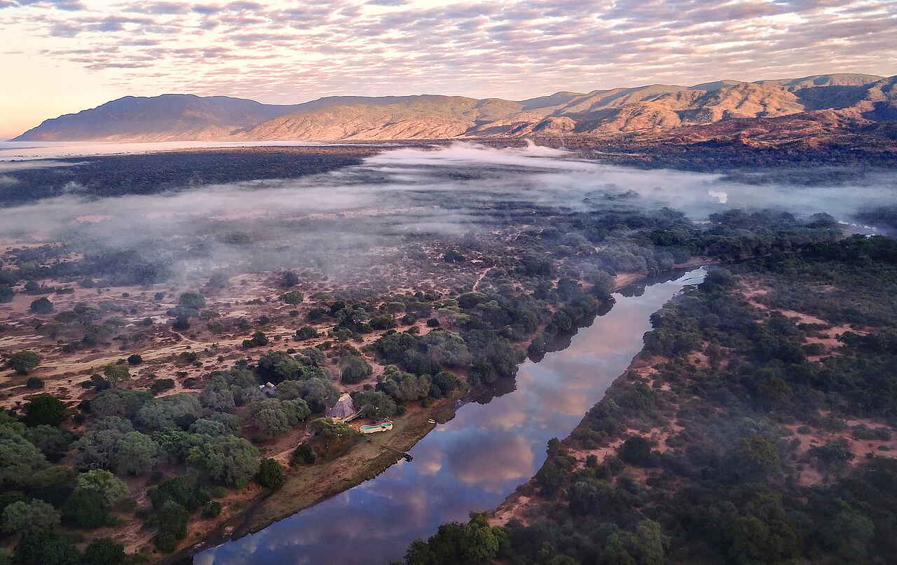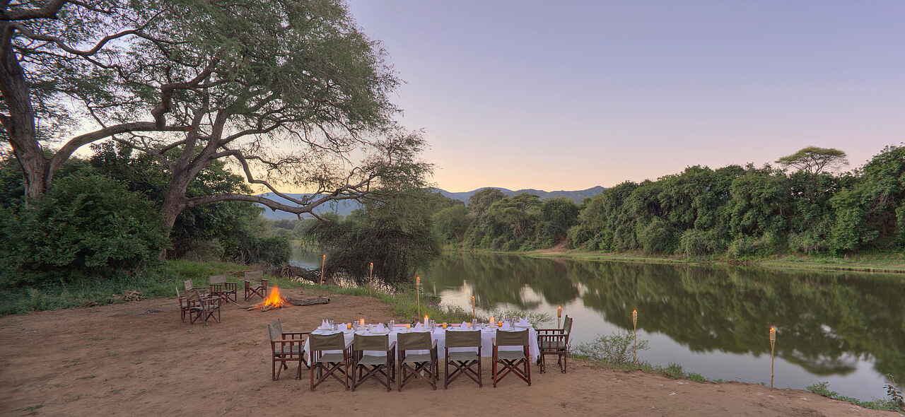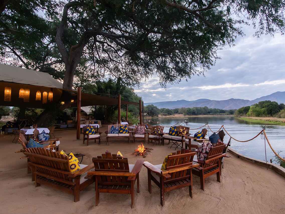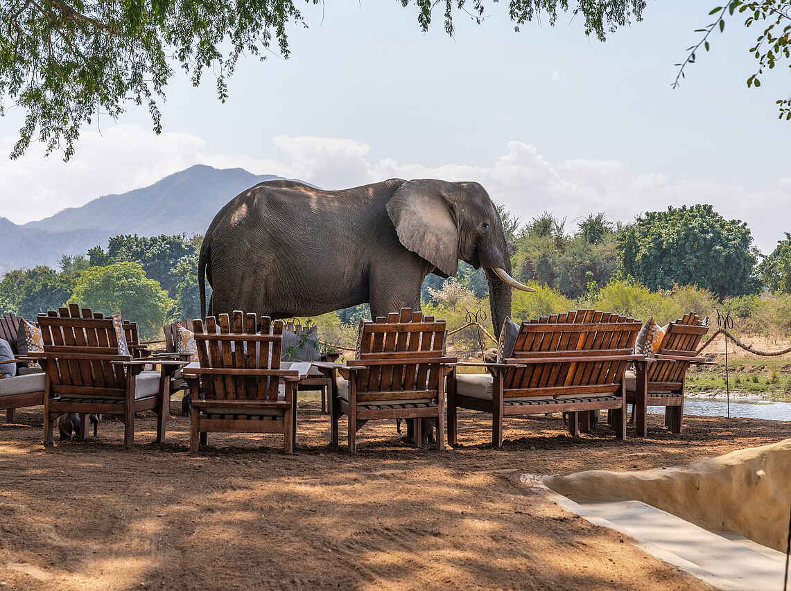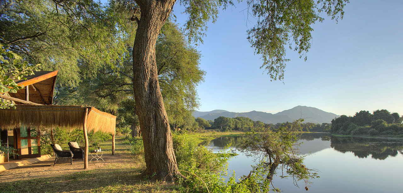 Sambia. Am Zusammenfluss der Flüsse Chongwe und Sambesi vor der Kulisse des Sambesi-Escarpments. An der Grenze des Lower Zambezi National Park inmitten von bezaubernder Fauna: Auen, Dickicht und Baumriesen. In der Nachbarschaft die Schwestercamps Tsika Island und Kasaka River Lodge.