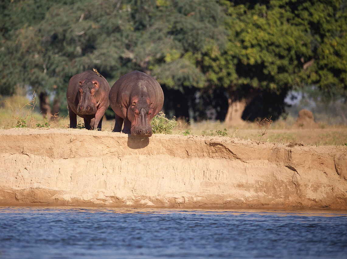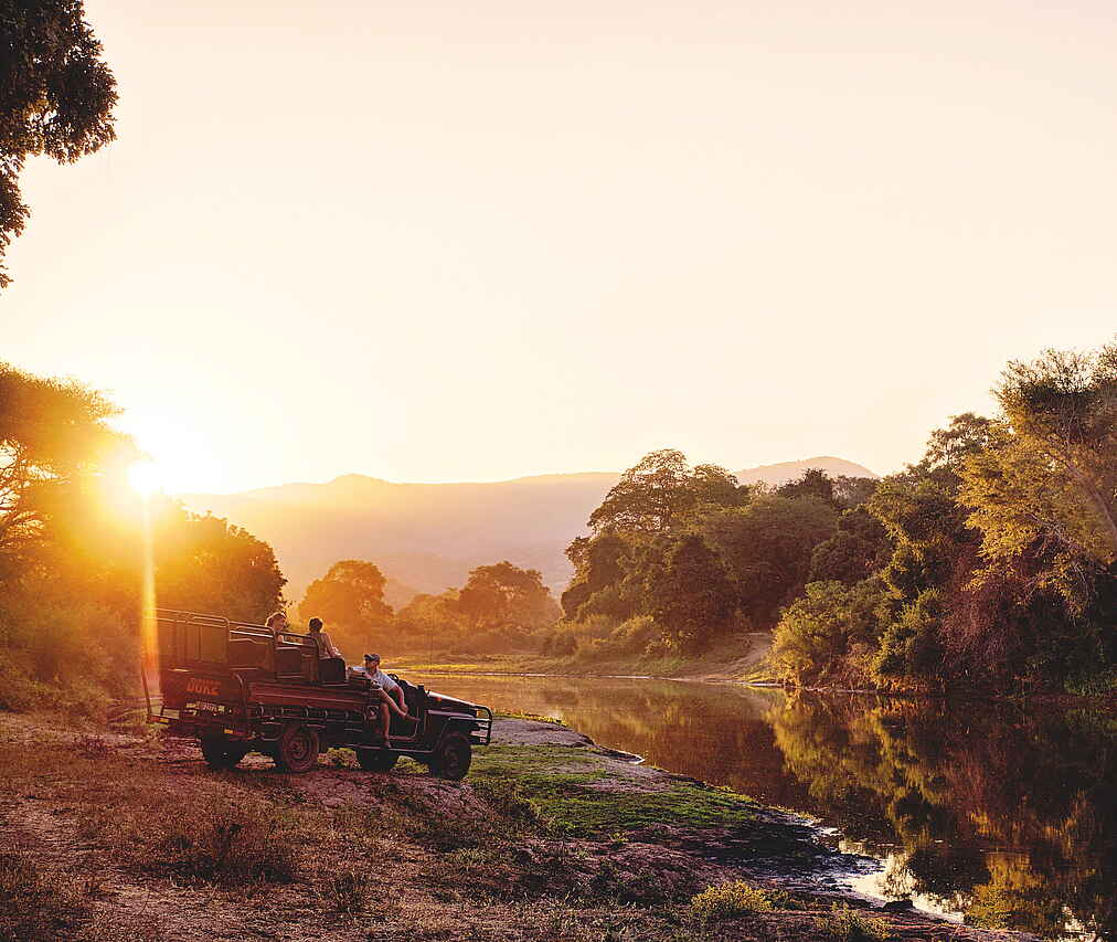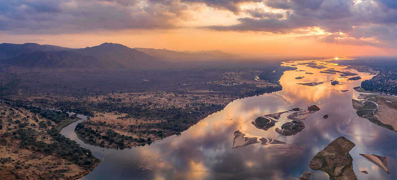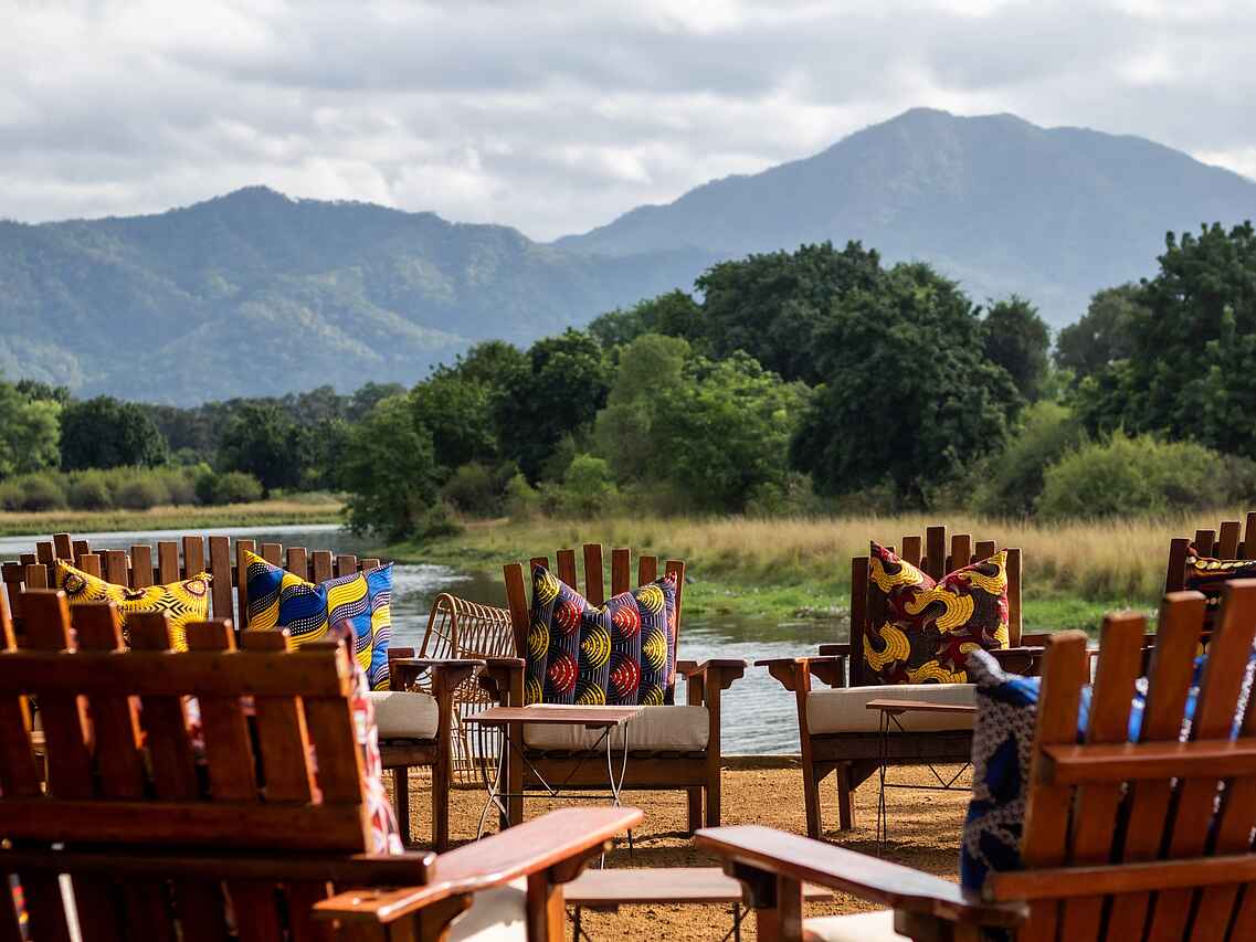 Sambia. Am Zusammenfluss der Flüsse Chongwe und Sambesi vor der Kulisse des Sambesi-Escarpments. An der Grenze des Lower Zambezi National Park inmitten von bezaubernder Fauna: Auen, Dickicht und Baumriesen. In der Nachbarschaft die Schwestercamps Tsika Island und Kasaka River Lodge.