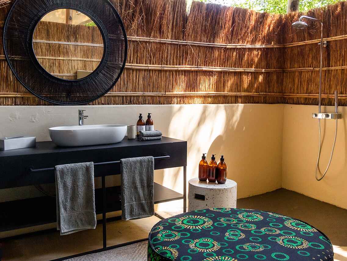 In den Zelten gibt es entweder ein Kingsize-Bett oder zwei Betten. Außerdem ein großes, nach oben offenes Badezimmer (Dusche, WC, Waschbecken) und eine eigene Veranda. Alles ist sehr weitläufig angelegt und aus Naturmaterialien gefertigt. Die angenehmen Beige- und Brauntönen und die spielerischen Anlage mit Steinen und Baumstämmen aus der Umgebung vermitteln das Gefühl, bei den Hobbits gelandet zu sein. Alles ist auf einer Ebene und man kann sich auch direkt mit dem Liegestuhl an den Fluss setzen.