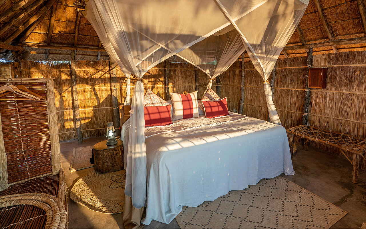 Die 4 privaten Chalets unterscheiden sich leicht voneinander und bestehen baulich zum größten Teil aus Schilfrohr und Gras. Zimmer verfügen über 2 Einzel- oder Doppelbetten, Garderobe und Kommode für Gepäck aus Holz und Schilf. Das größere Honeymoon Chalet befindet sich etwas abseits des Camps, mit privater Terrasse und Essbereich. Alle En-Suite Badezimmer liegen unter freiem Himmel und sind sehr geräumig, ausgestattet mit Toilette und Dusche. Kalt- sowie Warmwasser ganzen Tag über verfügbar. Keine Elektrizität, die Schlafzimmer und Badezimmer werden mit Solarlaternen beleuchtet.