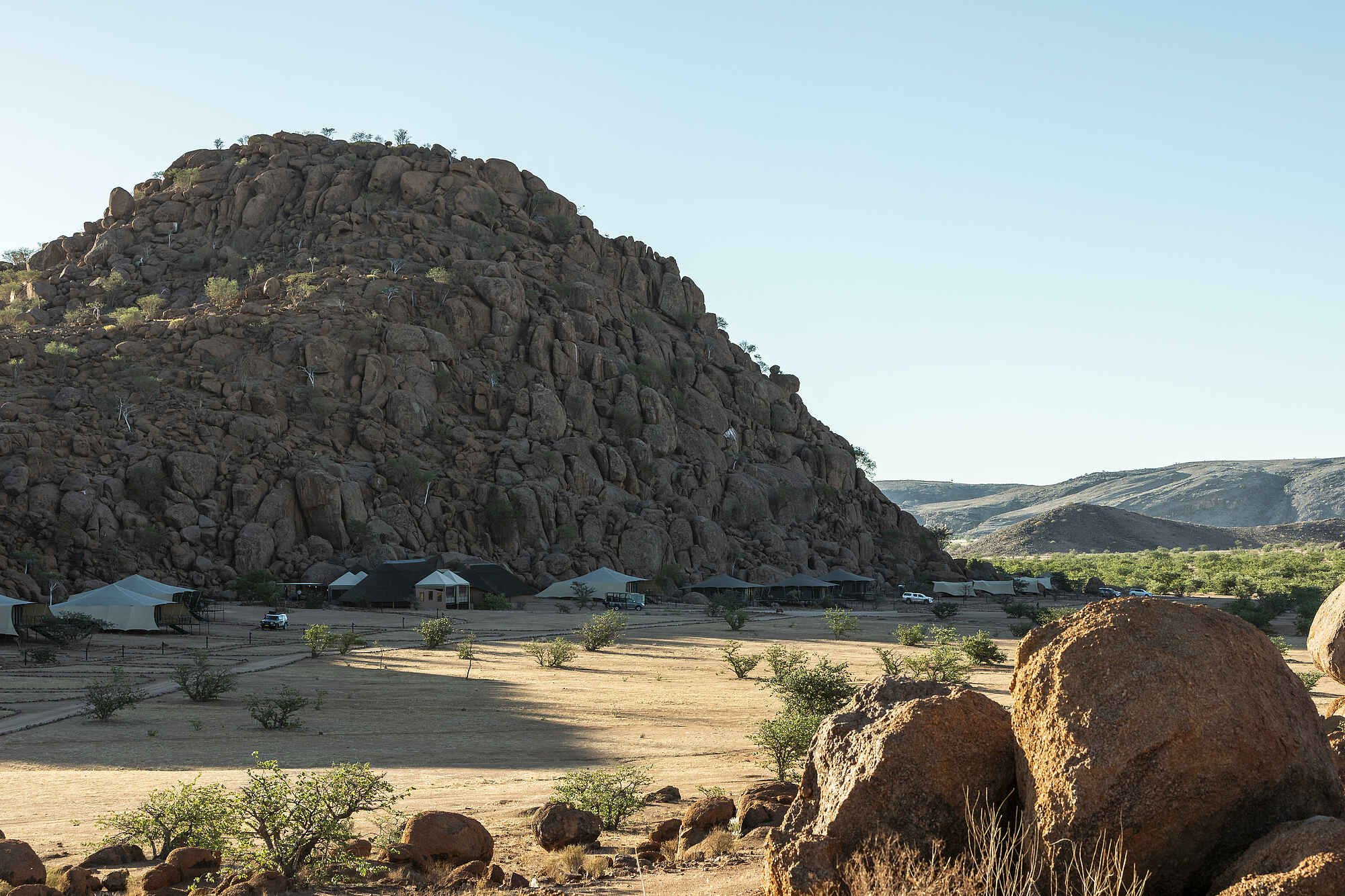 Das Camp liegt im Damaraland, im Nordwesten Namibias, rund 15 Kilometer von der weltbekannten Fundstelle Twyfelfontein entfernt. Die Umgebung ist geprägt von rötlichen Felsformationen, Trockenflüssen und weitläufigem Buschland. Die zentrale Lage zwischen Etosha-Nationalpark und Skeleton Coast macht es zu einem beliebten Zwischenstopp.