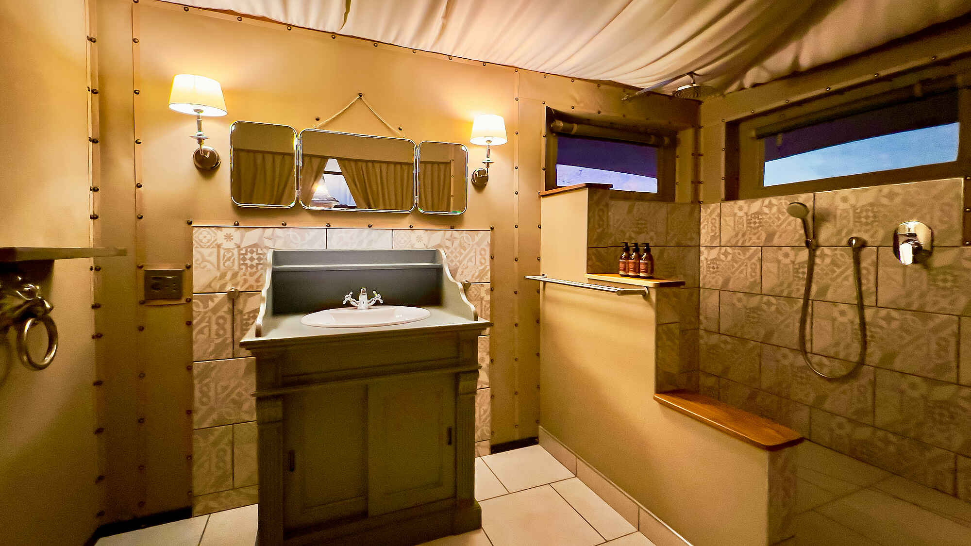 Die 24 Gästeunterkünfte des Twyfelfontein Adventure Camps teilen sich in 12 Standardzelte und 12 etwas großzügiger geschnittene Premiumzelte. Beide Kategorien stehen auf erhöhten Holzplattformen und sind mit robusten Leinenwänden, Zeltdach und großen Fensteröffnungen mit Moskitonetzen ausgestattet. Die Einrichtung ist schlicht und funktional mit Doppel- oder Einzelbetten, Nachttischen, Sitzgelegenheit und Ablageflächen. Jedes Zelt verfügt über ein En-suite-Badezimmer mit Dusche, Waschbecken, WC und solarbeheiztem Wasser. Handtücher sind vorhanden. Die Atmosphäre ist offen, naturnah und luftig, mit Blick ins umliegende Buschland. Ideal für Reisende, die die Landschaft des Damaralandes unmittelbar erleben möchten, ohne auf grundlegenden Komfort zu verzichten.