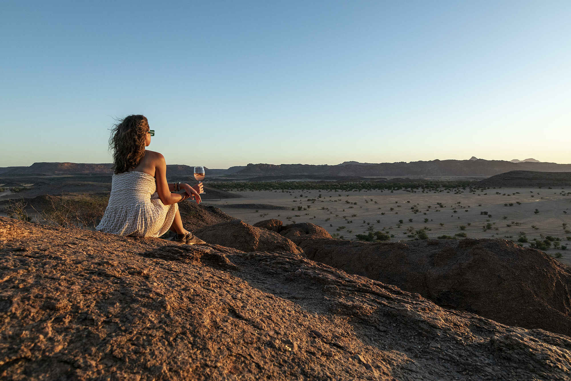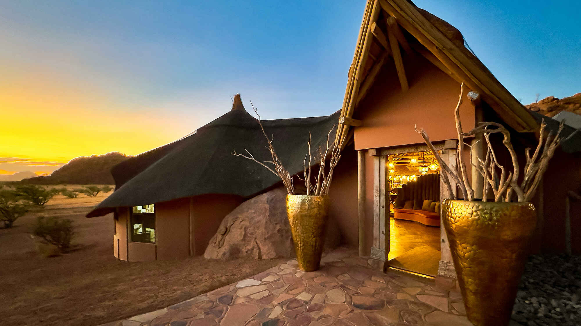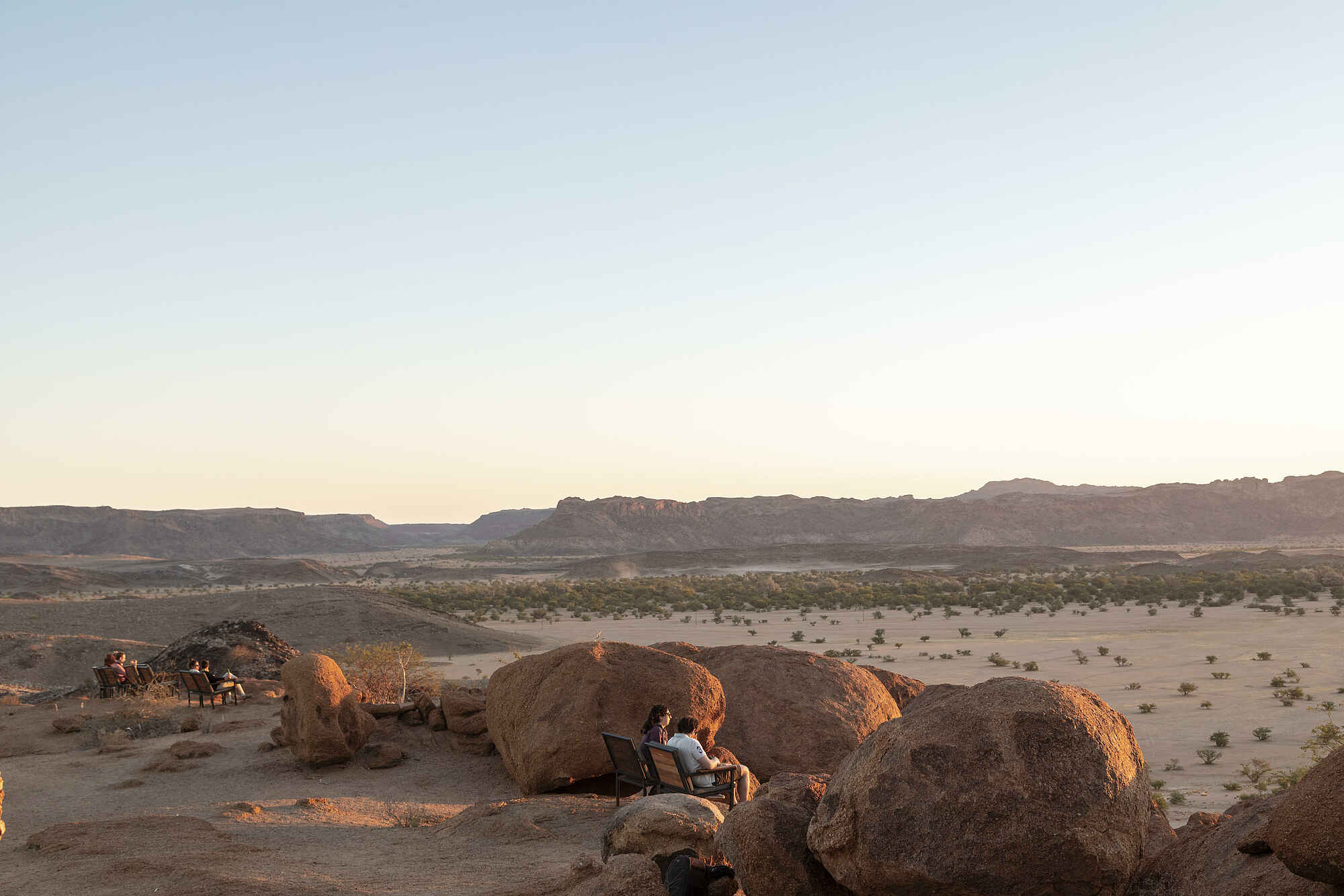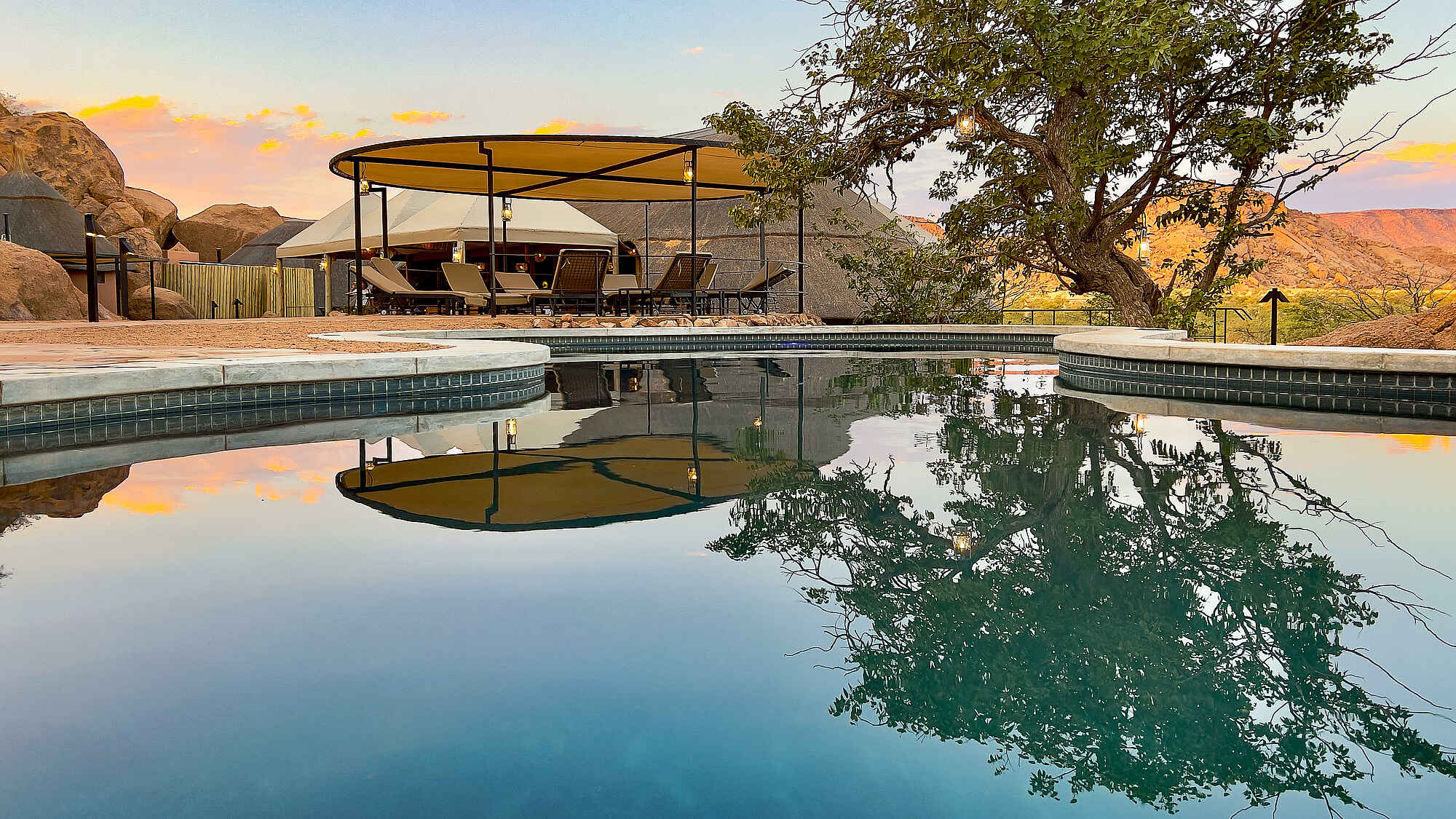 Der zentrale Bereich des Camps thront auf einer Anhöhe und eröffnet weite Ausblicke auf die Hügel des Damaralandes. Unter einem luftigen Holzpavillon mit Zeltwänden liegen Restaurant und Bar, gestaltet mit rustikalen Holzmöbeln, bunten Stoffen und handgefertigter Dekoration aus der Region. Nach Sonnenuntergang versammeln sich die Gäste am knisternden Lagerfeuer unter freiem Himmel. Tagsüber sorgen zwei Swimmingpools mit Holzdeck für wohltuende Abkühlung, besonders nach Ausflügen durch die weite Halbwüstenlandschaft. WLAN steht in den Gemeinschaftsbereichen eingeschränkt zur Verfügung.
