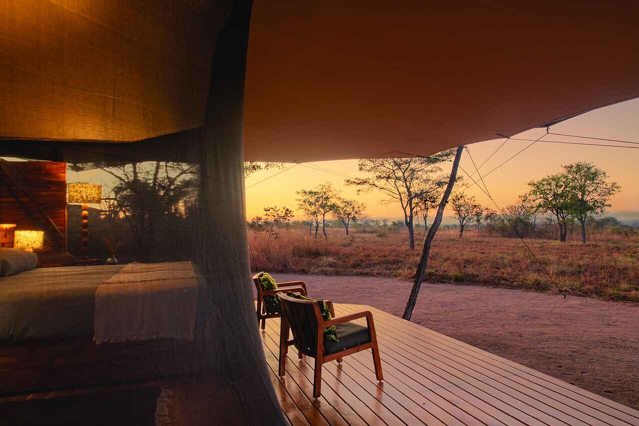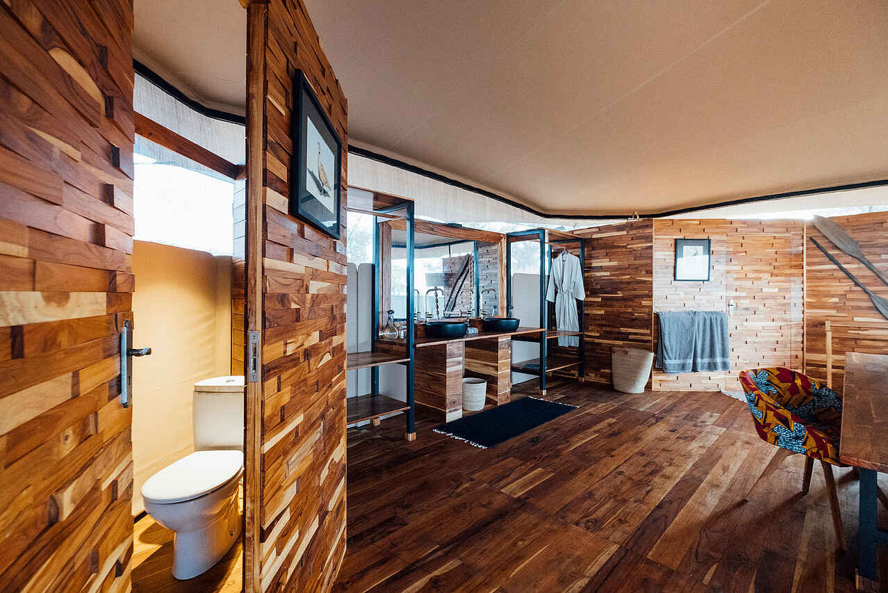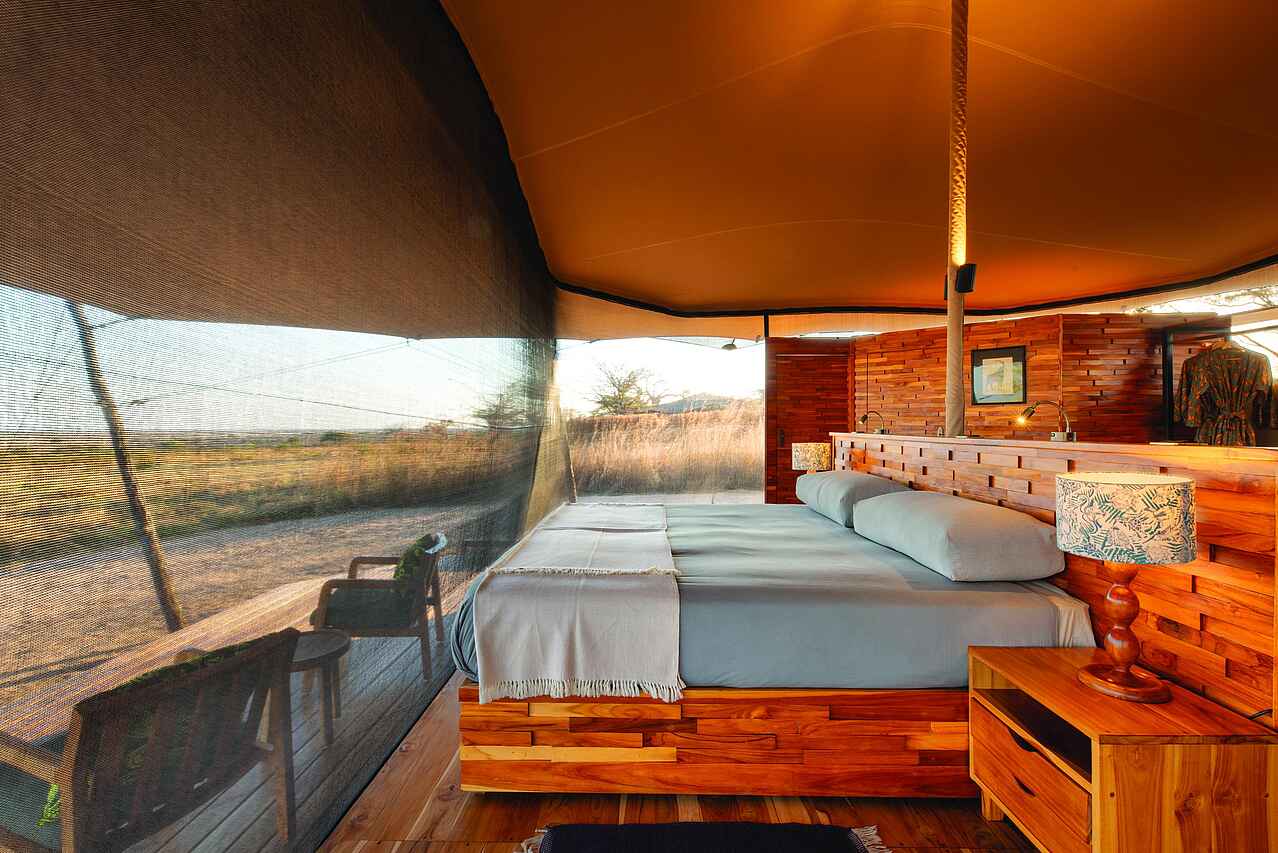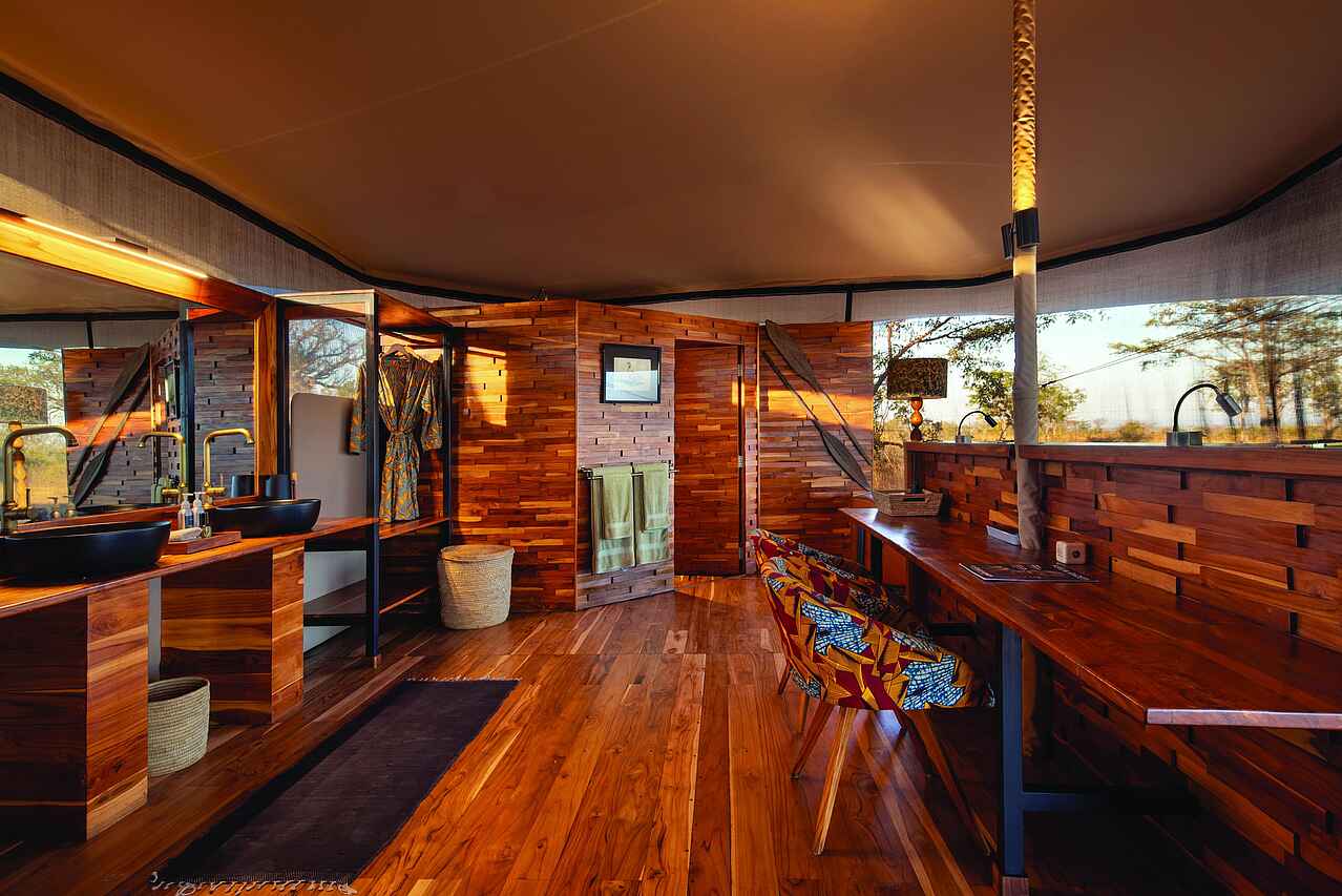 Die sechs Zeltsuiten sind komfortabel gestaltet und bieten ein klares, funktionales Design mit Fokus auf praktischem Safari-Komfort. Jedes Zelt verfügt über ein großes Doppelbett oder zwei Einzelbetten mit Moskitonetz, eine Sitzgelegenheit sowie ausreichend Stauraum für Gepäck und Fotoausrüstung. Die Zelte öffnen sich über Reißverschlusstüren zur privaten Veranda mit Blick in die weite Savanne. Das En-suite-Badezimmer umfasst eine Dusche, ein Waschbecken, eine Spültoilette sowie Handtücher und Pflegeprodukte. Trinkwasser und eine Basisstation für Kamera-Akkus stehen zur Verfügung.