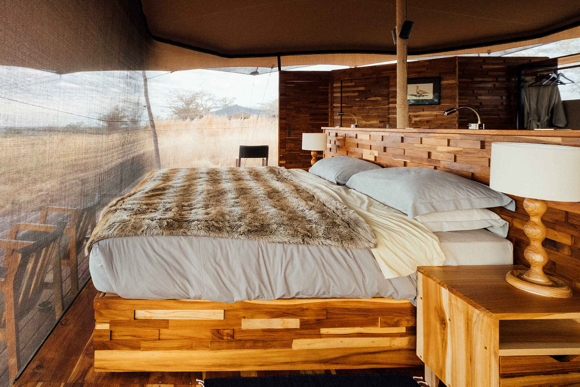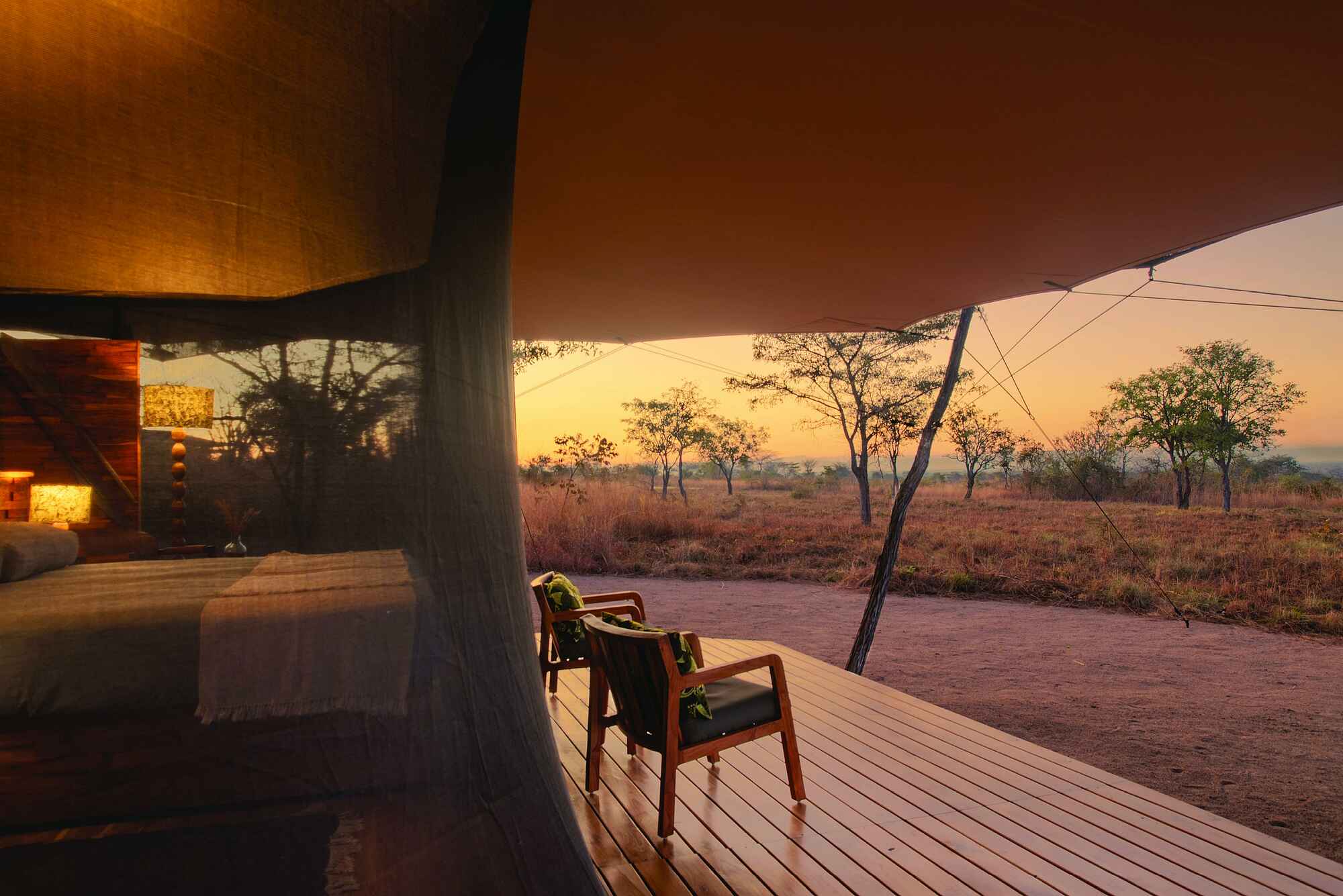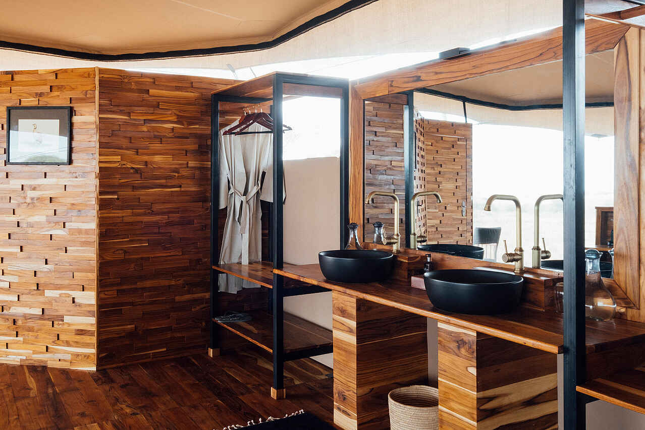 Die sechs Zeltsuiten sind komfortabel gestaltet und bieten ein klares, funktionales Design mit Fokus auf praktischem Safari-Komfort. Jedes Zelt verfügt über ein großes Doppelbett oder zwei Einzelbetten mit Moskitonetz, eine Sitzgelegenheit sowie ausreichend Stauraum für Gepäck und Fotoausrüstung. Die Zelte öffnen sich über Reißverschlusstüren zur privaten Veranda mit Blick in die weite Savanne. Das En-suite-Badezimmer umfasst eine Dusche, ein Waschbecken, eine Spültoilette sowie Handtücher und Pflegeprodukte. Trinkwasser und eine Basisstation für Kamera-Akkus stehen zur Verfügung.