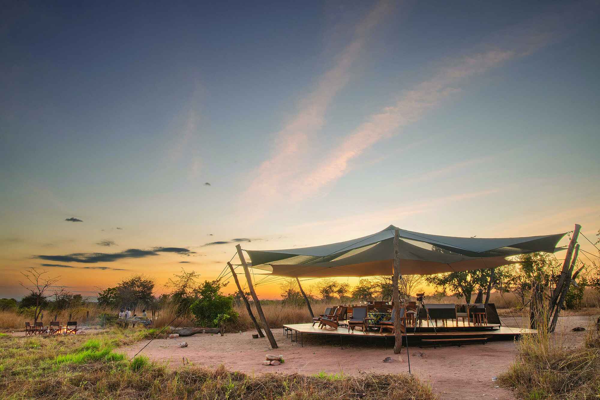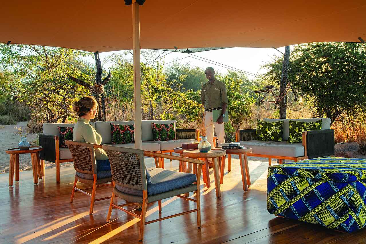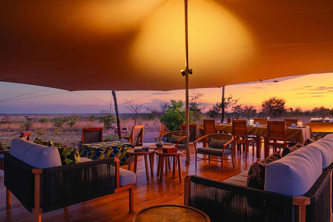 Die Gemeinschaftsbereiche des Usangu Expedition Camp sind offen gestaltet und liegen unter schattenspendenden Zeltdächern. Die Lounge bietet bequeme Sitzmöglichkeiten, einen großen Holztisch und eine kleine Bibliothek mit Literatur über Ruaha und die Usangu Wetlands. Der zentrale Essbereich schafft Raum für gemeinsame Mahlzeiten und Austausch nach den Aktivitäten. Abends wird die Boma zum natürlichen Treffpunkt, an dem die Erlebnisse des Tages in ruhiger Atmosphäre geteilt werden. Das Camp setzt auf eine leichte, funktionale Struktur, die gut zur Umgebung passt und den Fokus klar auf Naturerlebnis und Erholung legt.