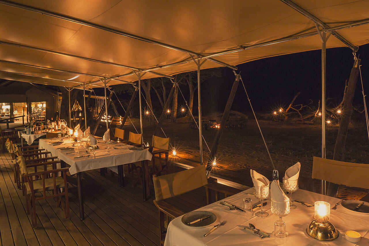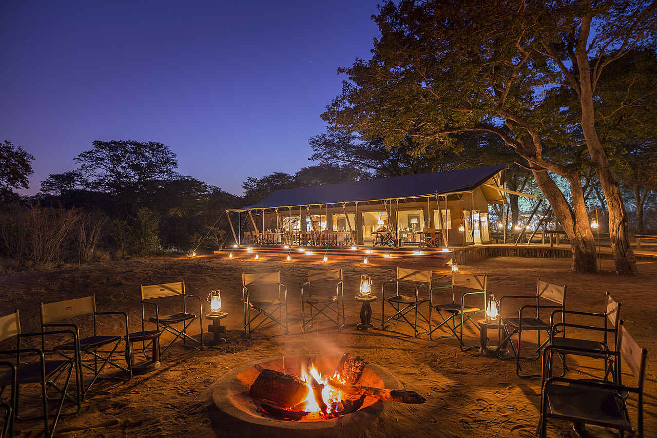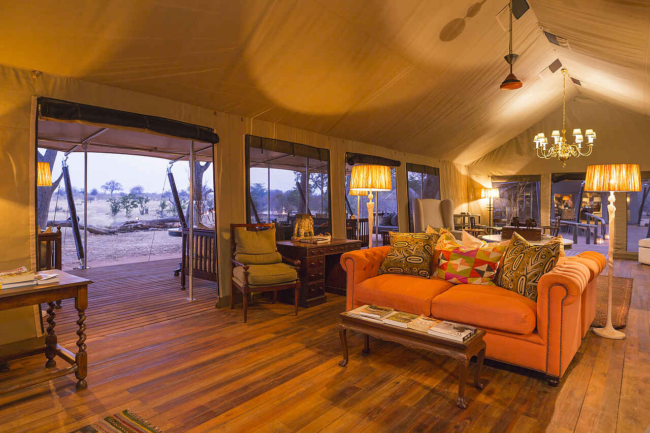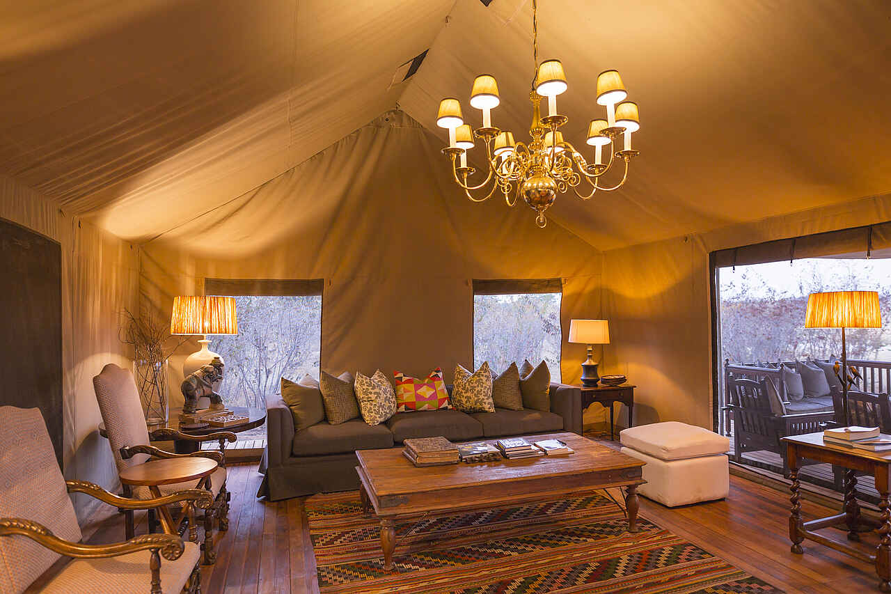 Luxuriöses Zeltcamp mit geschmackvoller landestypischer Einrichtung. Zentraler Bereich mit Bar, Restaurant und Sitzmöglichkeiten und einer Feuerstelle unter freiem Himmel. Das Highlight des Camps ist eine Wasserstelle, wo man direkt vom Deck des Hauptzeltes Tiere beobachten kann.