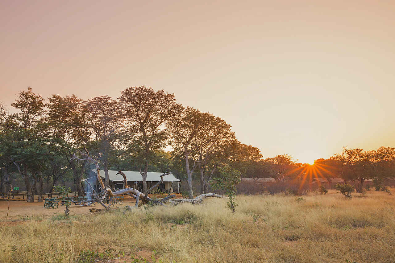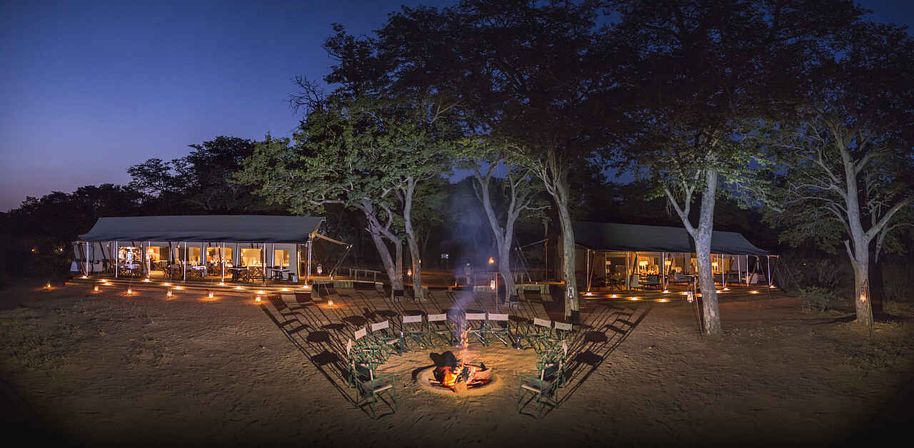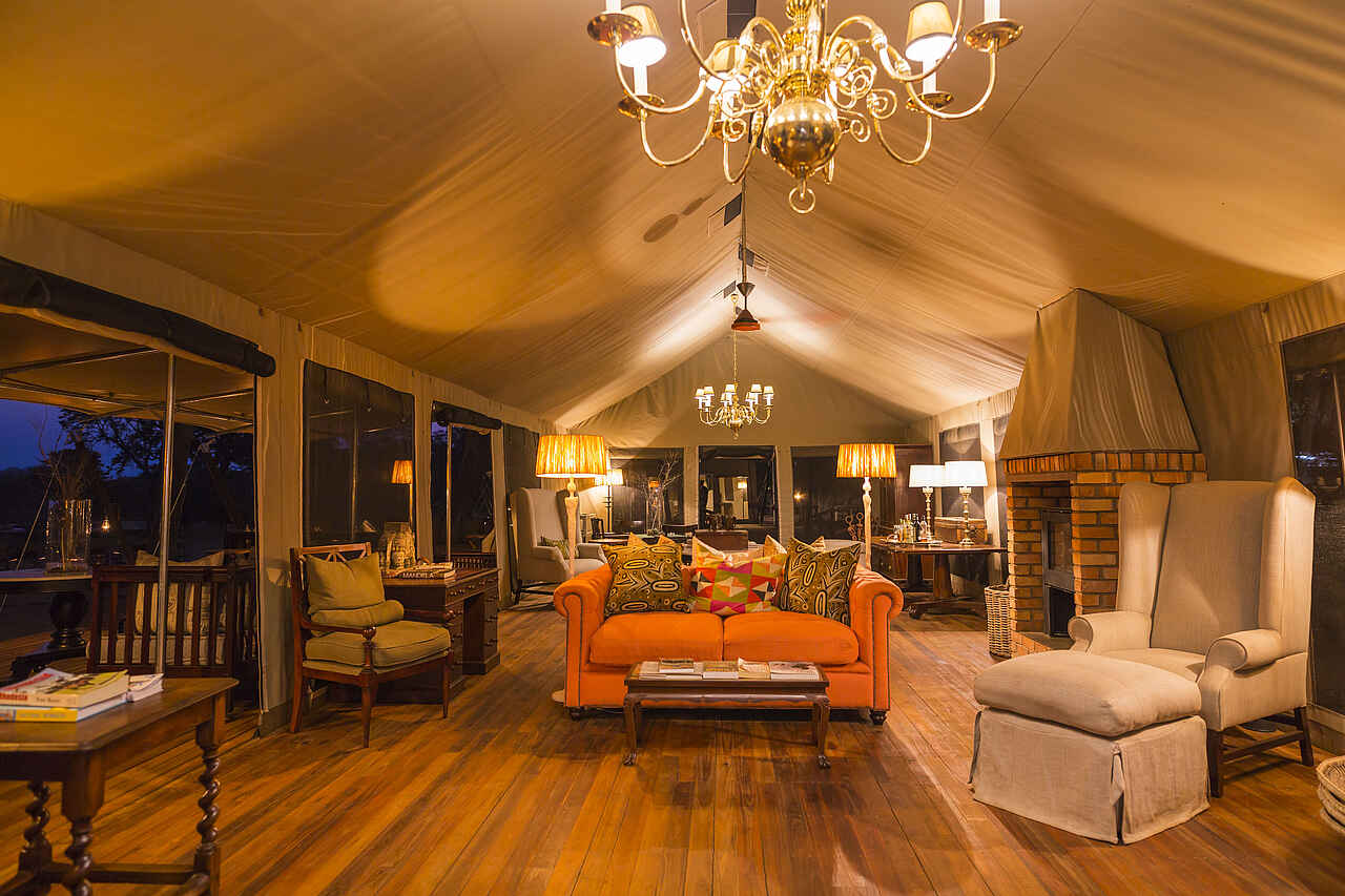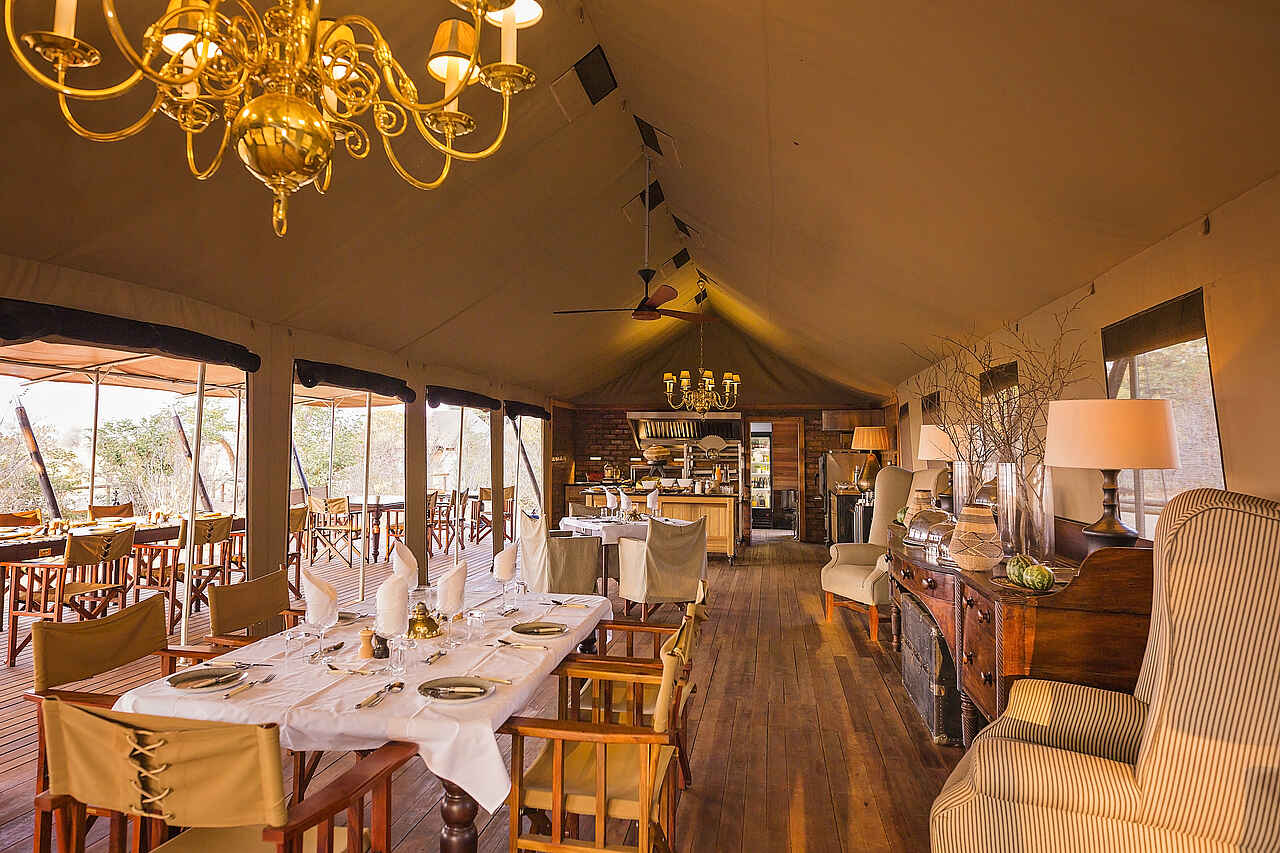 Luxuriöses Zeltcamp mit geschmackvoller landestypischer Einrichtung. Zentraler Bereich mit Bar, Restaurant und Sitzmöglichkeiten und einer Feuerstelle unter freiem Himmel. Das Highlight des Camps ist eine Wasserstelle, wo man direkt vom Deck des Hauptzeltes Tiere beobachten kann.