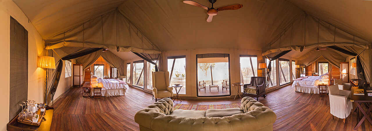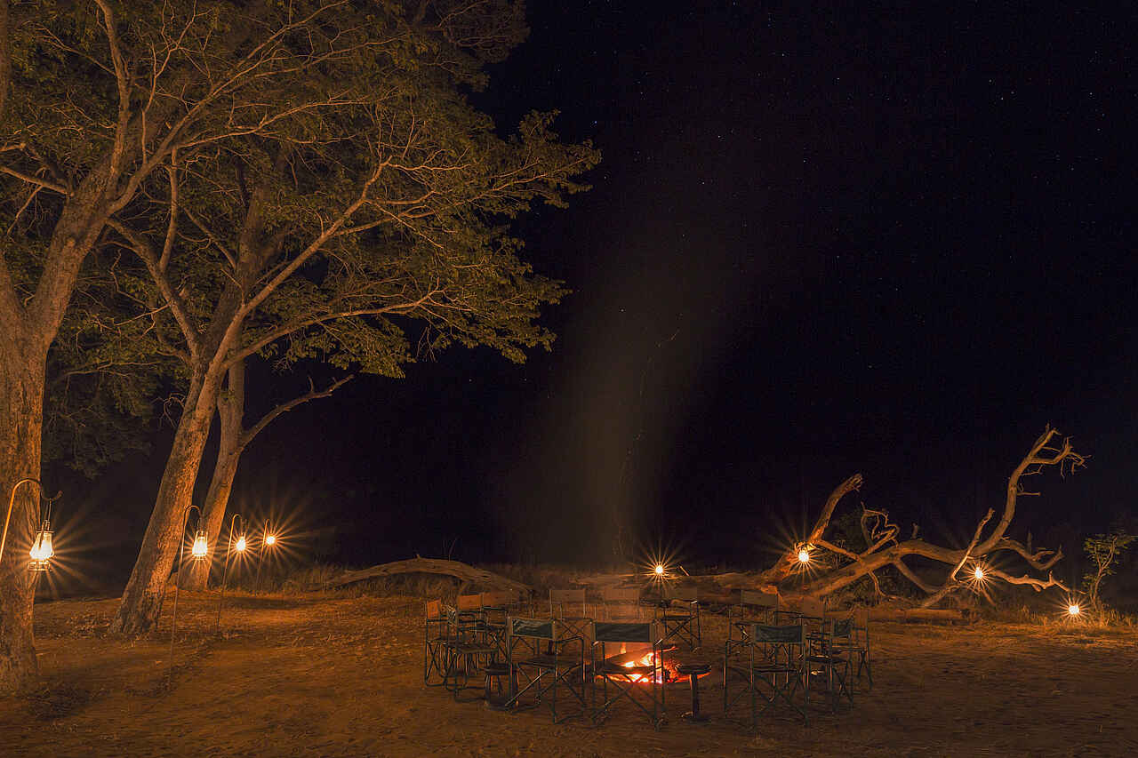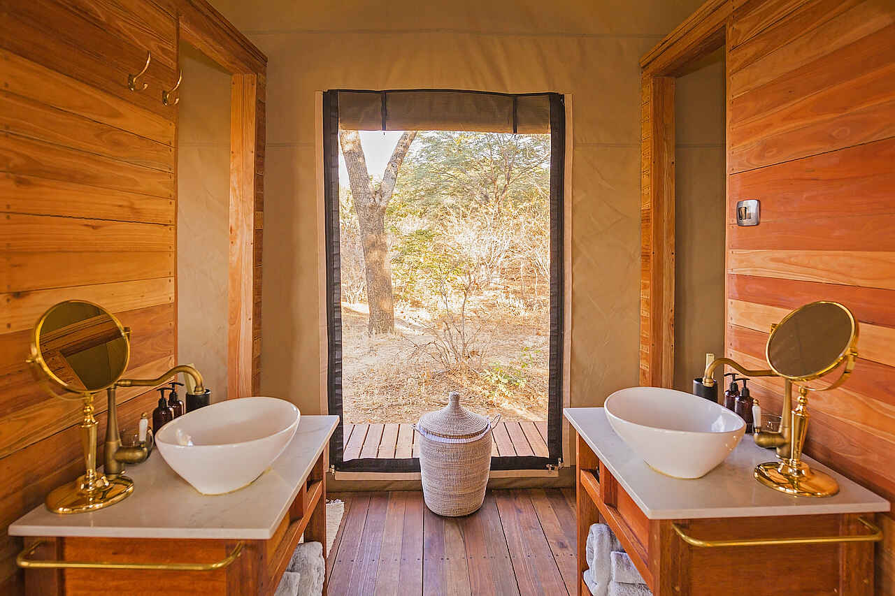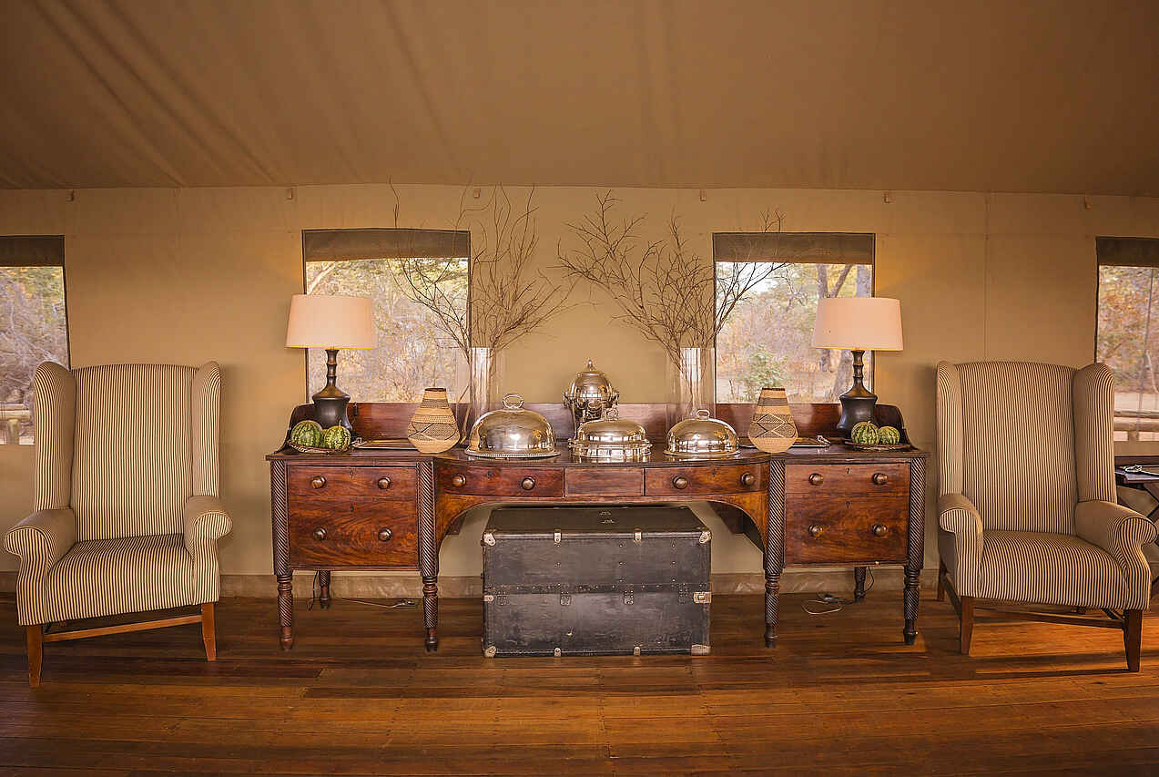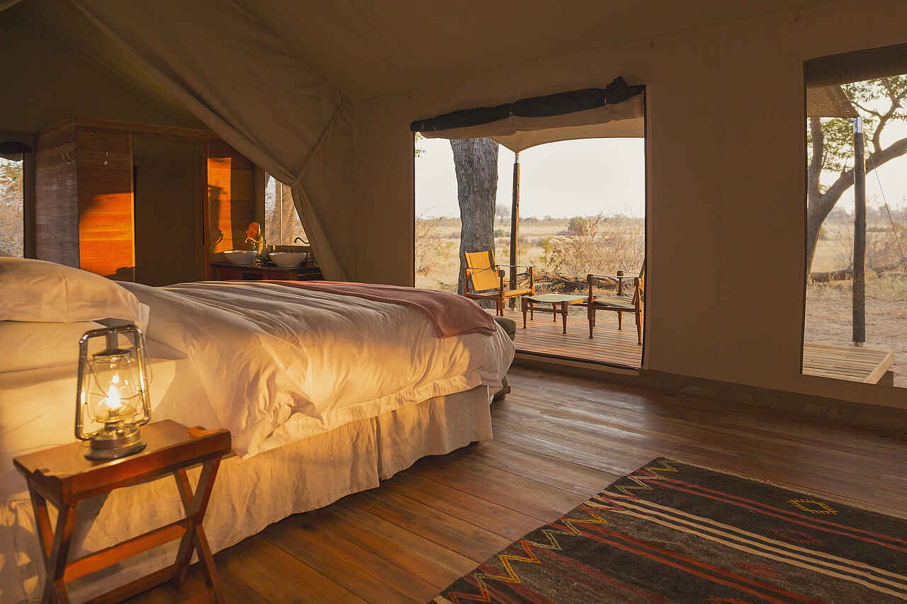 Luxuriöses Zeltcamp mit geschmackvoller landestypischer Einrichtung. Zentraler Bereich mit Bar, Restaurant und Sitzmöglichkeiten und einer Feuerstelle unter freiem Himmel. Das Highlight des Camps ist eine Wasserstelle, wo man direkt vom Deck des Hauptzeltes Tiere beobachten kann.