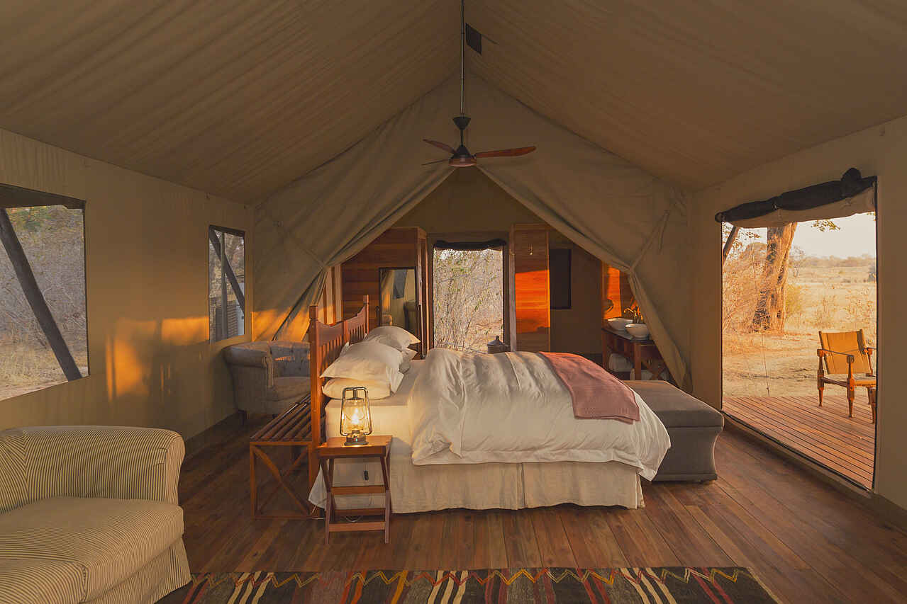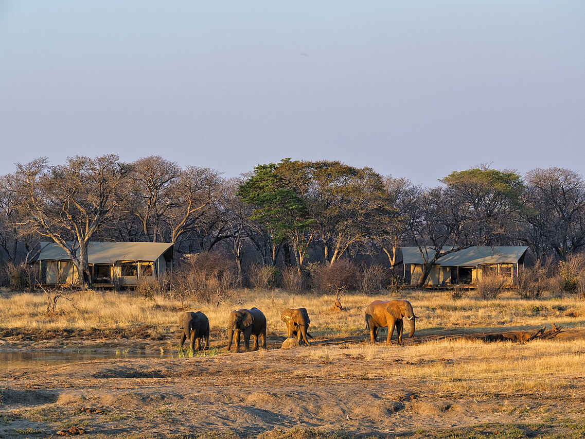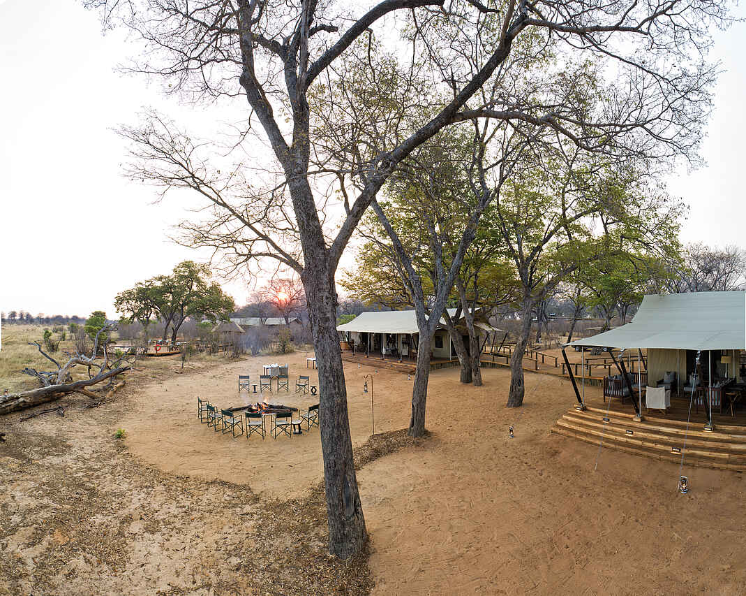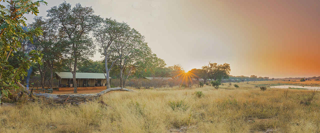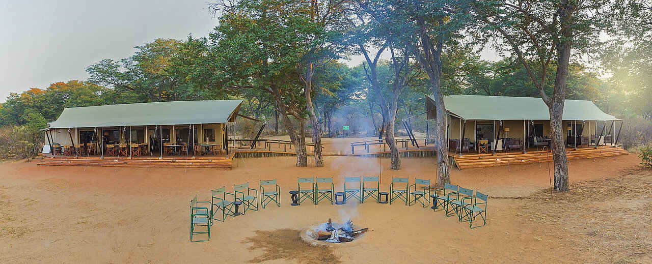 Verney's Camp im zentralen Bereich des Hwange National Park ist ein anspruchsvolles, klassisches Zeltcamp, das in einer privaten Konzession betrieben wird. Direkter Blick auf eine Wasserstelle vom Camp aus. Dank zweier Zelte für jeweils 4 Personen ist es familientauglich.