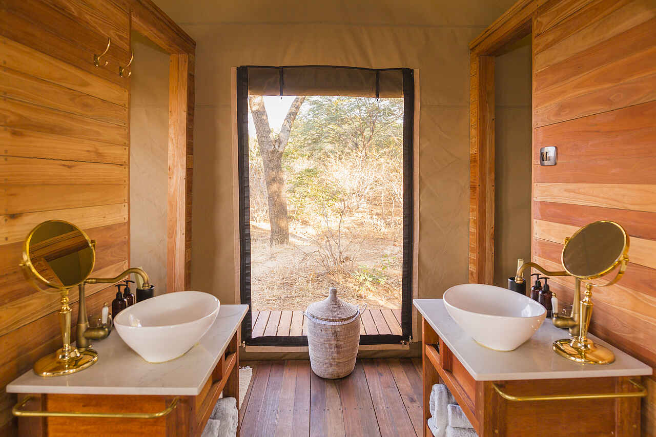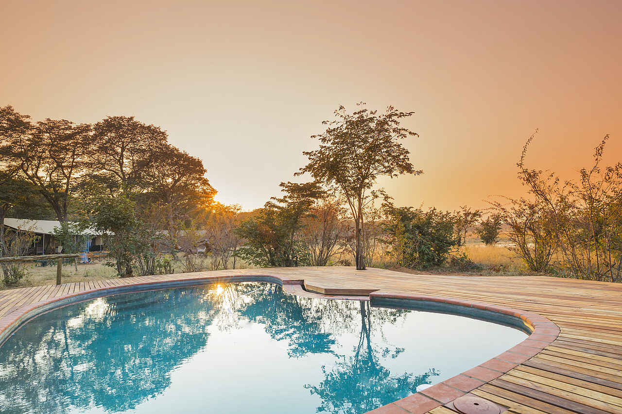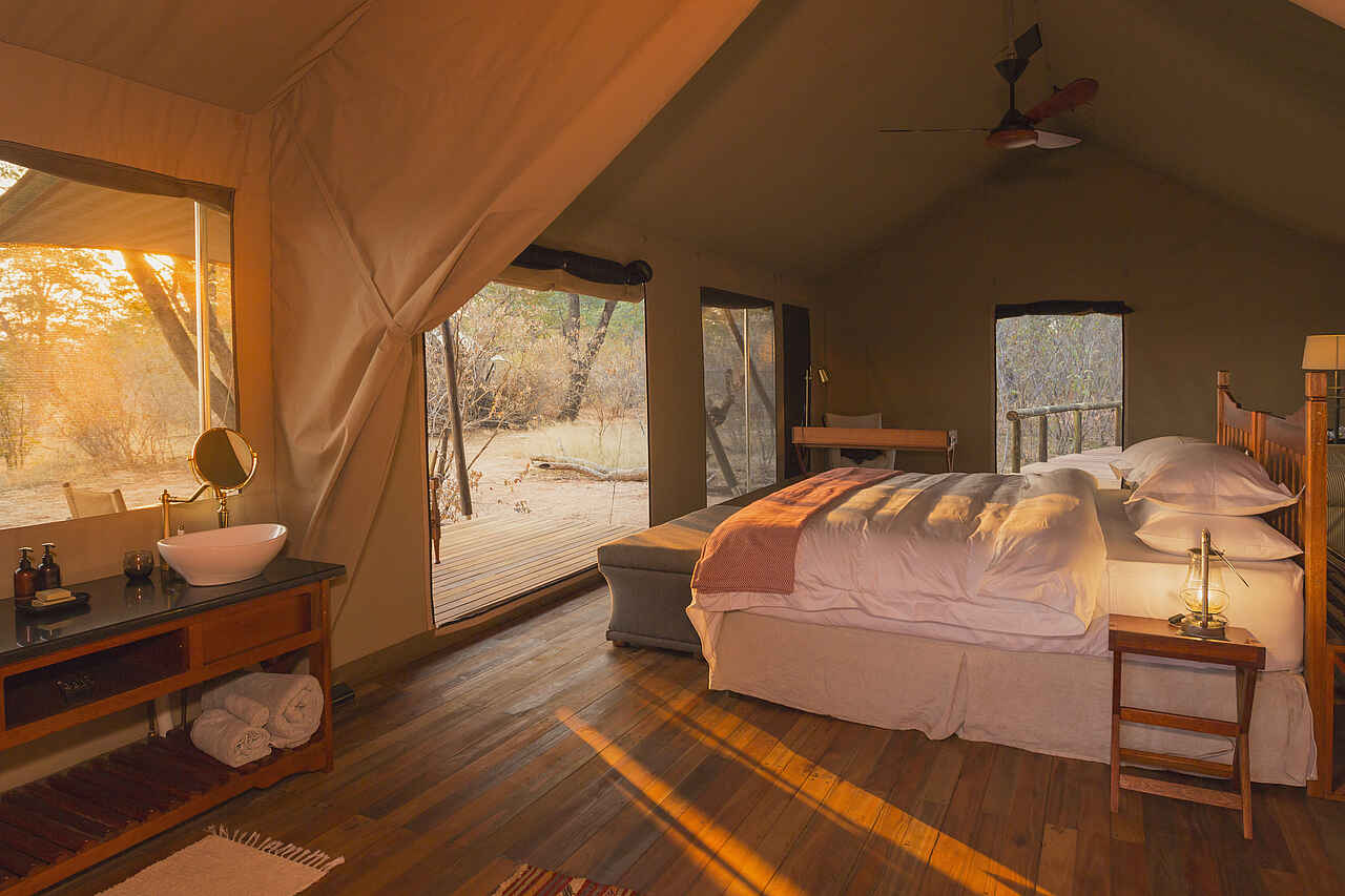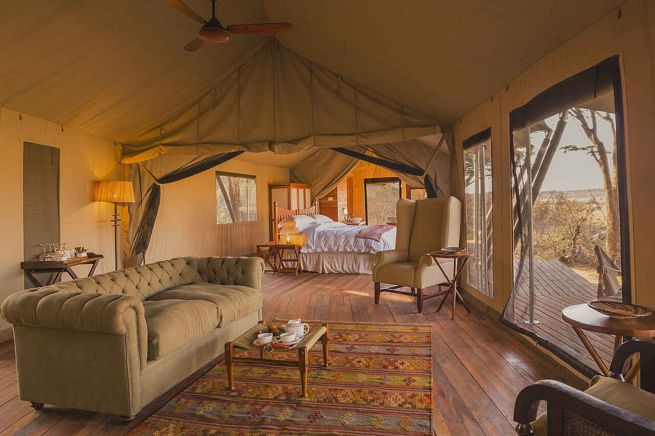 Verney's Camp im zentralen Bereich des Hwange National Park ist ein anspruchsvolles, klassisches Zeltcamp, das in einer privaten Konzession betrieben wird. Direkter Blick auf eine Wasserstelle vom Camp aus. Dank zweier Zelte für jeweils 4 Personen ist es familientauglich.