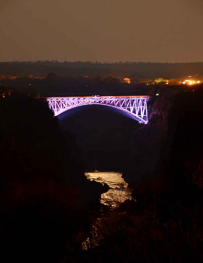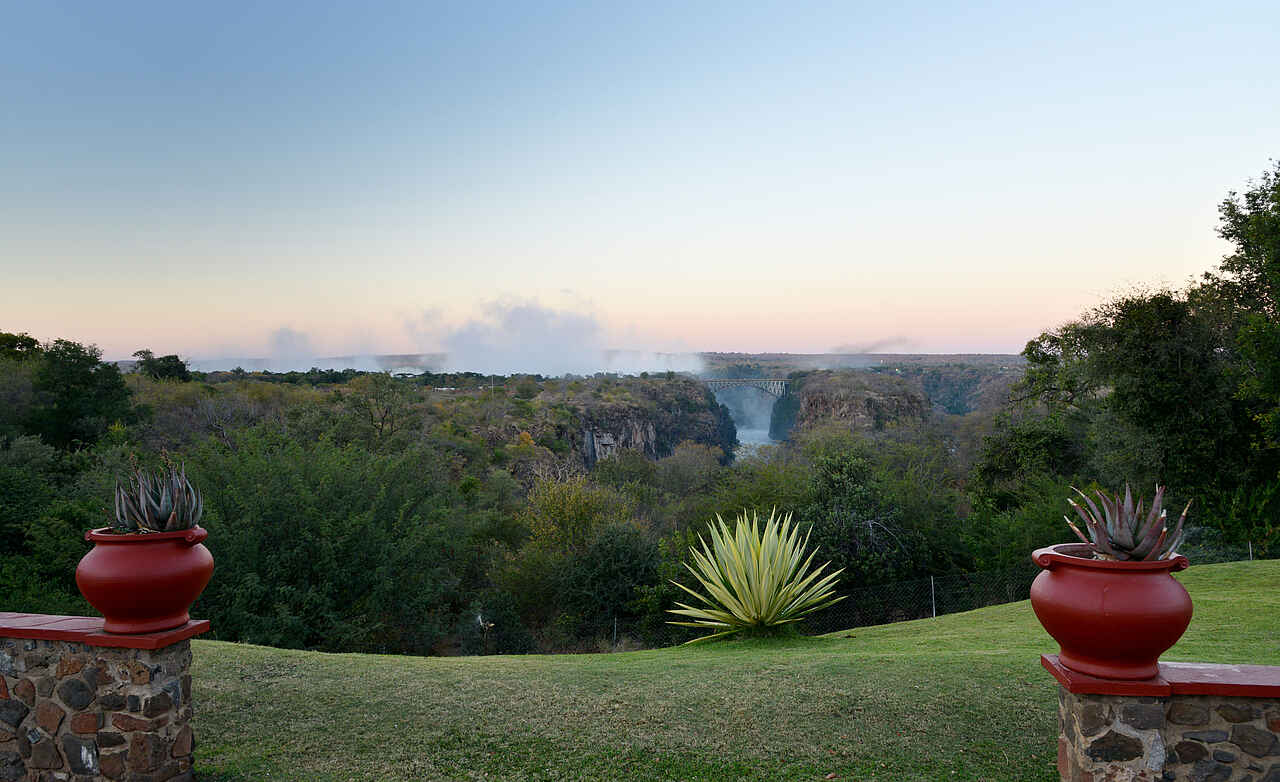 Im Victoriafälle Nationalpark, auf der Simbabwer Seite der Victoriafälle am Scheitelpunkt von 2. und 3. Sambesi-Schlucht in einer großen, gepflegten Gartenanlage, in der Nähe der Stadt Victoria Falls. Mit unverstelltem Blick auf die 2. Sambesischlucht und die Victoria Falls Bridge.