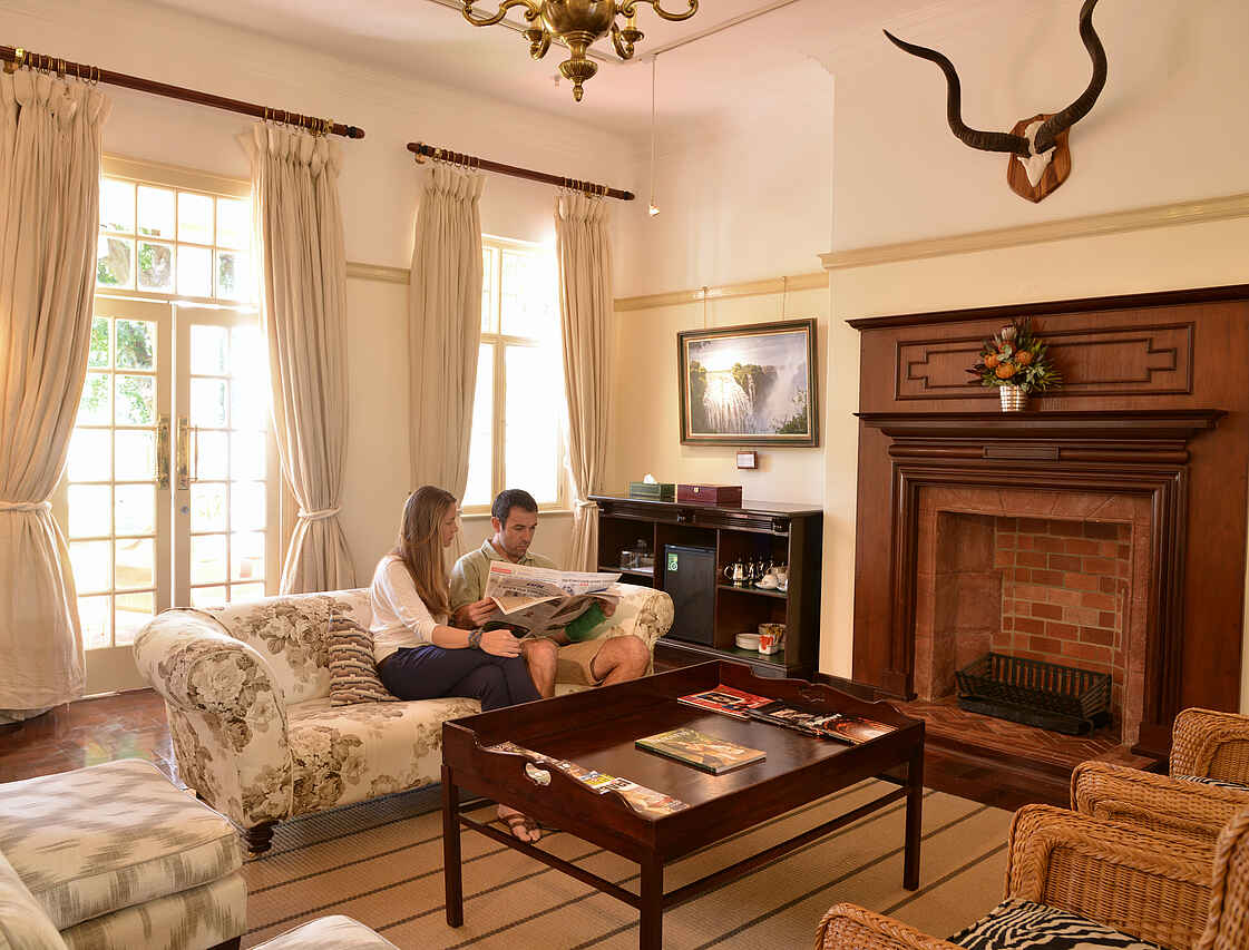 Alles im Kolonialstil aus der Zeit Edwards VII: 3 Restaurants, den luxuriösen Livingstone Room, die Stanley Terrace mit toller Aussicht und die legere Jungle Junction. Swimming Pool in der gepflegten Gartenanlage, privater Pfad zum Eingang des Victoria-Fälle-Nationalparks. Friseur-, Beauty Salon, E- Lounge, WiFi im ganzen Hotel, Bücherei, Lounges und Leseräume, Kapelle, 2 Konferenzräume, Curio Shop, 2 Tenniscourts, sichere Parkplätze.