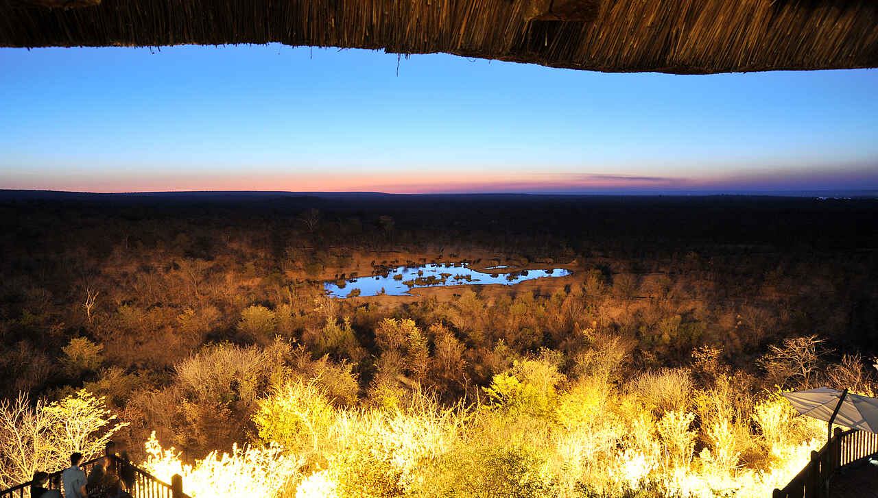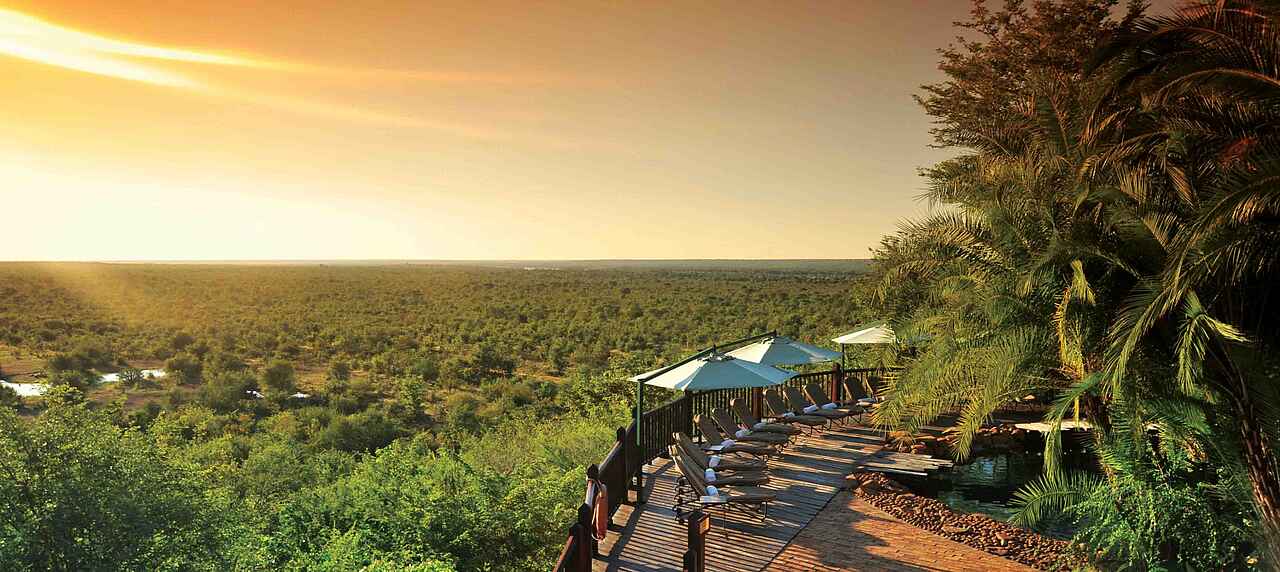 Nordwestliches Simbabwe. Auf natürlichem Plateau erbaute Anlage, Ausblick über weitläufige Landschaft des Sambesi Nationalparks mit einigen Wasserlöchern. Rund 5 Kilometer südlich der Victoria Falls und 4 Kilometer westlich der gleichnamigen Ortschaft.