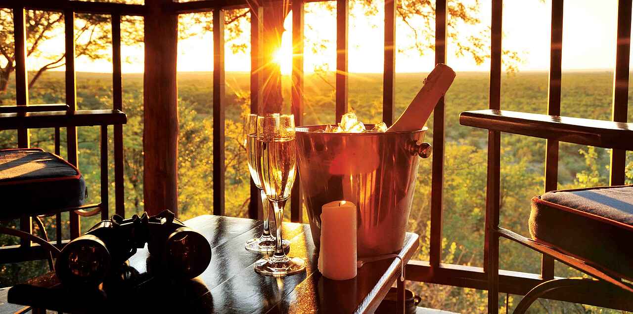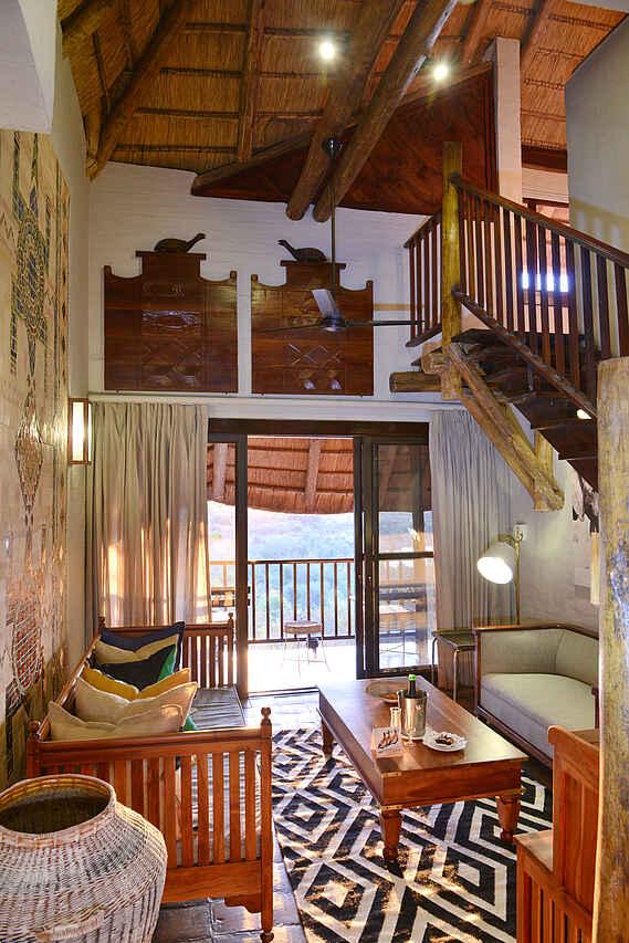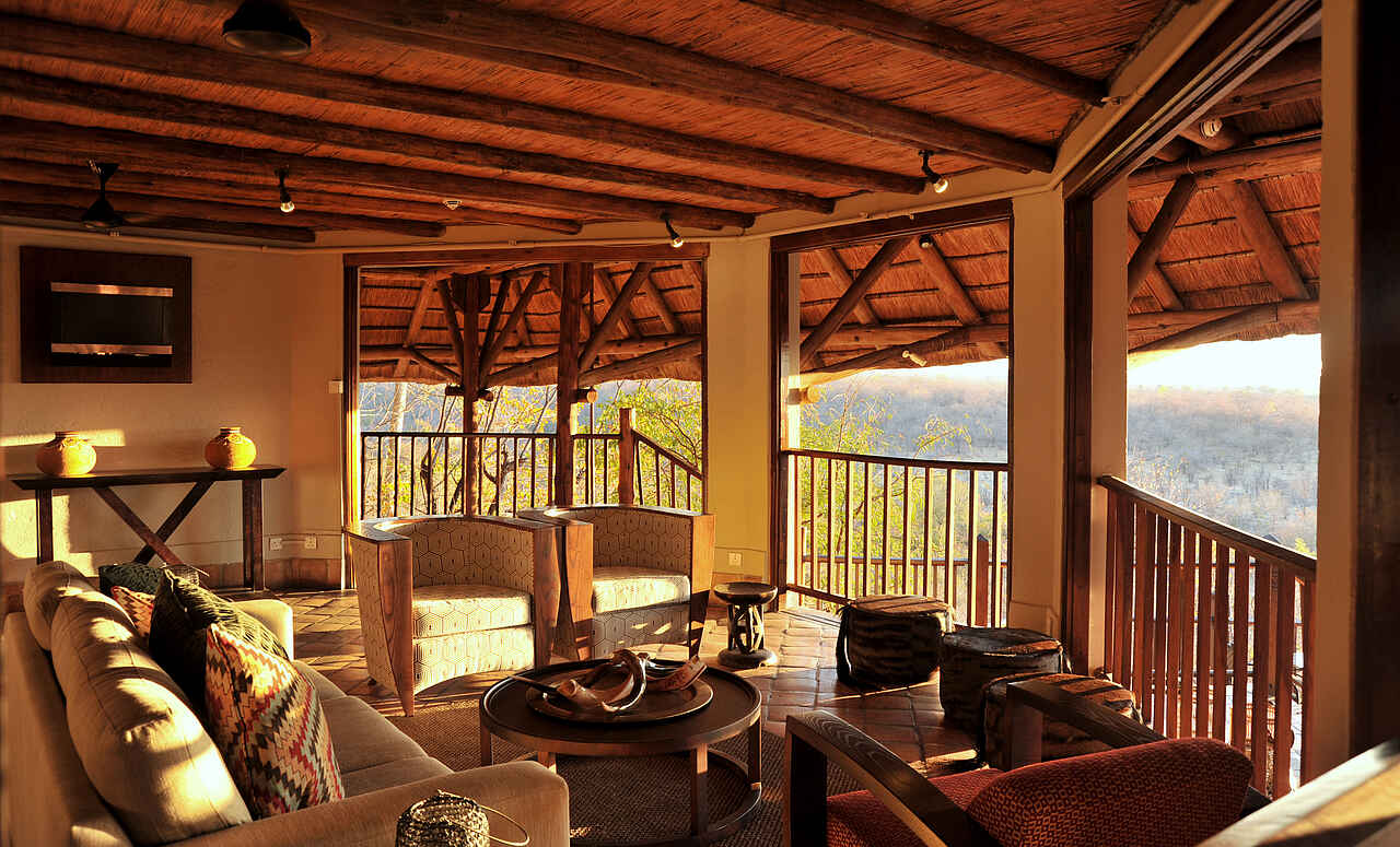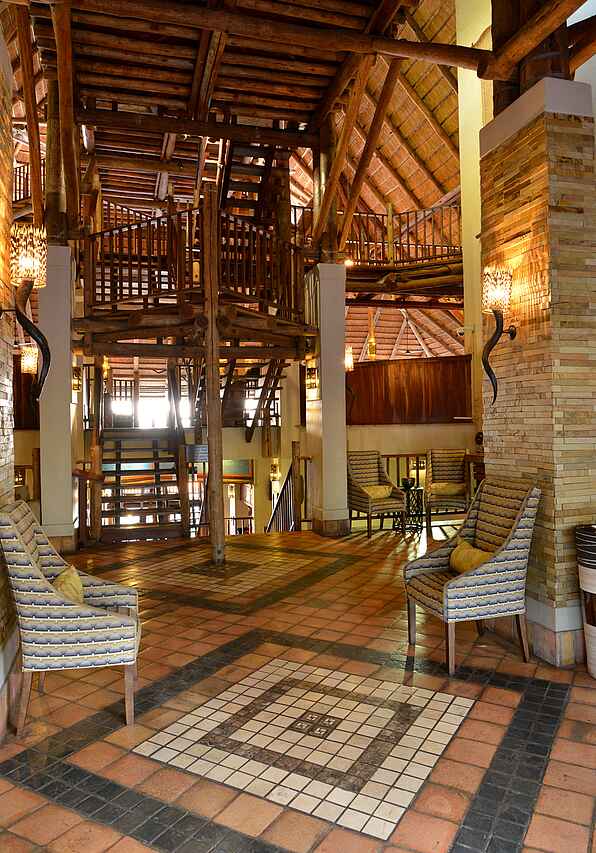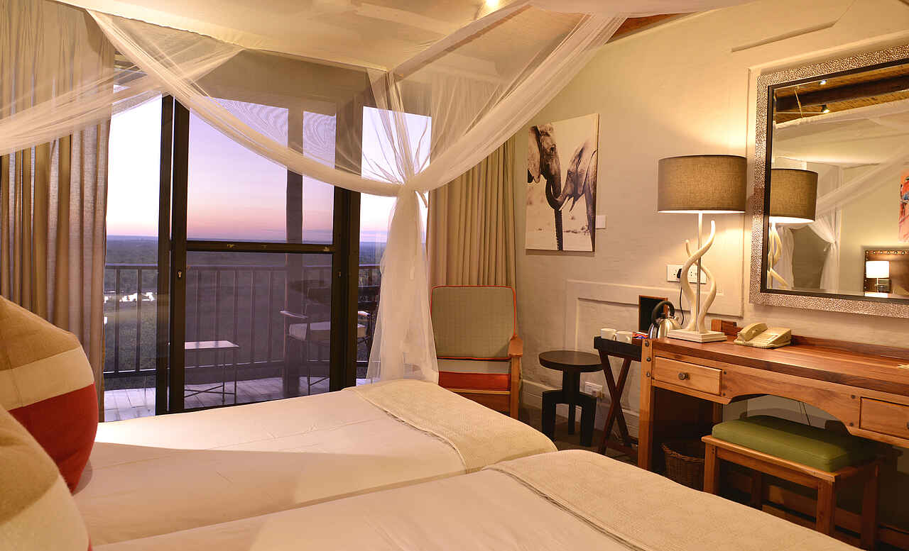 6 zweistöckige Gebäudekomplexe neben dem Hauptgebäude verteilt. Geschwungene Anordnung, wodurch Blick auf Wasserloch ermöglicht wird. Holzkonstruktionen unter Reetdach. 72 Zimmer in 3 Kategorien, Standard Room, Deluxe Room und King Suite. Alle Zimmer ausgestattet mit Safes, Telefon, regulierbarer Klimaanlage, Ventilatoren, Föhn, Hygieneartikel, diversen Insektensprays, Kaffee & und Tee Station sowie Balkons, Dusche, Badewanne und mit extra langen Betten inkl. Moskitonetzen. Deluxe Rooms zusätzlich mit Minibar und größerem Balkon ausgestattet. Zweistöckige King Suites mit privater Lounge, ausgestattet mit Literatur, großräumigen Badezimmern mit Jacuzzi und Dusche mit Massagedüsen. Weitläufige Aussicht vom Balkon, immer in Richtung Westen blickend. Alle Zimmer im frischen, stimmungsvollen Design, charakterisiert durch warme, natürliche Farben, Holzmöbel und afrikanische Kunststücke. Luxuriöse Ausstattung und hoher Grad an Komfort.