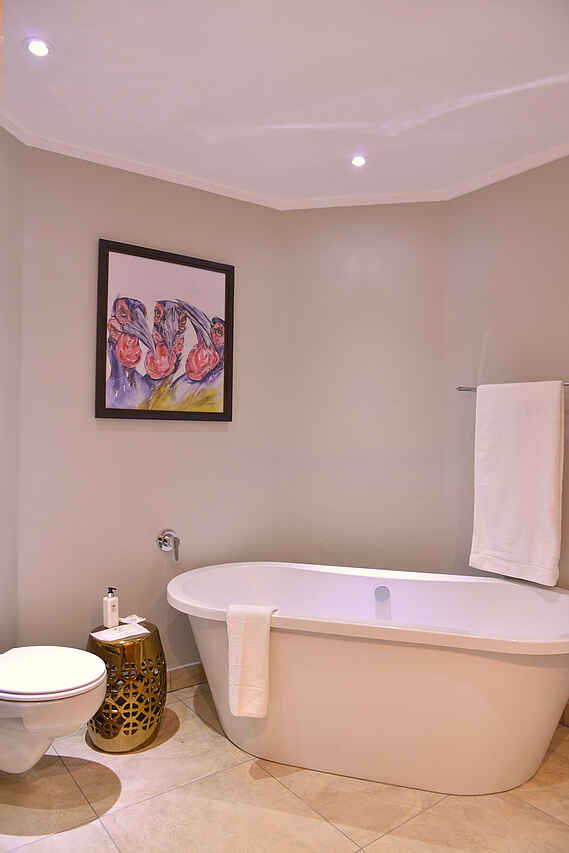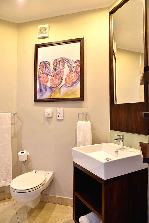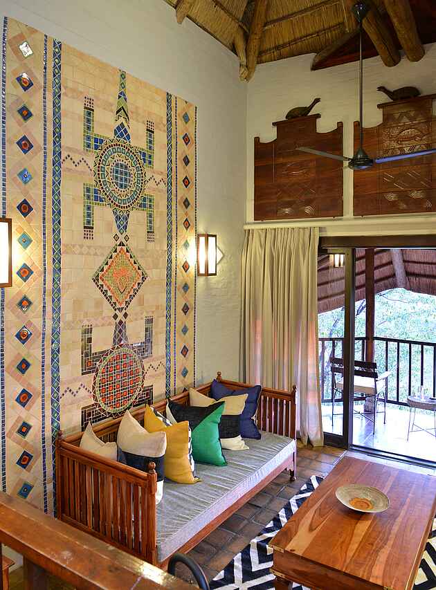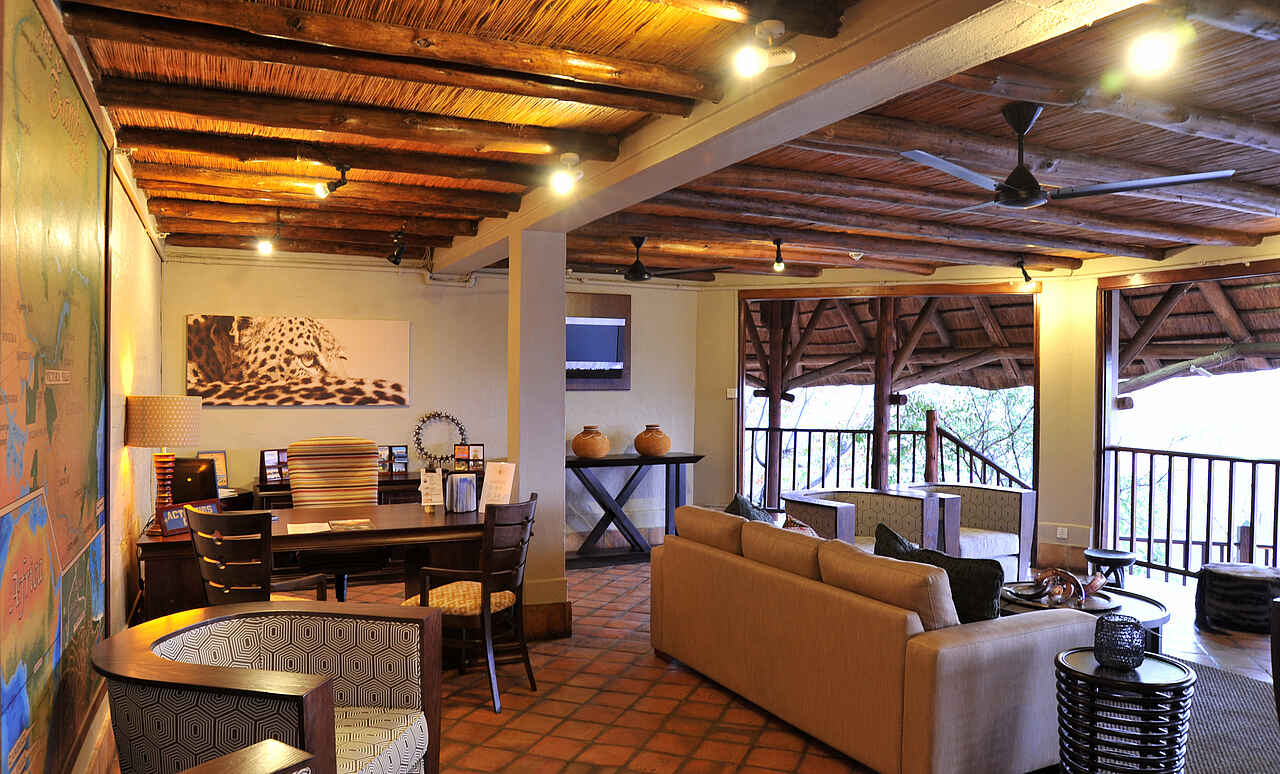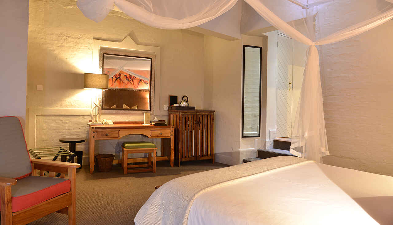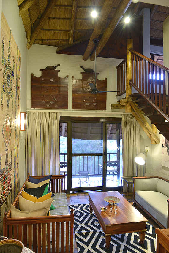 6 zweistöckige Gebäudekomplexe neben dem Hauptgebäude verteilt. Geschwungene Anordnung, wodurch Blick auf Wasserloch ermöglicht wird. Holzkonstruktionen unter Reetdach. 72 Zimmer in 3 Kategorien, Standard Room, Deluxe Room und King Suite. Alle Zimmer ausgestattet mit Safes, Telefon, regulierbarer Klimaanlage, Ventilatoren, Föhn, Hygieneartikel, diversen Insektensprays, Kaffee & und Tee Station sowie Balkons, Dusche, Badewanne und mit extra langen Betten inkl. Moskitonetzen. Deluxe Rooms zusätzlich mit Minibar und größerem Balkon ausgestattet. Zweistöckige King Suites mit privater Lounge, ausgestattet mit Literatur, großräumigen Badezimmern mit Jacuzzi und Dusche mit Massagedüsen. Weitläufige Aussicht vom Balkon, immer in Richtung Westen blickend. Alle Zimmer im frischen, stimmungsvollen Design, charakterisiert durch warme, natürliche Farben, Holzmöbel und afrikanische Kunststücke. Luxuriöse Ausstattung und hoher Grad an Komfort.
