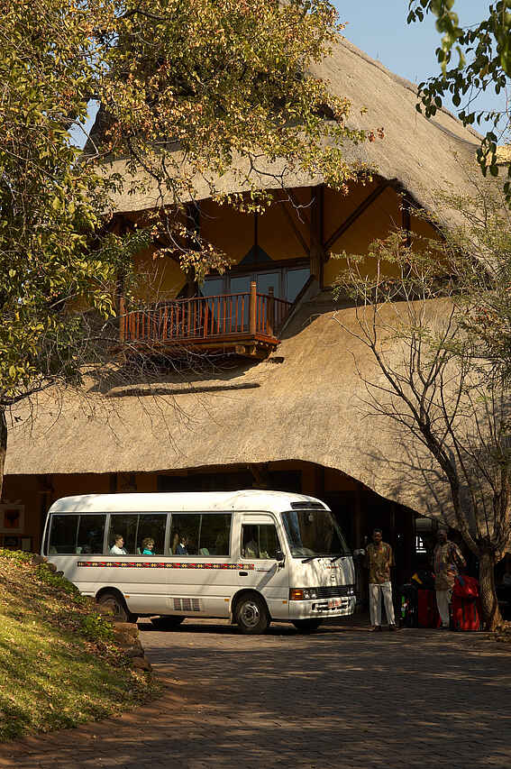 Vom Flughafen in Victoria Falls (21km) oder in Livingstone (22km) kann kostenpflichtiger Transfer vereinbart werden. Beide Flughäfen können ebenfalls vom internationalen Airport in Harare angeflogen werden. Täglicher Busshuttle nach Victoria Falls (Ortschaft) im Preis inbegriffen.