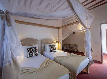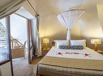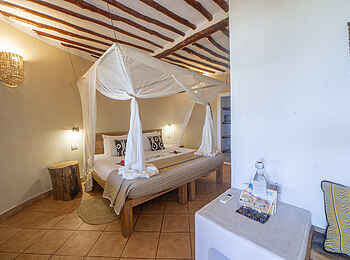 Die 28 Zimmer des Villa Kiva Boutique Hotels sind im sansibarischen Stil eingerichtet und verfügen über Holzbalken sowie traditionelle Designelemente. Jedes Zimmer hat eine private Veranda oder einen Balkon mit Blick auf den Garten oder das Meer. Zu den Annehmlichkeiten gehören Klimaanlage, Deckenventilator, Wlan, Moskitonetz, kleiner Kühlschrank, Tee- und Kaffeezubereiter sowie ein Safe. Die Badezimmer sind mit Dusche, Toilette und Haartrockner ausgestattet. Für Familien stehen spezielle Familienzimmer mit Verbindungstüren zur Verfügung, einige Zimmer haben ausreichen Platz für ein zusätzliches Baby-Bett, Zustellbett oder eine Schlafcouch.
