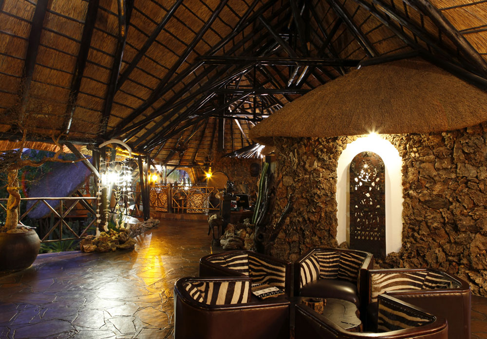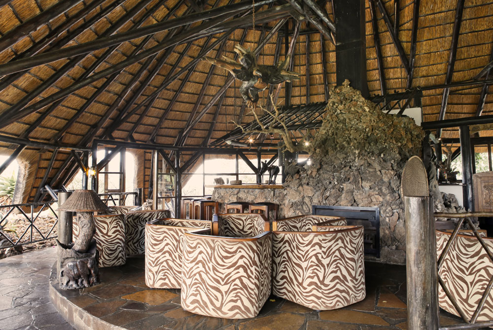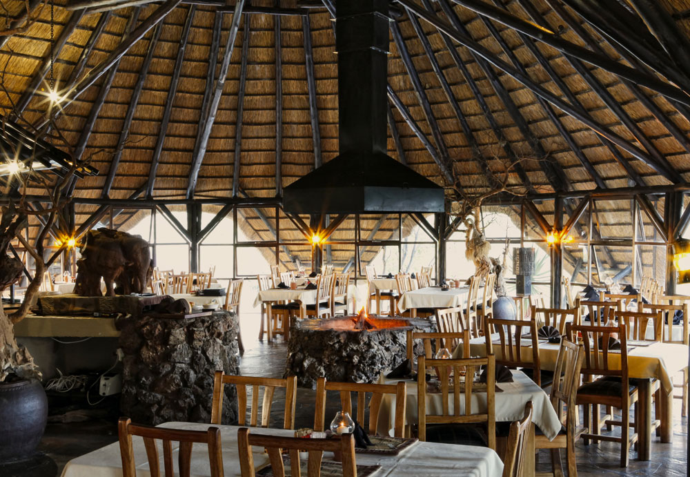 Reetgedecktes Haupthaus mit Rezeption, Bar, Souvenirladen, Lounge-Bereich und Restaurant, inklusive Speisesaal und offener Feuerstelle. Darüber gibt es einen Swimmingpool mit Sonnenterrasse, einen Jacuzzi und eine Aussichtsplattform.