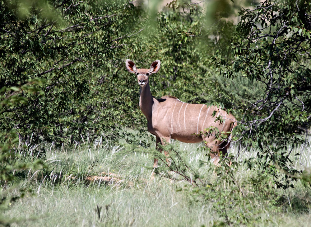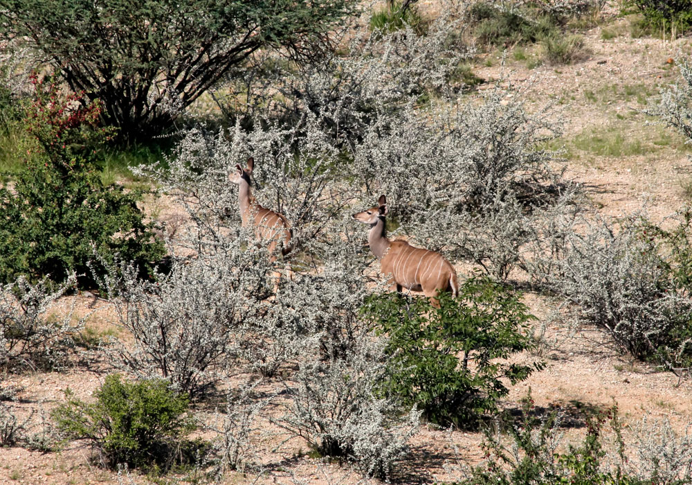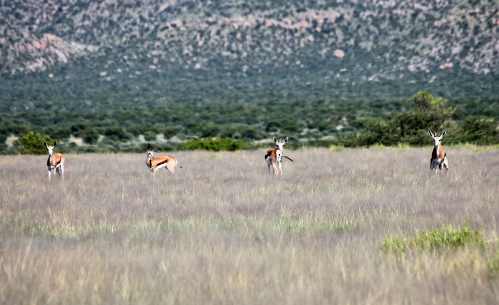 Giraffen, Elands, Zebras, Kudus, Oryx-Antilopen, Springböcke, Impalas, Warzenschweine, Paviane und Steinböcke.