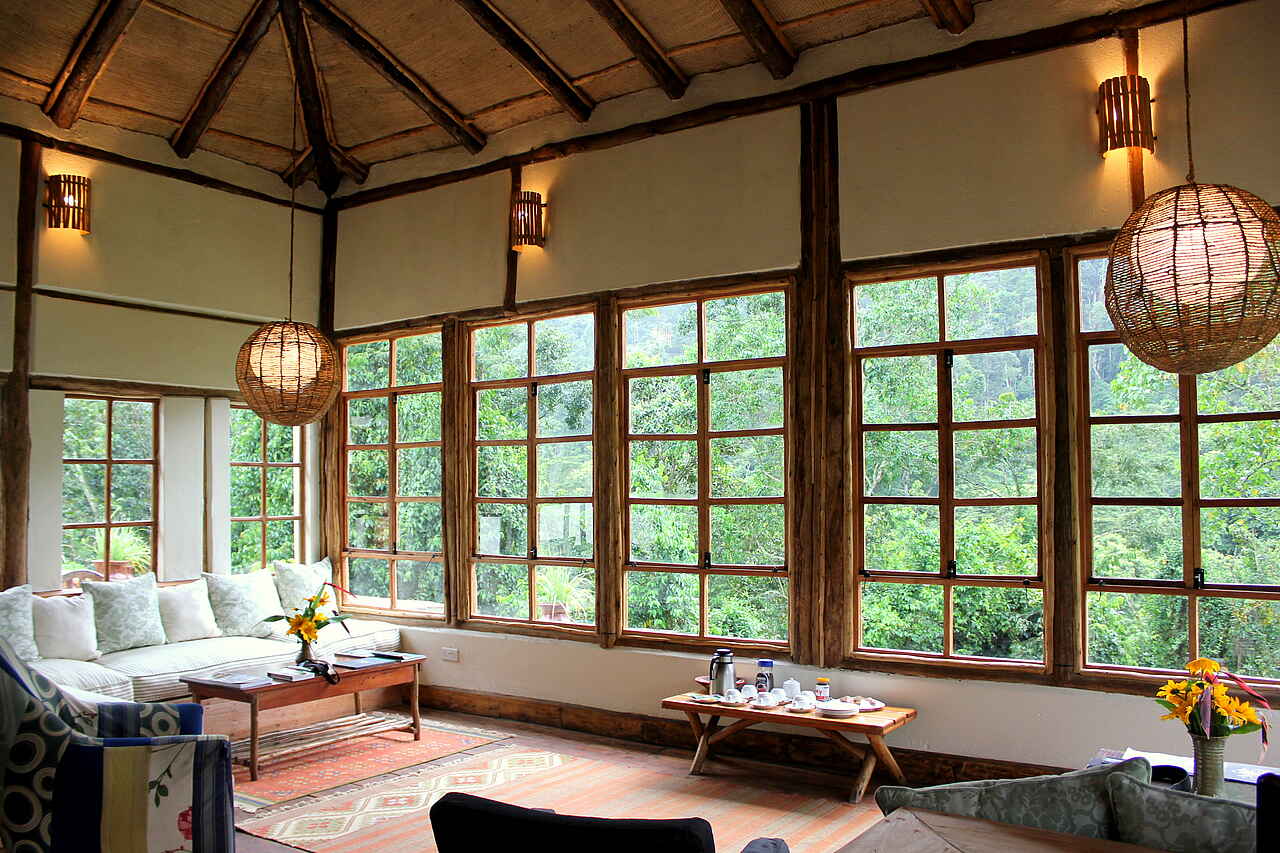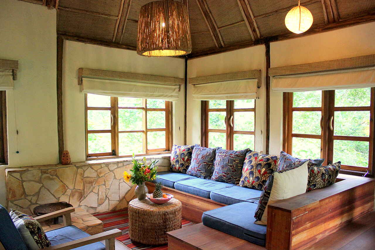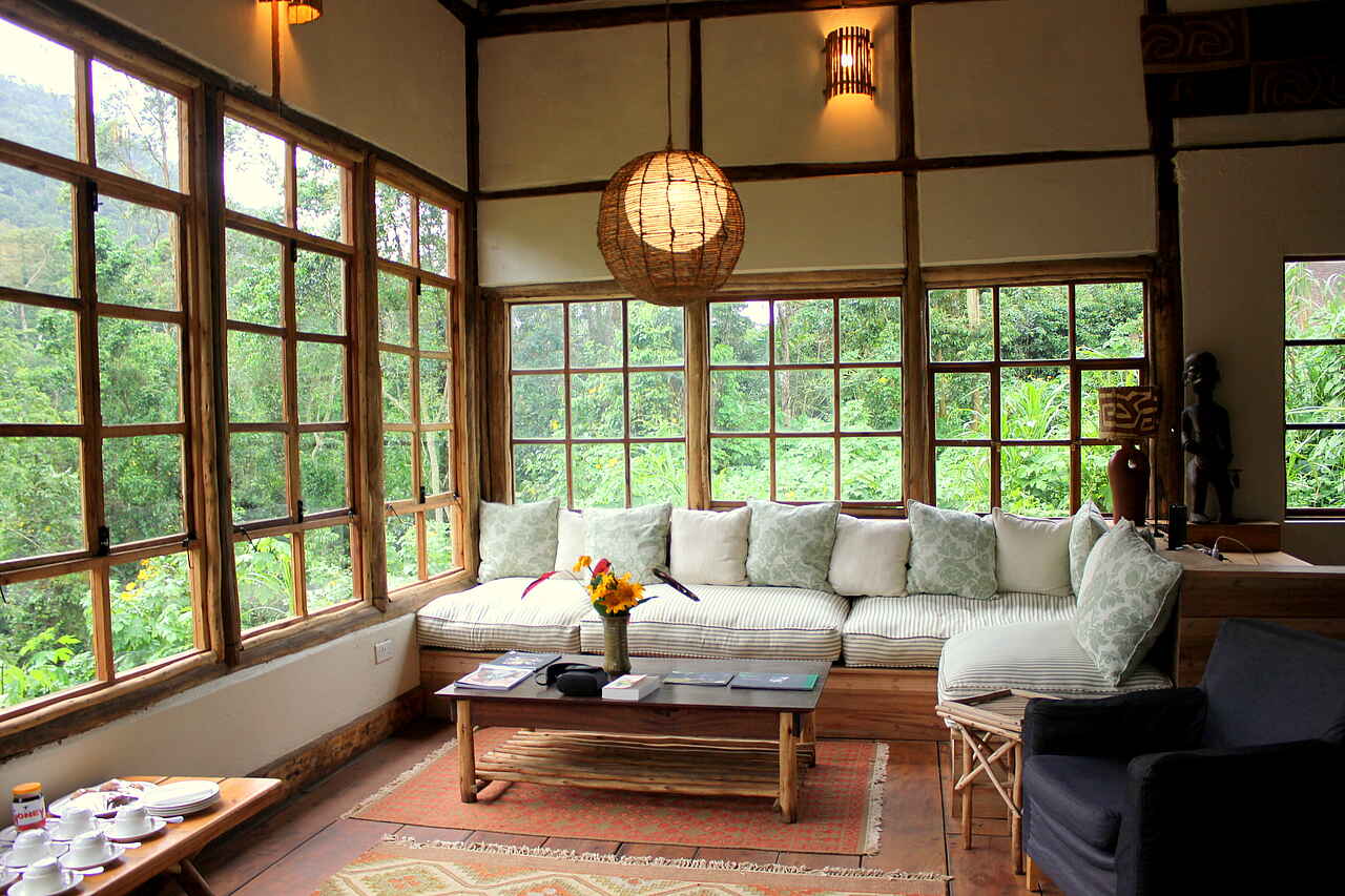 Das lichtdurchströmte und stilvoll eingerichte Hauptgebäude ist das Herzstück der Lodge. Hier finden sich Lounge, Restaurant und Bar. Der Hauptwohnbereich mit zentralen Kamin dient als Anlaufpunkt für Gäste, um zu entspannen und die Erlebnisse ihres Gorilla Trackings Revue passieren lassen. Zahlreiche Sitzgelegenheiten laden zum Relaxen ein. Bücher über die Geschichte sowie Tier- und Vogelwelt Ugandas liegen zum Lesen und Anschauen bereit. Die große Terrasse vor dem Hauptgebäude mit Blick auf den Wald ist ein großartiger Ort, um Affen und Vögel zu beobachten. WLAN und Ladestation für elektronische Geräte sind am zentralen Bereich vorhanden. Ein Souvenirshop befindet sich Nahe des Haupthauses.