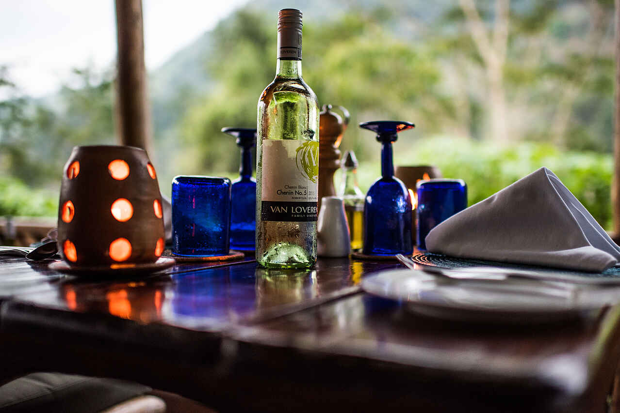 3 Mahlzeiten täglich: Frühstück, Mittagessen in der Lodge oder gepackt als Lunchpaket für längere Aktivitäten und Abendessen zwischen 18 und 21 Uhr, je nach Wunsch der Kunden und Rückkehr von den Aktivitäten. Mittagessen mit 1 Gang und Abendessen mit 4 Gängen und jeweils einer Auswahlmöglichkeit zwischen einem vegetarischen und nicht-vegetarischen Gericht sowie eine Auswahl an internationalen Weinen und anderen alkoholischen Getränken wird geboten. Wasser, andere alkoholfreie und alkoholische Getränke (Premium Getränke ausgenommen) sind bei Vollpension inklusive. Wasser steht auf den Zimmern stets zur Verfügung. Auf persönliche Wünsche und Diätvorschriften wird mit Vorankündigung gerne Rücksicht genommen. Heißgetränke und Gebäck stehen den ganzen Tag über zur Verfügung.