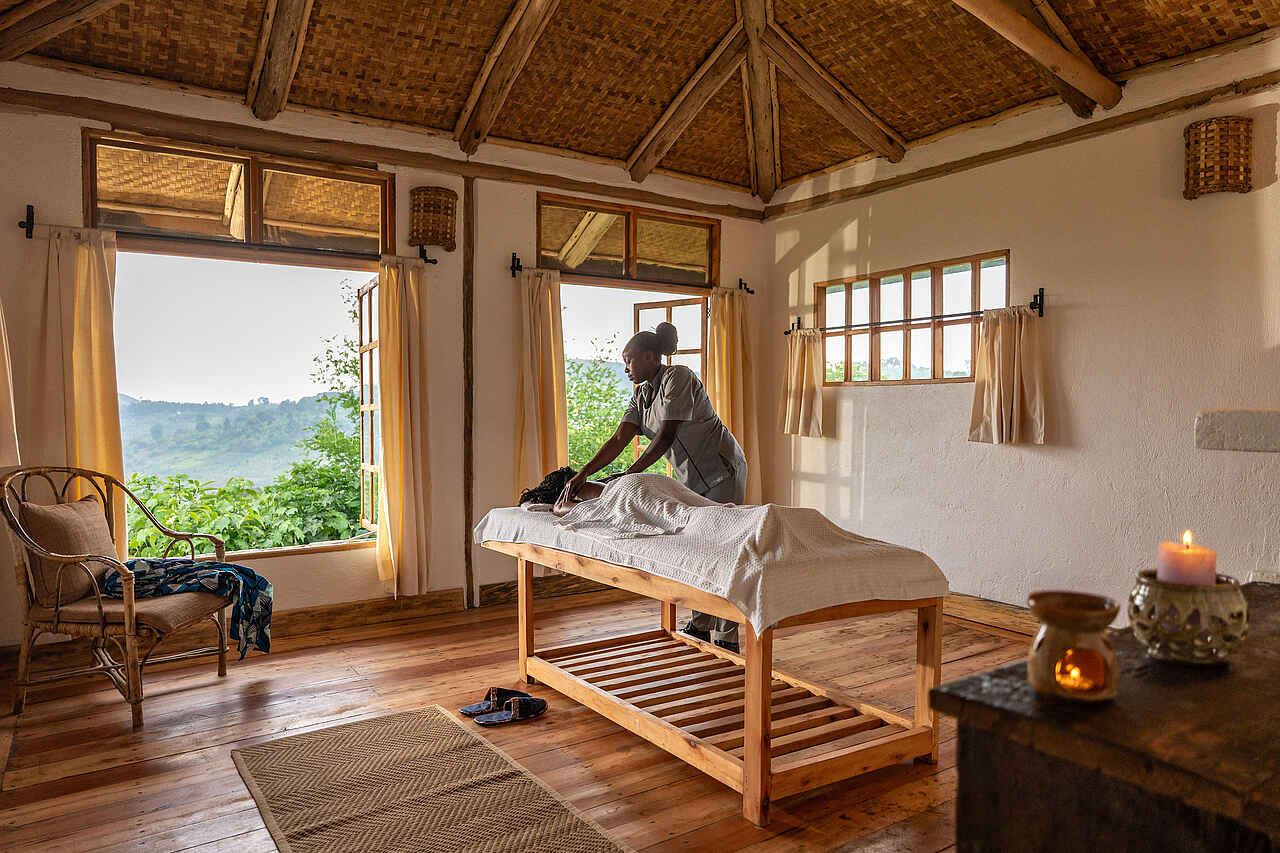 Im Zentrum der Volcanoes Kibale Lodge befindet sich ein offener Gemeinschaftsbereich mit Lounge, Bar und Restaurant. Große Fensterfronten, warme Naturmaterialien und handgefertigte Möbel schaffen eine ruhige Atmosphäre mit Blick auf die umliegenden Hügel. In der Lounge laden bequeme Sitzgruppen zum Entspannen ein, während im Restaurant frisch zubereitete Speisen serviert werden. Das Kibale Forest Spa umfasst zwei Doppel-Massageräume, eine Sauna und einen Swimmingpool. Alle Massagen sind im Aufenthalt inbegriffen und können je nach Verfügbarkeit gebucht werden. Abends versammeln sich die Gäste auf der Terrasse oder am Lagerfeuerplatz und genießen die Ruhe des Ortes. Ein kleiner Souvenirshop mit Produkten aus der Region rundet das Angebot ab.