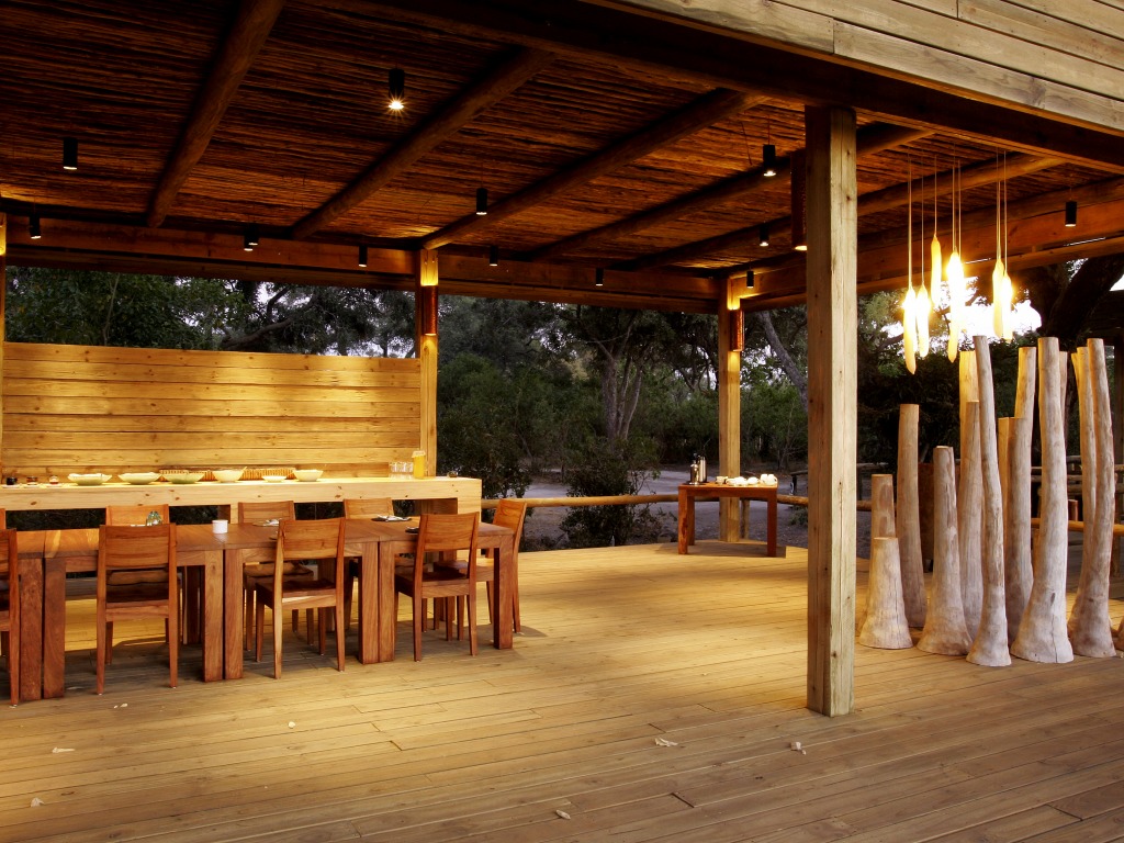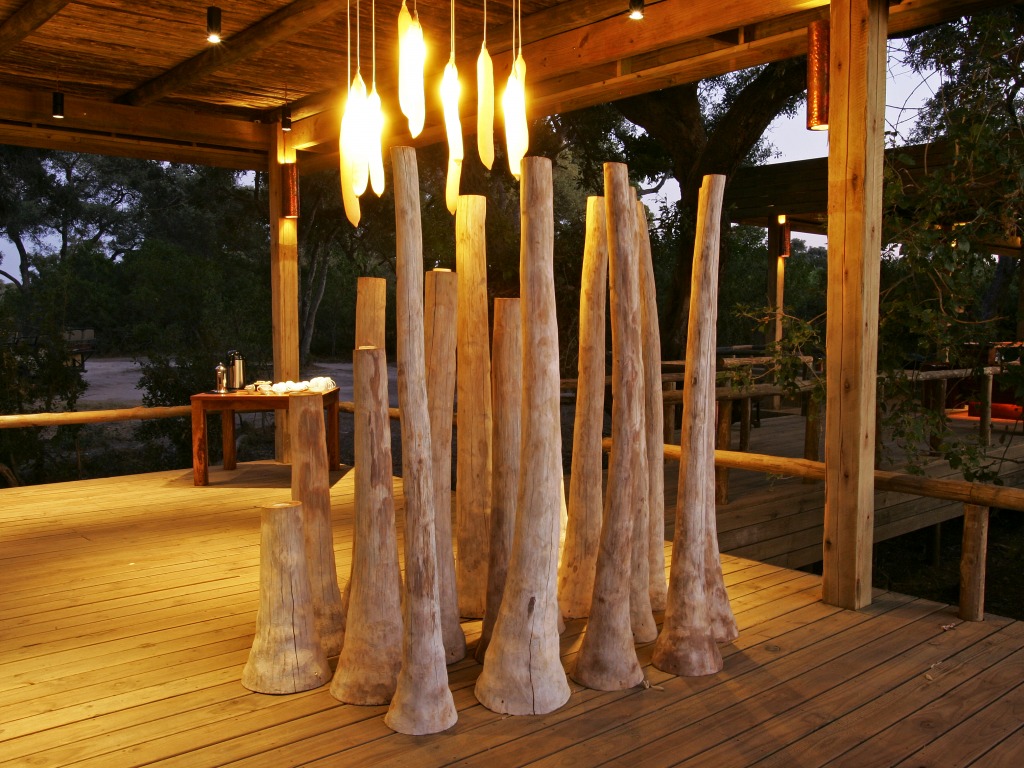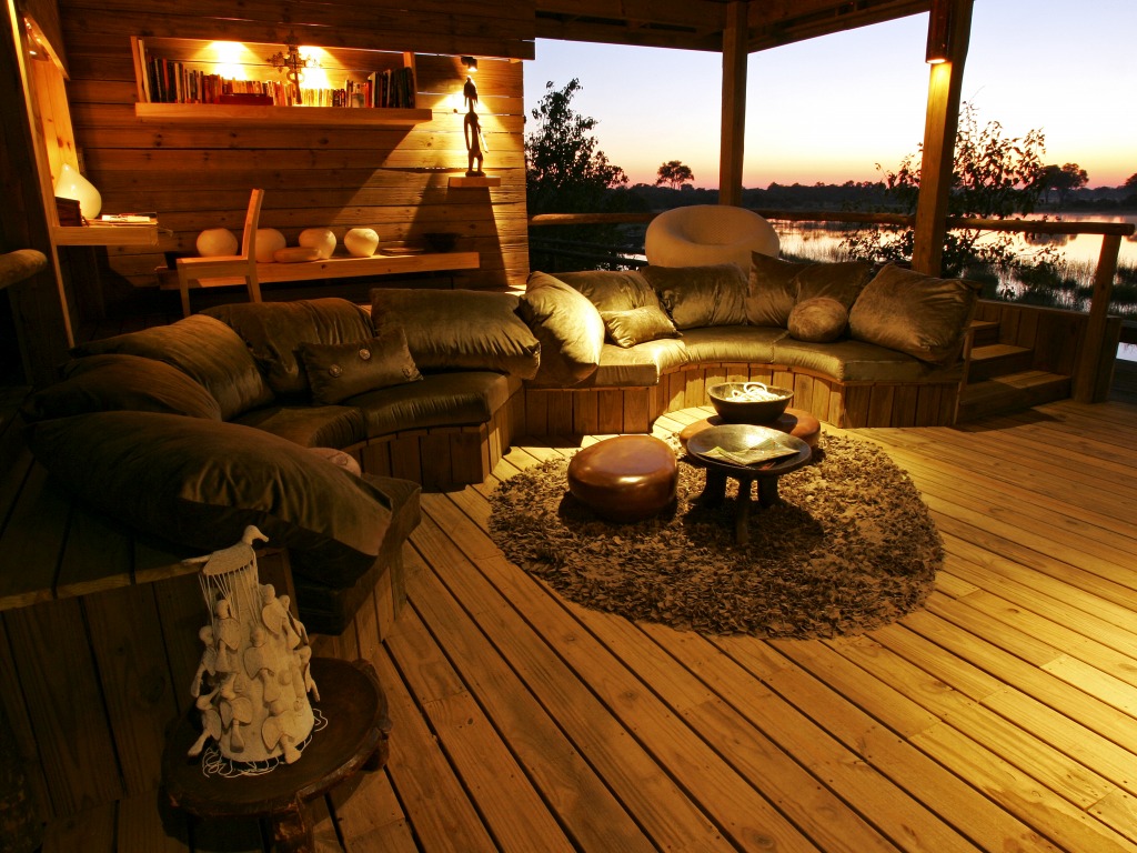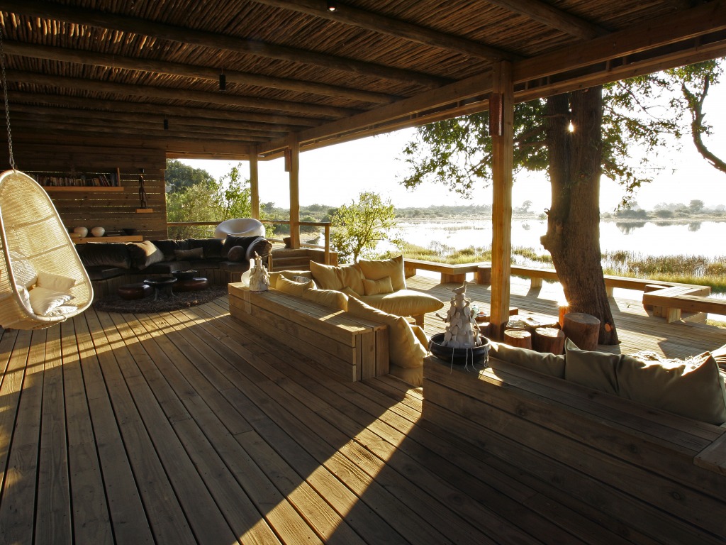 Die zentralen Einrichtungen von Vumbura Plains sind offen gestaltet und bilden den Treffpunkt zwischen den Safaris. Teilweise überdachte Essbereiche gehen fließend in offene Loungezonen über, die Raum für entspannte Stunden bieten. Eine gut ausgestattete Bar hält eine Auswahl an alkoholischen Getränken und Softdrinks bereit. Im Mittelpunkt steht die großzügige zentrale Terrasse mit weitem Blick über die umliegenden Ebenen. Hier kommen Gäste am Abend häufig an der Feuerstelle zusammen, um die Eindrücke des Tages zu teilen. Die Atmosphäre ist ungezwungen und ruhig gehalten. Gestaltung und Einrichtung greifen regionale Einflüsse auf. Möbel, Kunstobjekte und Details stammen von lokalen Handwerkern und spiegeln traditionelle Techniken wider. Leuchten aus geflochtenen Körben oder nach Vorbild traditioneller Fischreusen setzen Akzente und verweisen auf die enge Verbindung zur Umgebung und zur lokalen Gemeinschaft.