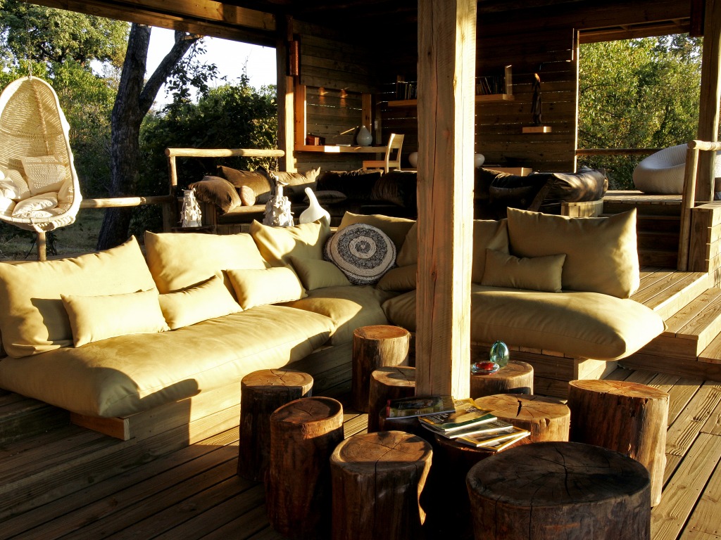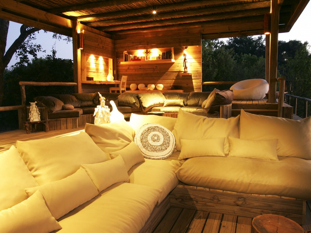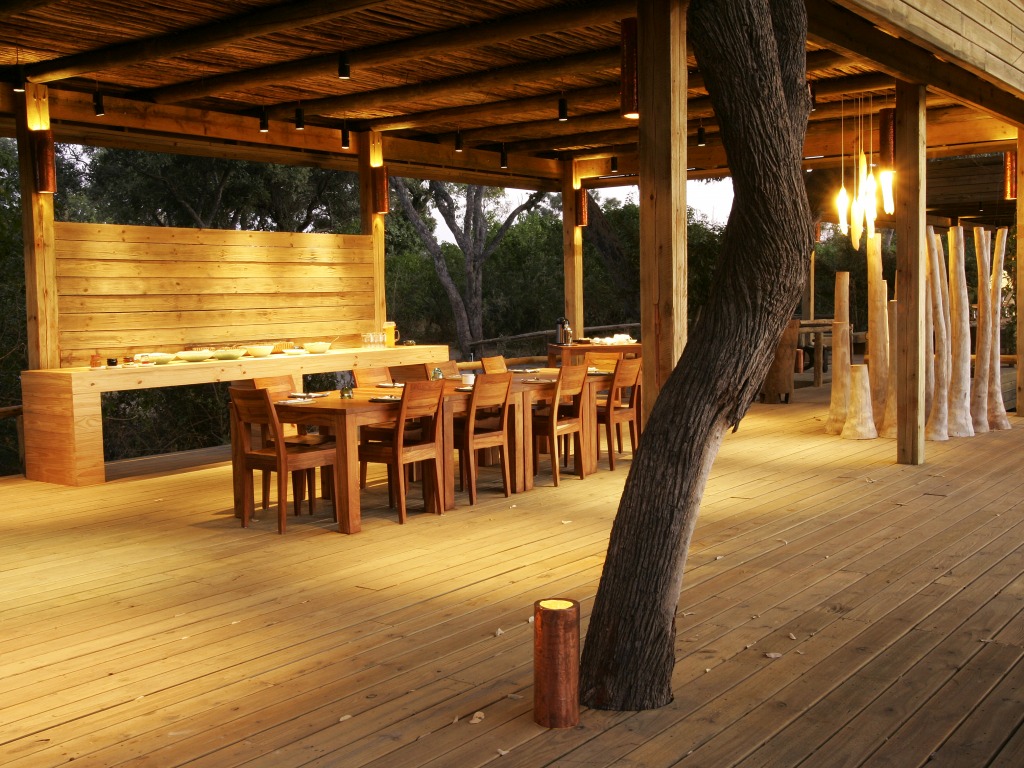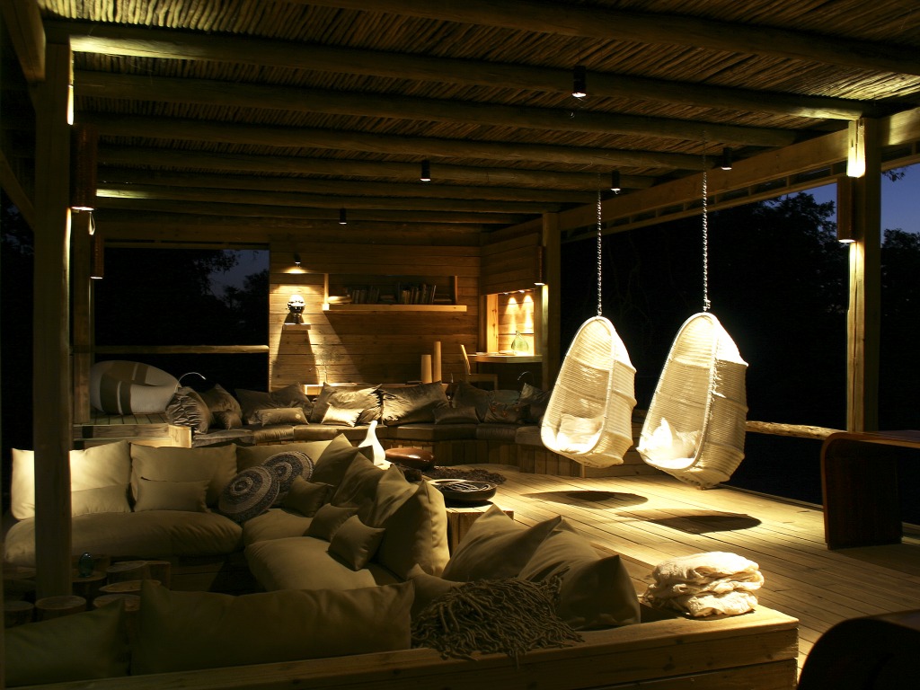 Die zentralen Einrichtungen von Vumbura Plains sind offen gestaltet und bilden den Treffpunkt zwischen den Safaris. Teilweise überdachte Essbereiche gehen fließend in offene Loungezonen über, die Raum für entspannte Stunden bieten. Eine gut ausgestattete Bar hält eine Auswahl an alkoholischen Getränken und Softdrinks bereit. Im Mittelpunkt steht die großzügige zentrale Terrasse mit weitem Blick über die umliegenden Ebenen. Hier kommen Gäste am Abend häufig an der Feuerstelle zusammen, um die Eindrücke des Tages zu teilen. Die Atmosphäre ist ungezwungen und ruhig gehalten. Gestaltung und Einrichtung greifen regionale Einflüsse auf. Möbel, Kunstobjekte und Details stammen von lokalen Handwerkern und spiegeln traditionelle Techniken wider. Leuchten aus geflochtenen Körben oder nach Vorbild traditioneller Fischreusen setzen Akzente und verweisen auf die enge Verbindung zur Umgebung und zur lokalen Gemeinschaft.