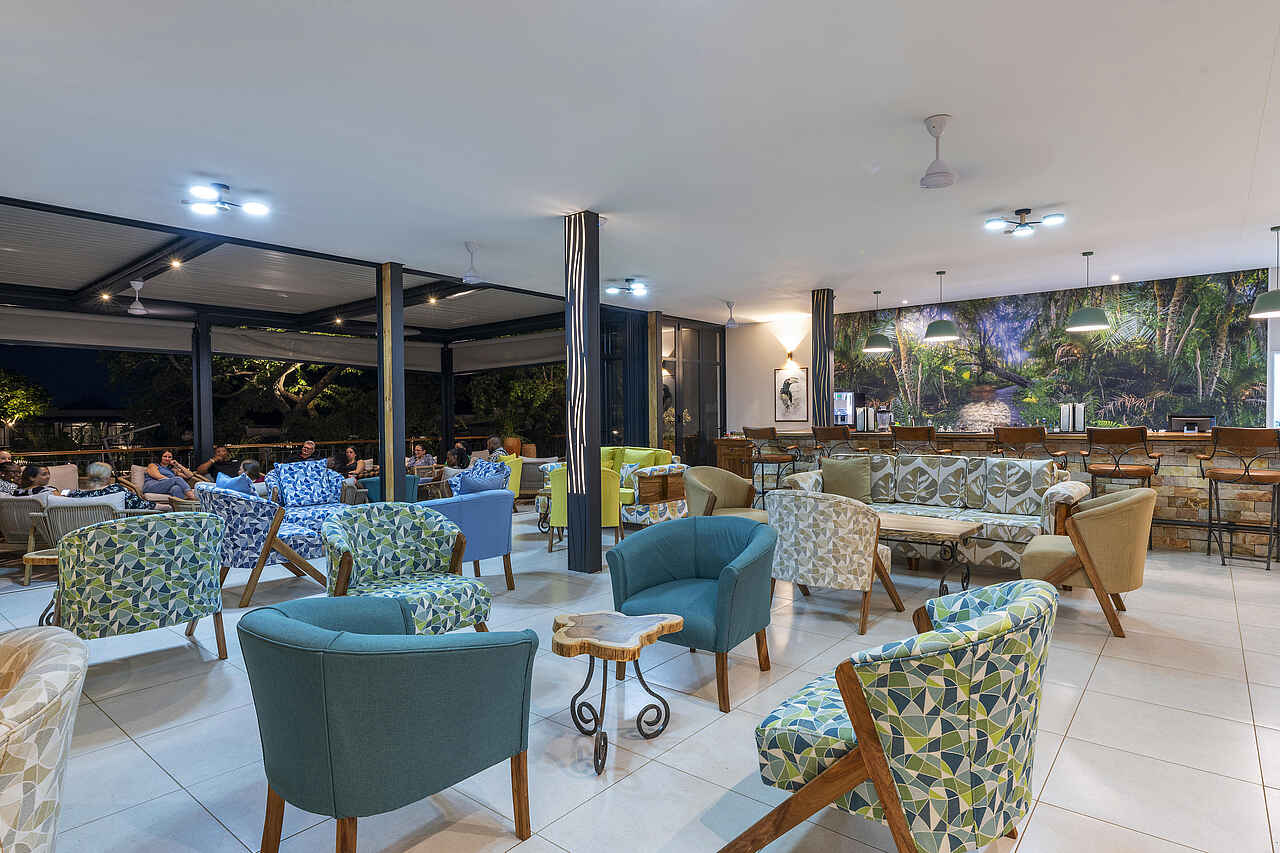 Das Herzstück der Waterfalls Lodge ist der offene, lichtdurchflutete Hauptbereich mit Rezeption, Lounge und Restaurant. Große Fensterfronten schaffen Helligkeit und verbinden Innen- und Außenbereich. Dezente Farben und Naturmaterialien sorgen für eine ruhige, einladende Atmosphäre. Der Swimmingpool mit angrenzendem Liegebereich ist von tropischer Vegetation umgeben und lädt nach einem erlebnisreichen Tag zum Entspannen ein. Ein kleines Spa bietet Massagen und Anwendungen. Kostenfreies WLAN ist in der gesamten Anlage verfügbar.