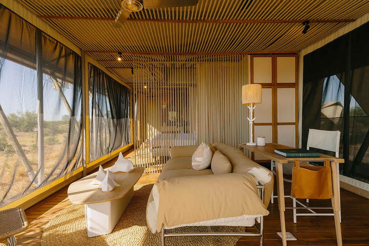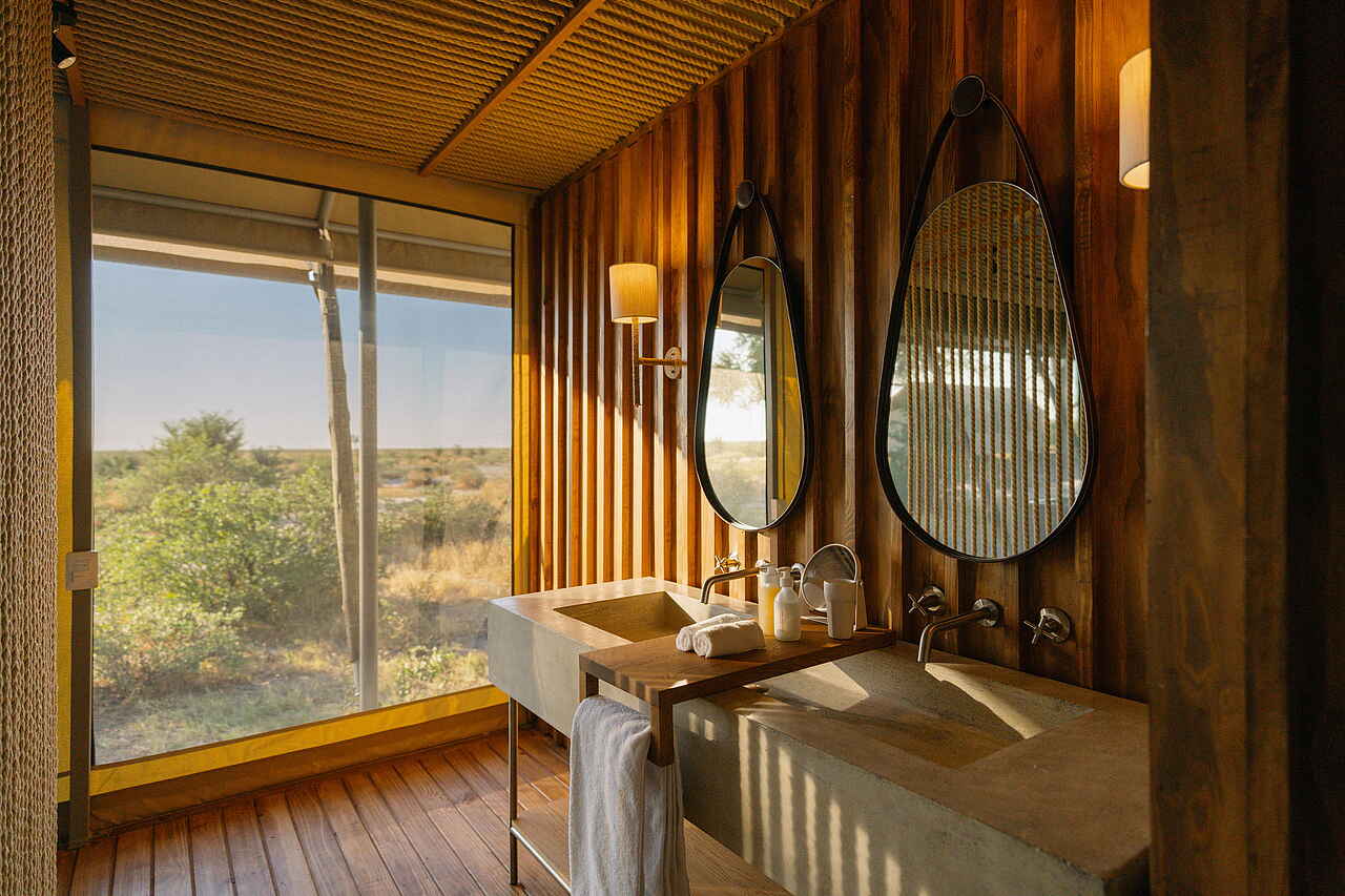 Die Gästeunterkünfte im Wilderness Mokete Camp bestehen aus neun großzügigen Zeltsuiten auf erhöhten Holzplattformen. Vorgezogene Paneele schaffen schattige Bereiche und prägen den markanten Charakter der Suiten. Große Fenster mit Fliegengittern sowie aufrollbare Zeltwände sorgen für Luft und Offenheit. Das besondere Highlight ist das aufschiebbare Dach jeder Zeltsuite. Nachts öffnet sich der Blick direkt vom Bett auf den Sternenhimmel und macht den Aufenthalt unverwechselbar. Die Suiten sind klar und stilvoll eingerichtet mit bequemen Betten, Nachttischen und einer Sitzecke.