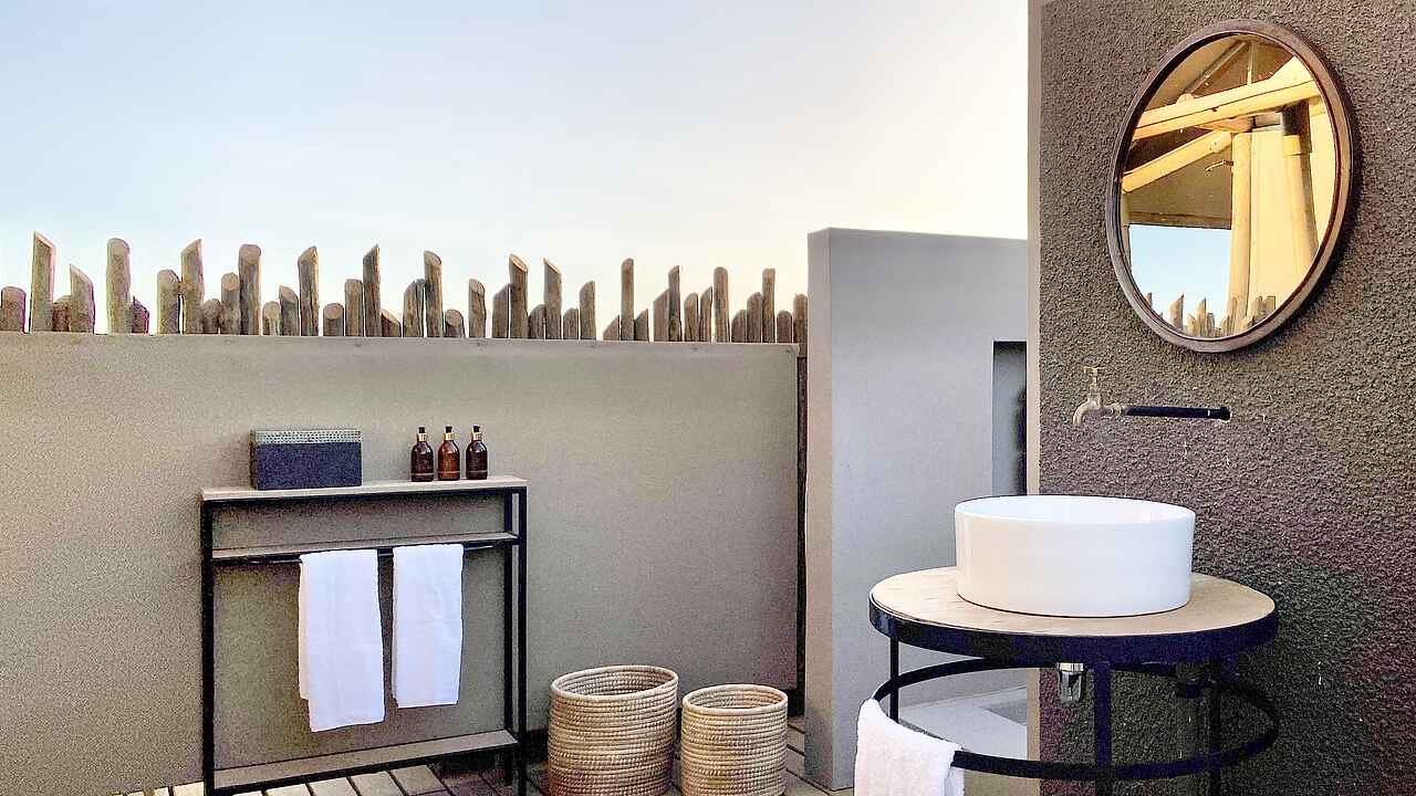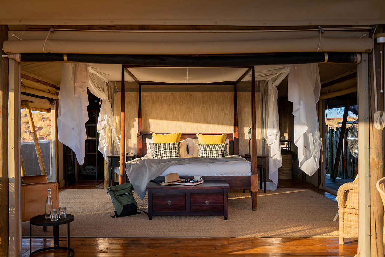 Die sechs Zeltsuiten des Dune Camps stehen auf erhöhten Holzplattformen und eröffnen einen ungestörten Blick auf die weite Dünenlandschaft. Jede Suite ist schlicht, aber geschmackvoll eingerichtet - mit Holzböden, bequemen Betten mit Moskitonetzen, Sitzgelegenheiten, Schreibpulten und En-suite-Badezimmern mit Dusche, Waschbecken und WC. Die Zeltfronten lassen sich weit öffnen, sodass Innen- und Außenbereich optisch ineinander übergehen.