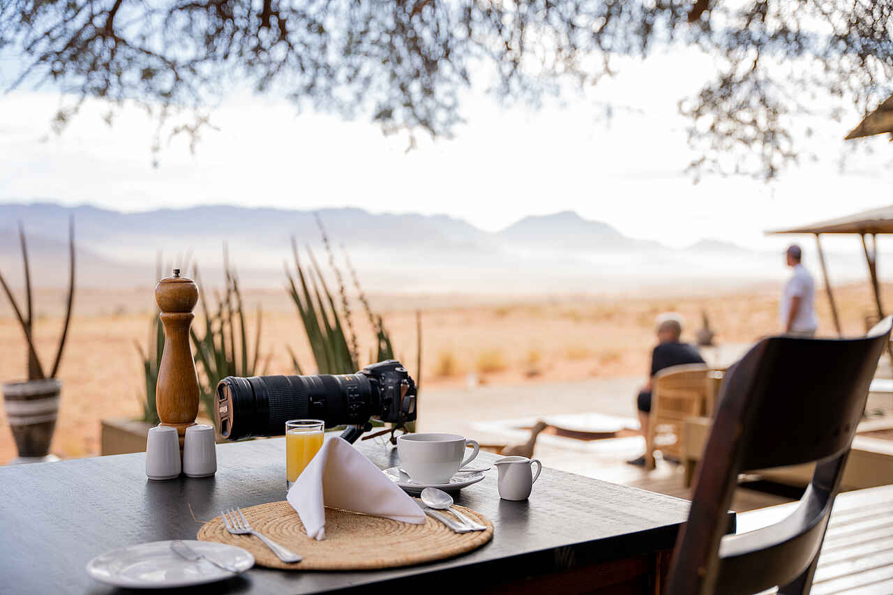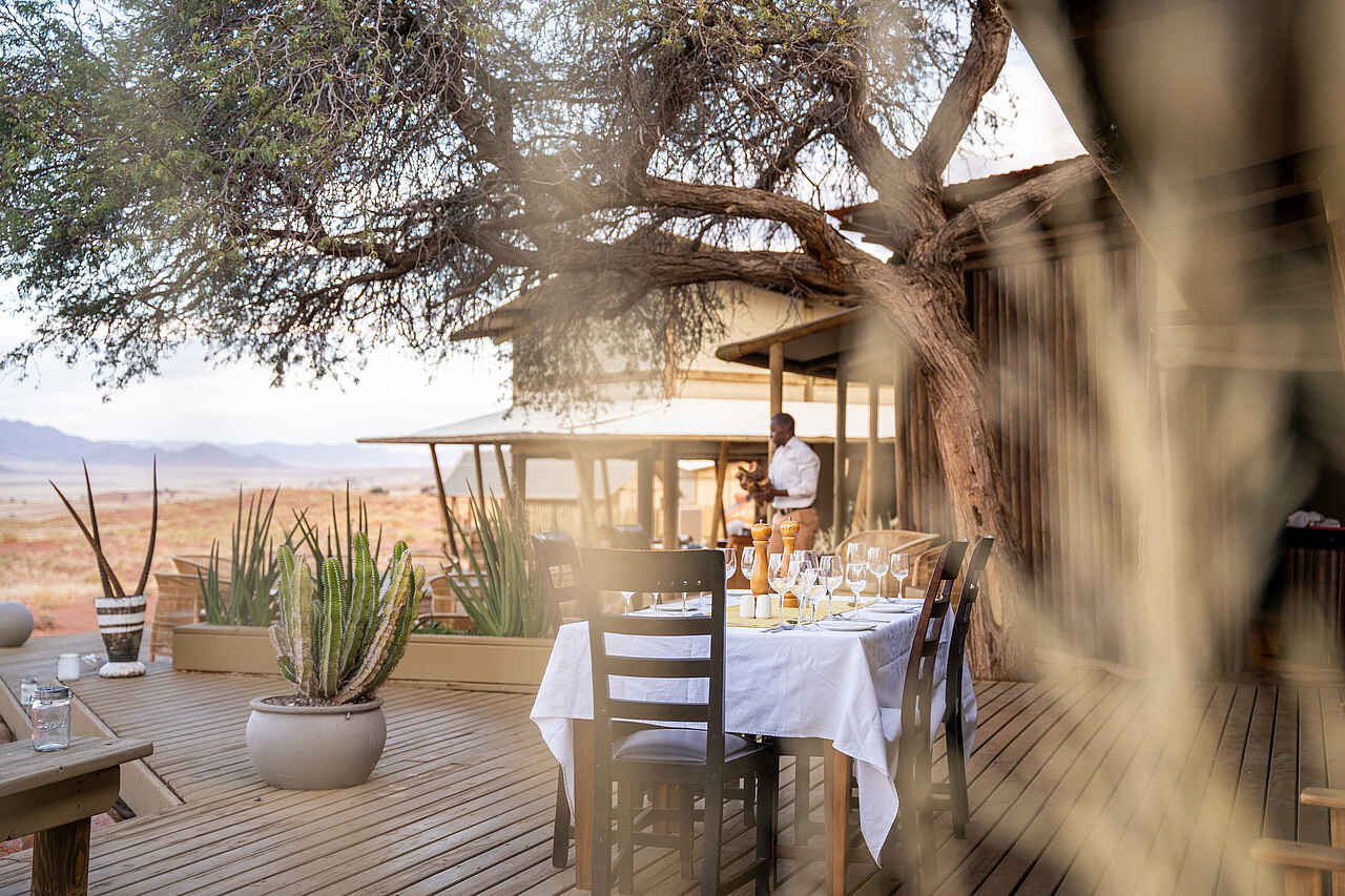 Im Dune Camp wird Wert auf eine frische, abwechslungsreiche Küche gelegt, die je nach Wetter unter freiem Himmel oder im offenen Speisebereich serviert wird. Die Gerichte sind von der internationalen und südwestafrikanischen Küche inspiriert und werden häufig mit regionalen Zutaten zubereitet. Frühstück, Mittag- und Abendessen sind im Aufenthalt enthalten; ebenso Hausgetränke wie Wasser, Tee, Kaffee sowie eine Auswahl alkoholischer Getränke. Auf besondere Ernährungswünsche wird gerne Rücksicht genommen - am besten vorab anmelden.