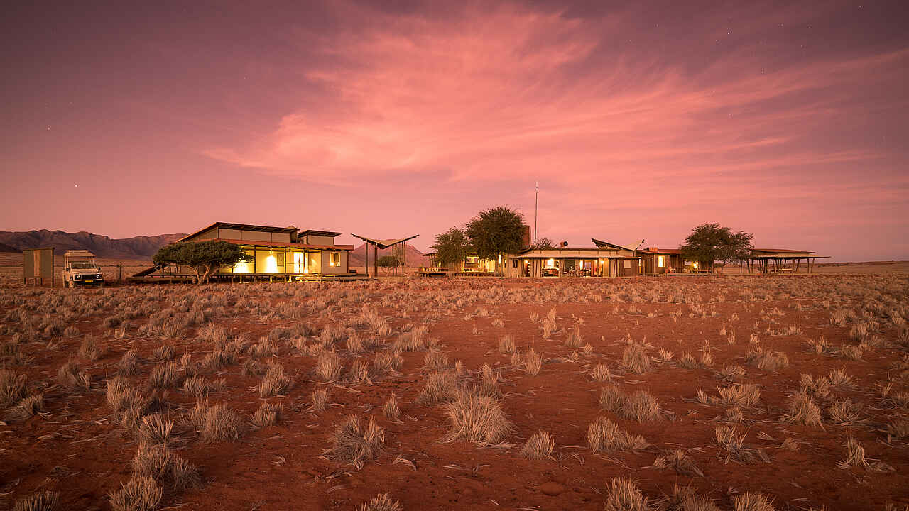 Wolwedans Plains Camp befindet sich im NamibRand Naturreservat im Süden Namibias, südlich von Sossusvlei. Die abgelegene Lage inmitten der Wüste bietet weite Ausblicke auf Dünen, Ebenen und Berge und ermöglicht ein intensives Naturerlebnis fernab von touristischen Hauptwegen.