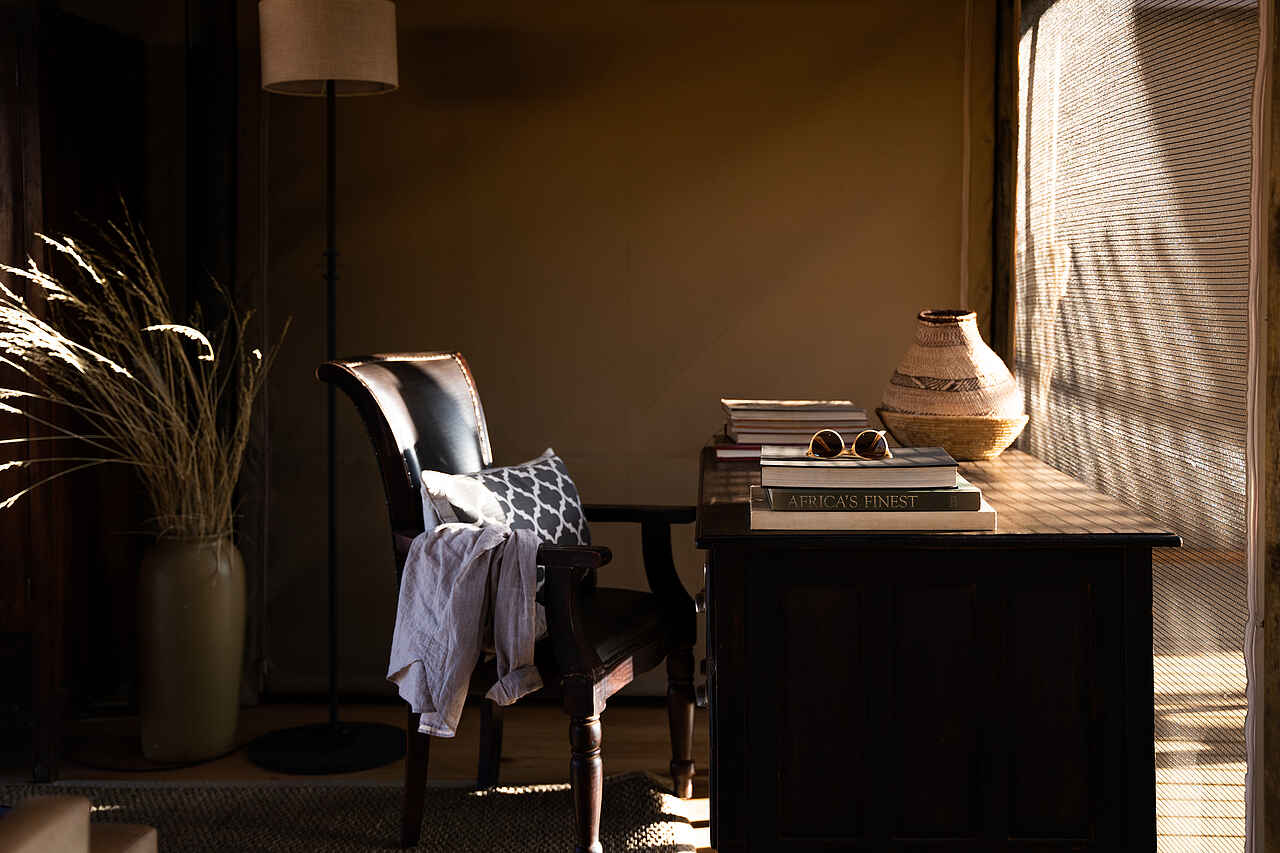 Das Plains Camp bietet vier separate Schlafzimmer - zwei großzügige Master-Suiten und zwei etwas kleinere Zimmer - die alle sorgfältig gestaltet und mit viel Liebe zum Detail eingerichtet sind. Bequeme Betten, klassische Ledersessel und Holzmöbel schaffen eine warme, wohnliche Atmosphäre. Jedes Zimmer öffnet sich zu einer privaten Veranda mit Liegestühlen und freiem Blick über die Weite der Namib. Direkt davor liegen die typischen "Wolwedans Chillers" - kleine, eisgekühlte Tauchbecken, die während der heißen Tageszeit für willkommene Abkühlung sorgen.