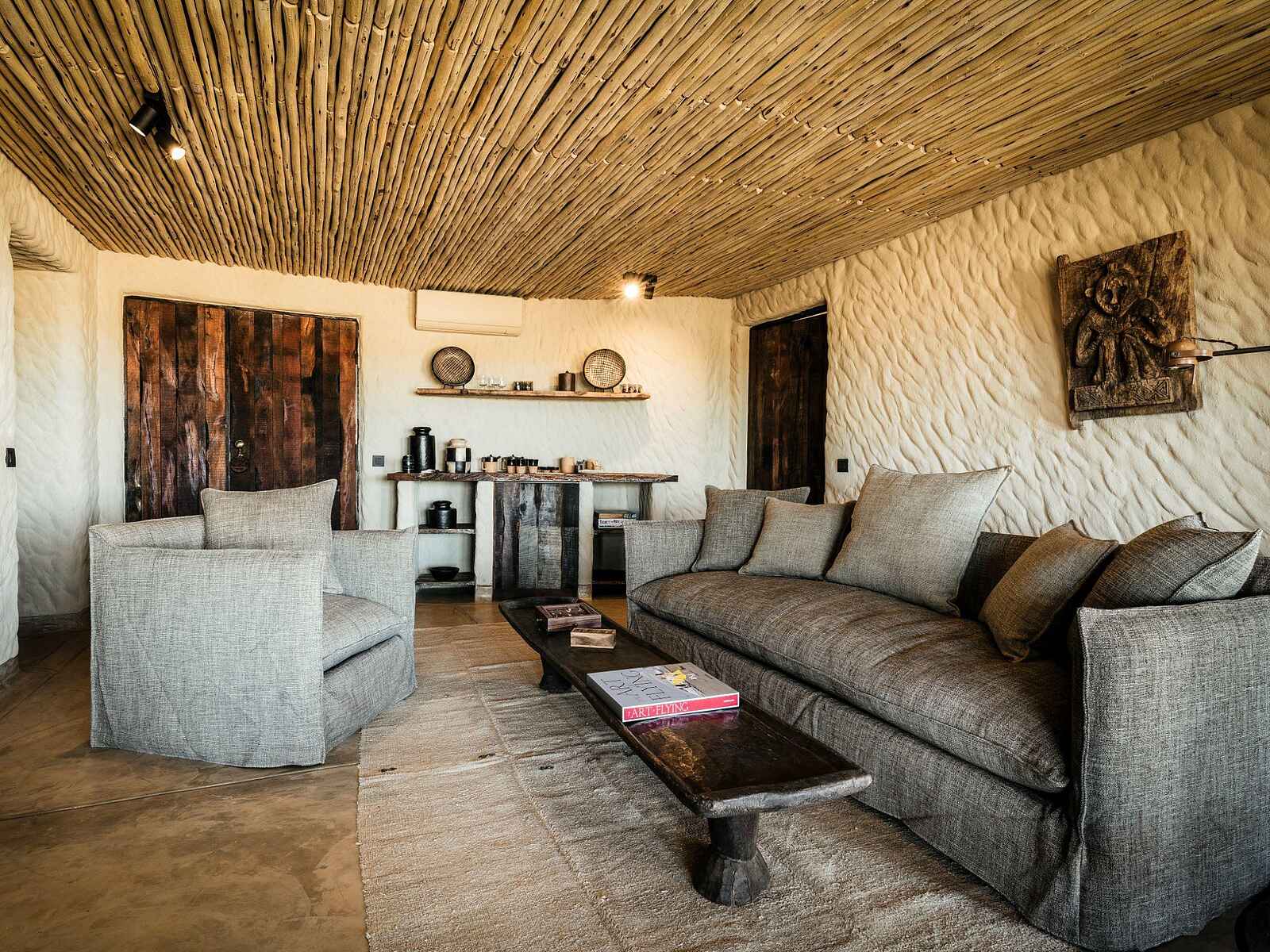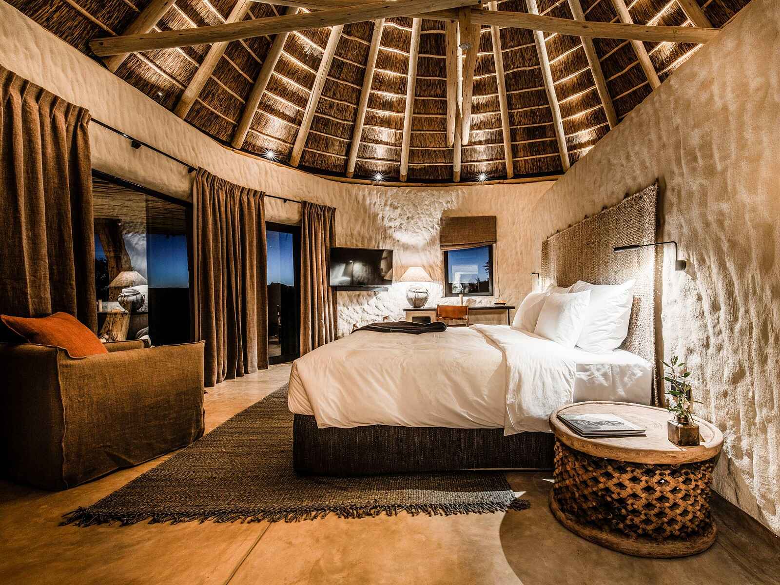 Die 10 luxuriösen Rundhütten im Zannier Hotels Omaanda sind eine harmonische Fusion aus traditionellem Owambo-Stil und modernem Komfort. Jede Rundhütte mit ihrem handgefertigten Strohdach und warmen, erdigen Farben, spiegelt die Schönheit der namibischen Natur wider und bietet gleichzeitig ein behagliches Zuhause auf Zeit. Jede Hütte ist mit einem gemütlichen, zweiseitigen Kamin ausgestattet, der nicht nur für wohlige Wärme im Schlafzimmer sorgt, sondern auch beim Baden in der versenkten Badewanne einen zauberhaften Blick auf das prasselnde Feuer bietet. Die En-suite-Badezimmer sind mit einer großzügigen Regendusche und Doppelwaschtischen ausgestattet, die den luxuriösen Komfort unterstreichen.