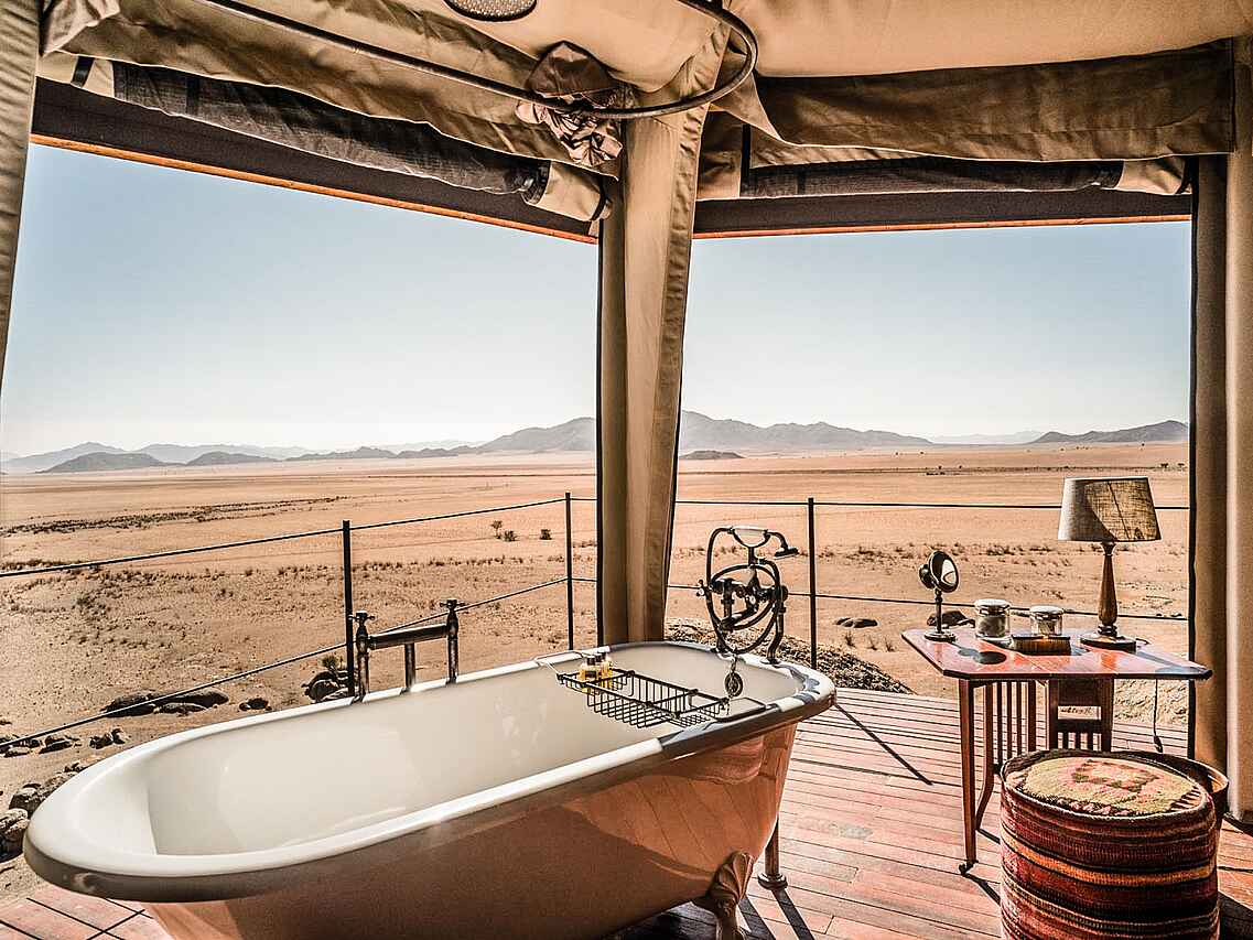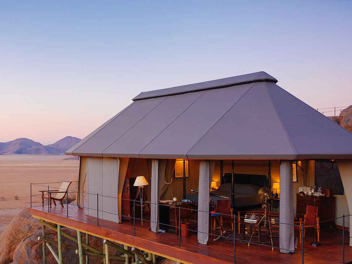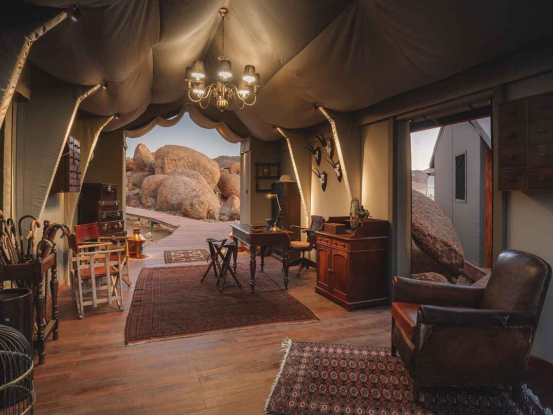 Die zehn Zeltsuiten im Stil einer britischen Expedition der 1920er Jahre sind mit liebevoll ausgewählten Antiquitäten eingerichtet und bieten durch große, aufrollbare Leinwandöffnungen einen weiten Blick auf die Wüste. Jede Suite verfügt über ein Himmelbett, einen Schreibtisch, einen Sitzbereich und ein Teleskop zur Erkundung der Umgebung. Für modernen Komfort sorgen kostenfreies WLAN, eine Nespresso-Maschine, ein Wasserkocher, ein Safe sowie eine individuell regulierbare Klimaanlage und Heizung.