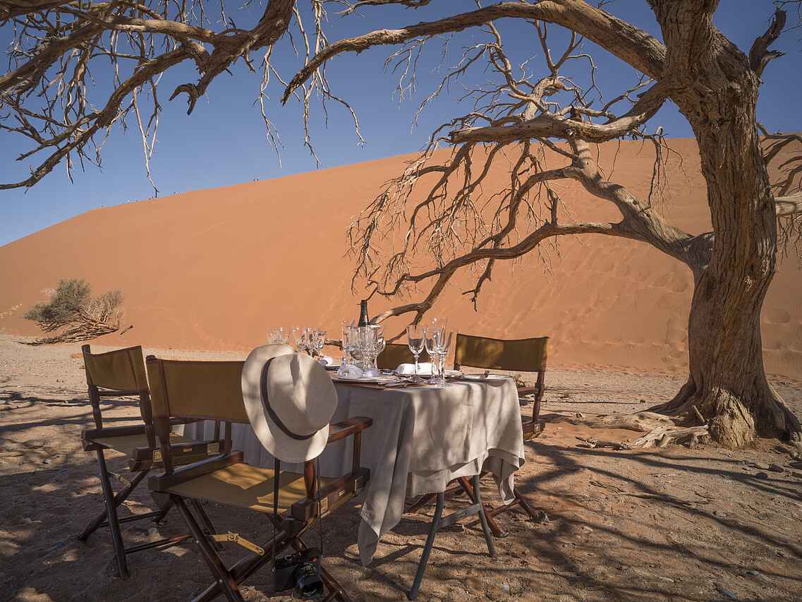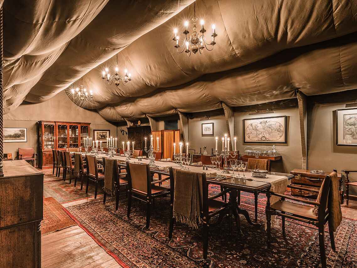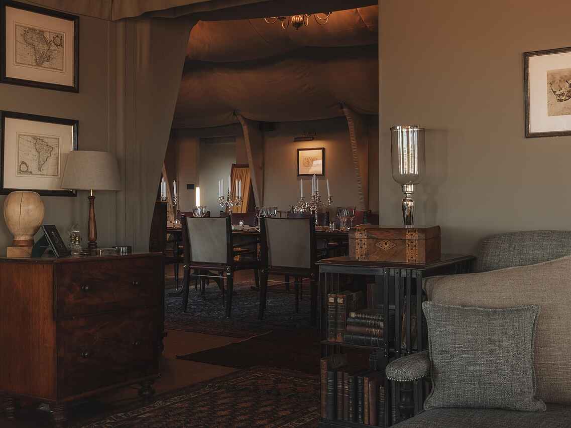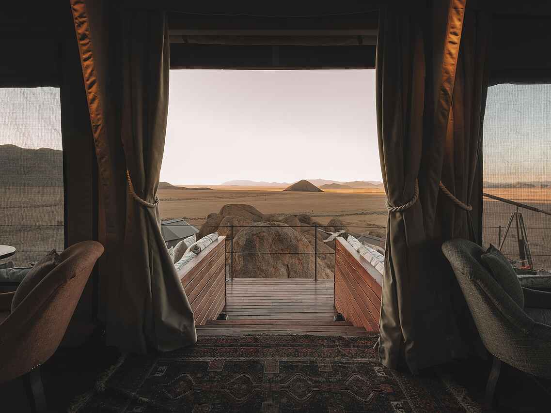 Die zehn Zeltsuiten im Stil einer britischen Expedition der 1920er Jahre sind mit liebevoll ausgewählten Antiquitäten eingerichtet und bieten durch große, aufrollbare Leinwandöffnungen einen weiten Blick auf die Wüste. Jede Suite verfügt über ein Himmelbett, einen Schreibtisch, einen Sitzbereich und ein Teleskop zur Erkundung der Umgebung. Für modernen Komfort sorgen kostenfreies WLAN, eine Nespresso-Maschine, ein Wasserkocher, ein Safe sowie eine individuell regulierbare Klimaanlage und Heizung.