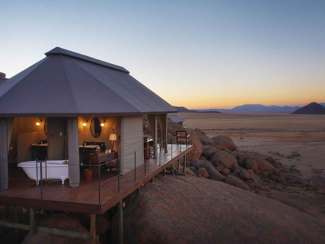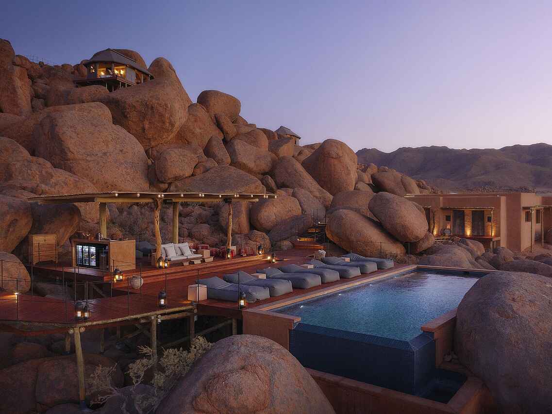 Zannier Hotels Sonop befindet sich im südlichen Teil der Namib-Wüste in Namibia. Die Lodge ist im Stil einer britischen Kolonialexpedition der 1920er Jahre gestaltet und auf massiven Granitfelsen errichtet, was ihr ein einzigartiges Ambiente verleiht. Die zehn exklusiven Zeltsuiten eröffnen weite Panoramablicke auf die endlose Wüste und schaffen eine Atmosphäre von Ruhe und Weite. Tagsüber laden geführte Reitausflüge, E-Fatbike-Touren, Wanderungen und Heißluftballonfahrten dazu ein, die faszinierende Landschaft aus verschiedenen Perspektiven zu erkunden. Mit Einbruch der Dunkelheit verwandelt sich Sonop in ein magisches Refugium: Open-Air-Kinoabende und Sternenbeobachtungen unter dem funkelnden afrikanischen Himmel machen die Abende zu einem unvergesslichen Erlebnis.
