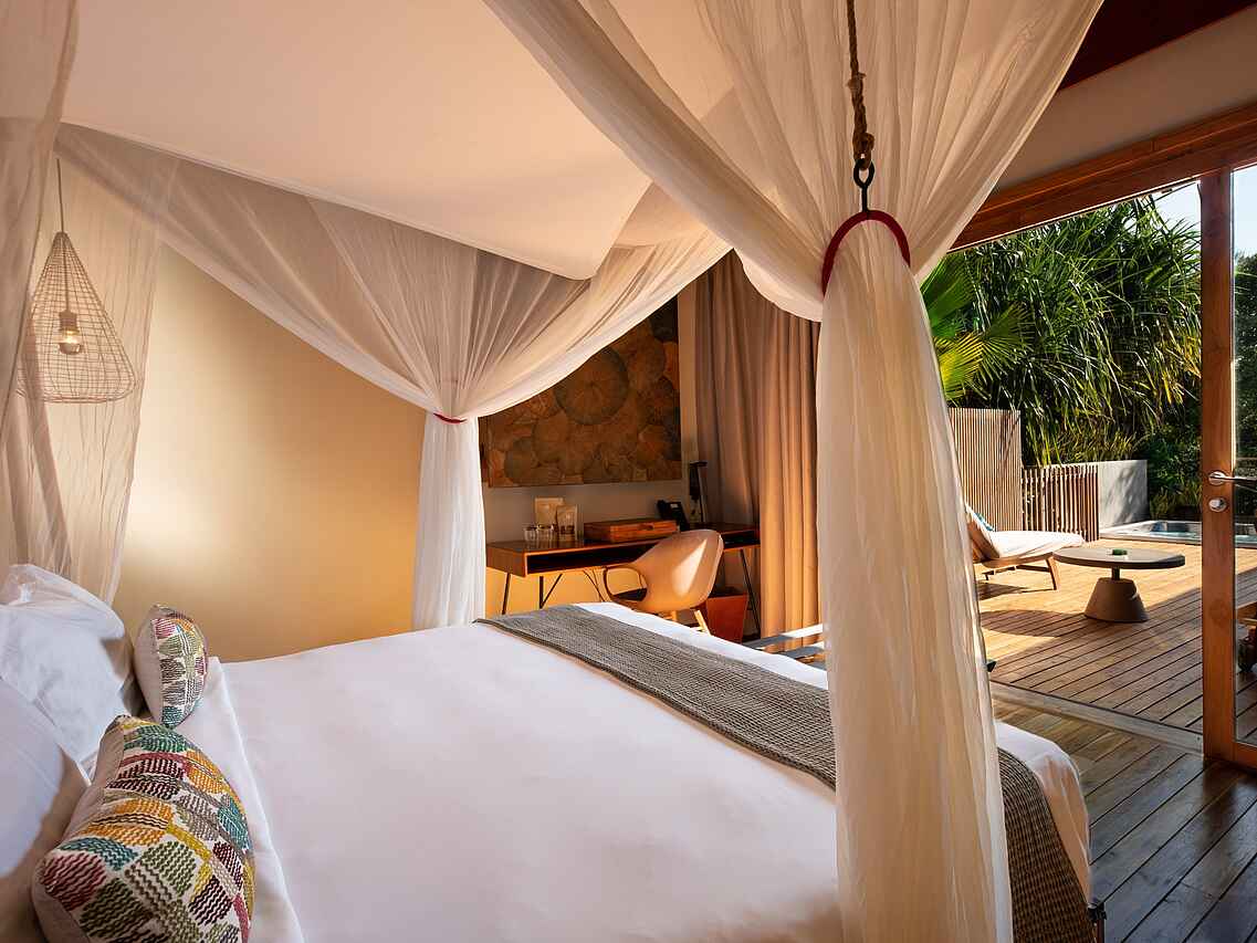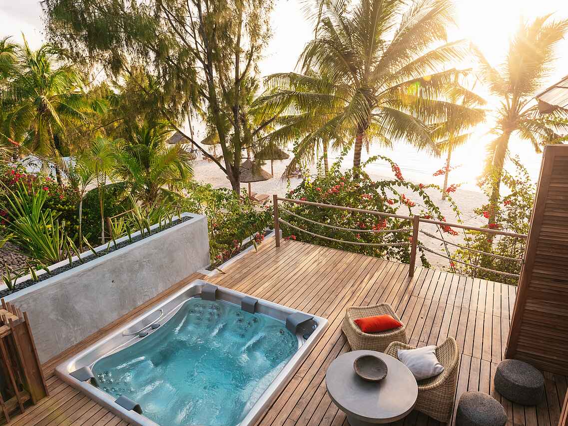 Die Jacuzzi Suiten bieten 132 m² Wohnraum, aufgeteilt auf ein separates Schlaf- und Wohnzimmer und Terrasse. Durch ein zusätzliches Schlafsofa ist hier Platz für eine dritte Person. Eigener Jacuzzi, Badewanne und Außendusche dienen zur Entspannung. Gartensicht und direkter Zugang zum Strand sind weitere Merkmale dieser Suiten.