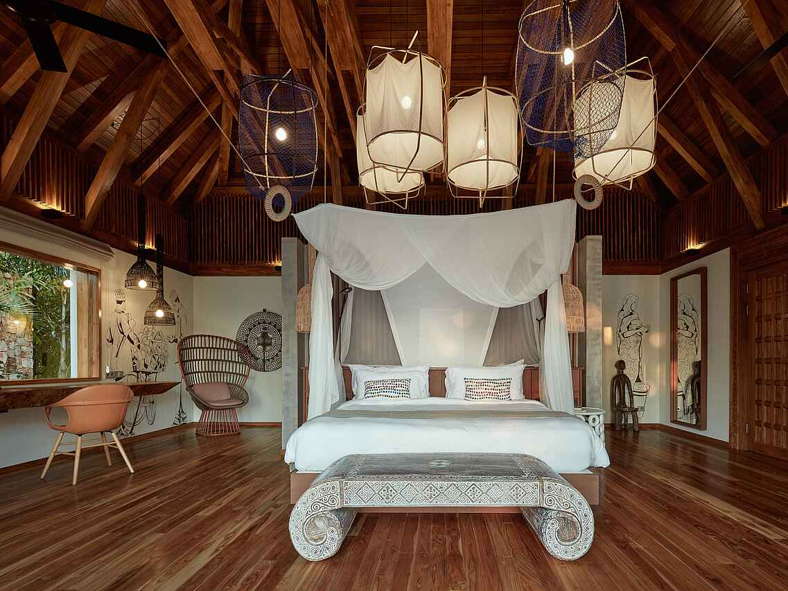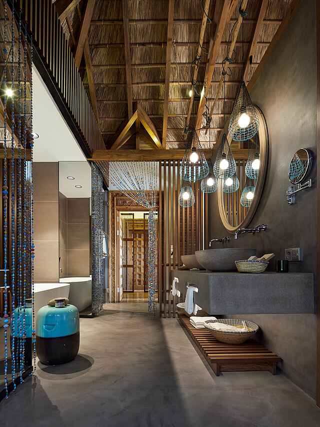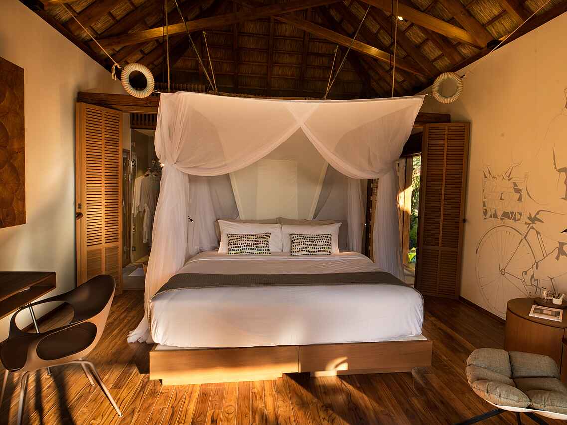 Die 56 Bungalows, Suiten und Villen liegen inmitten eines tropischen Gartens und erinnern von der Platzierung her an ein typisches Dorf. Die Unterkünfte sind das Ebenbild des veredelten und unkomplizierten Luxus und schaffen es, erfolgreich exquisites und modernes Design mit traditionellem, afrikanischem Flair zu kombinieren. Regionale Kunstwerke, nachhaltige Materialien, braunes Holz und klassische Farben prägen das Innere. Zu den Standardeinrichtungen jeder Zimmerkategorie zählen Moskitonetz, Klimaanlage, Deckenventilator, Wlan, Safe, Fernseher, Minibar, Kaffee-/Teezubereiter, Bademantel, Slipper und eigenes Bad mit Innendusche.